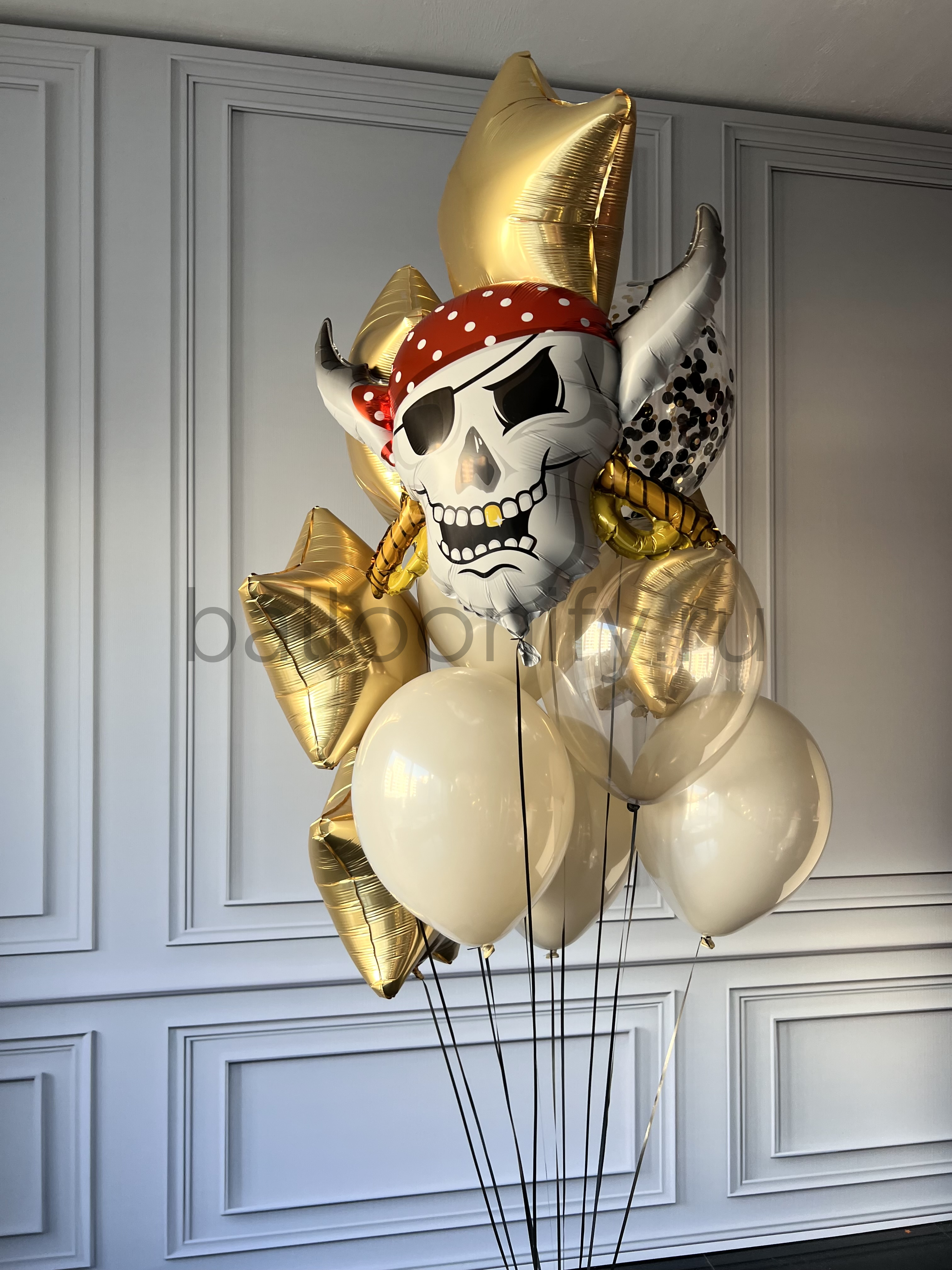 Яркая пиратская композиция из воздушных шаров для дня рождения. Центральным элементом композиции является шар в виде черепа в красной бандане, а также золотые и кремовые шары. Сочетание насыщенных цветов, тематических фигур и озорных деталей создаёт атмосферу настоящего пиратского приключения — идеально для детского праздника! 🌟