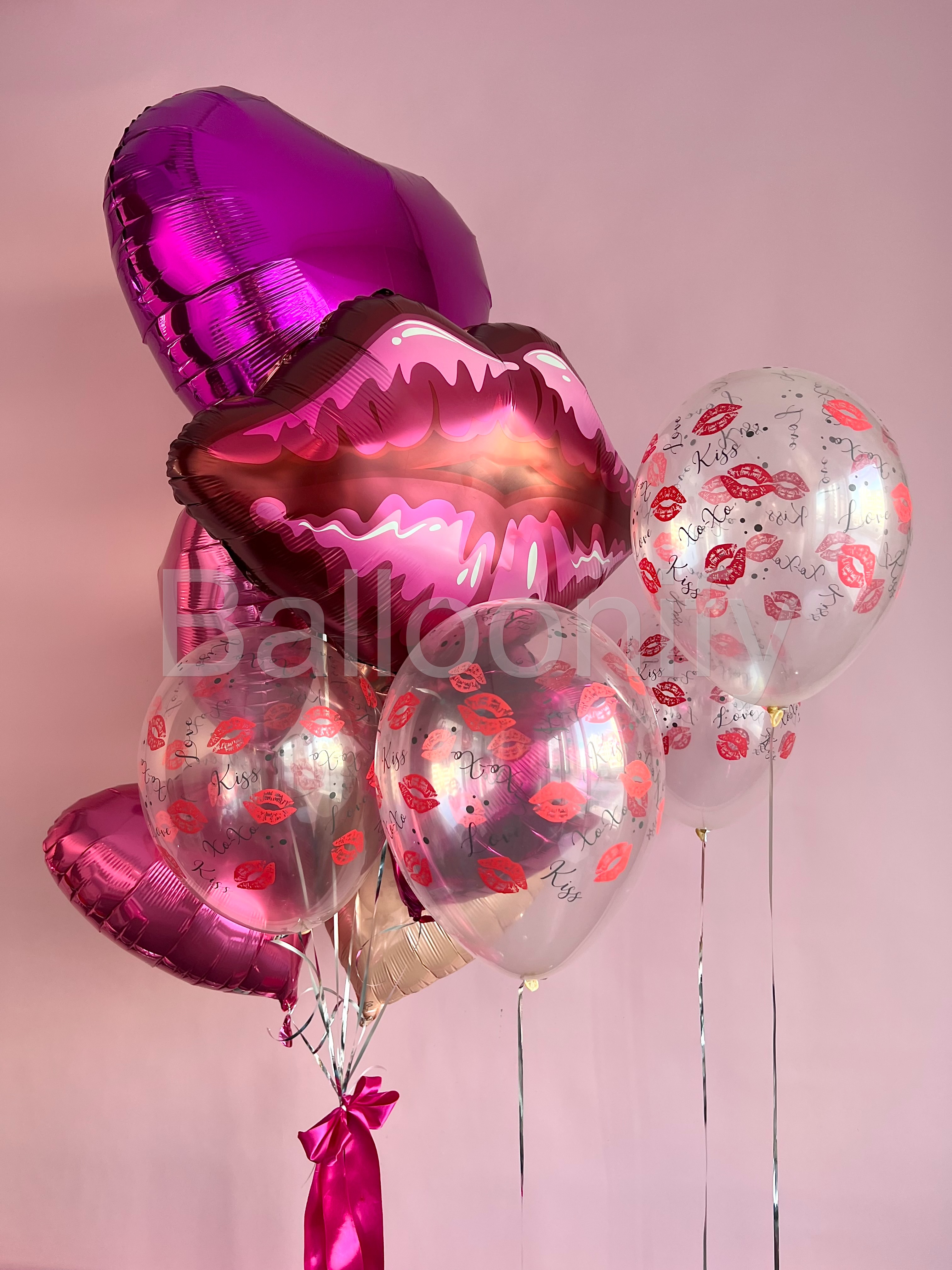 Очаровательная композиция из гелиевых шаров в романтичной розово-фиолетовой гамме: блестящие фольгированные шары в форме сердца и губ, дополненные прозрачными шарами с принтом в виде ярких поцелуев и надписями «Kiss» и «Love». Эффектный акцент — крупный шар в виде приоткрытых губ, который придаёт ансамблю игривый и страстный характер. Идеальный выбор для признания в любви, романтического свидания или празднования Дня святого Валентина. 🌟
