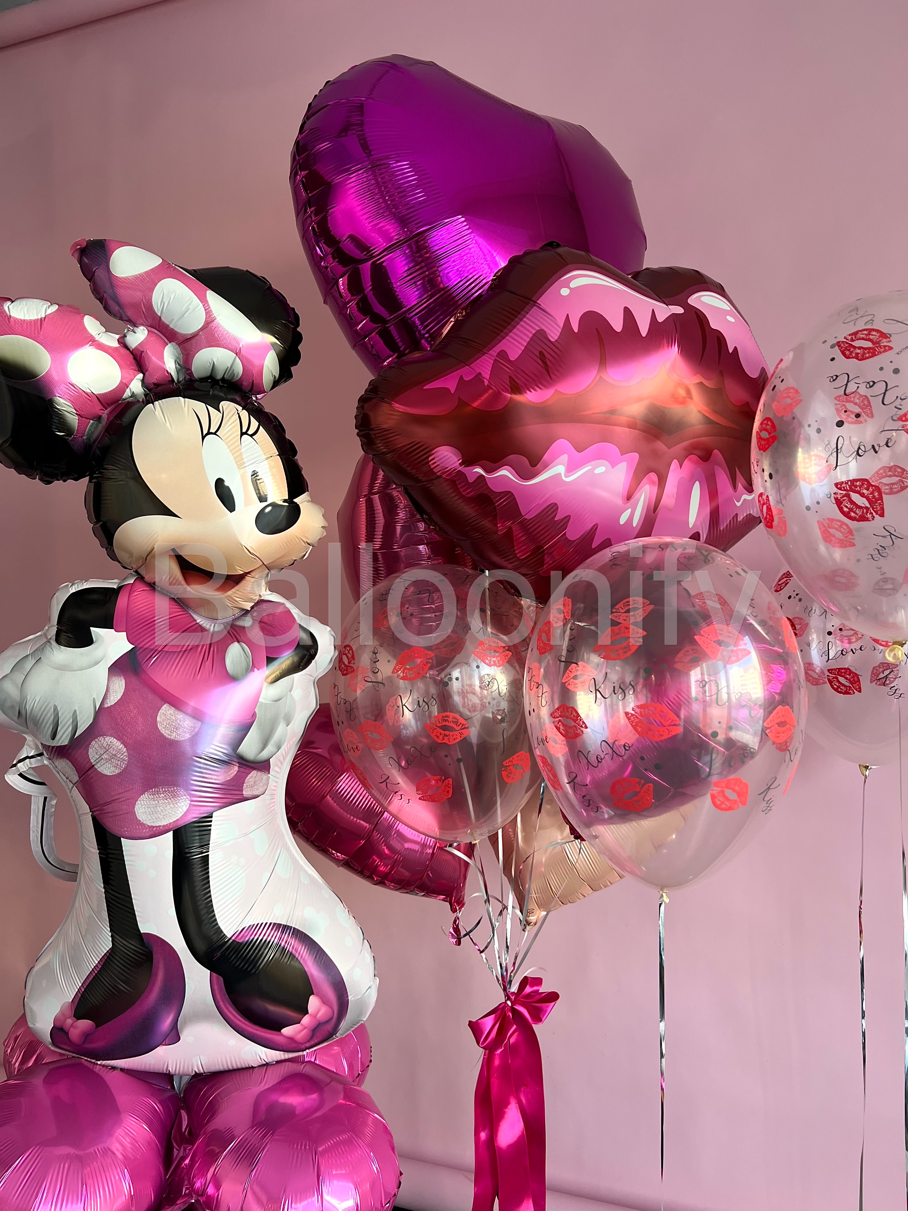 Яркая и игривая композиция из воздушных шаров: очаровательная фигура Минни Маус в фирменном розовом наряде с горошком, блестящие фиолетовые шары в форме сердца и губ, а также прозрачные шары с милыми отпечатками поцелуев и надписями «Love» и «Kiss». Сочные розовые и фиолетовые оттенки создают праздничное настроение — идеально для детского дня рождения или весёлого торжества. 🌟