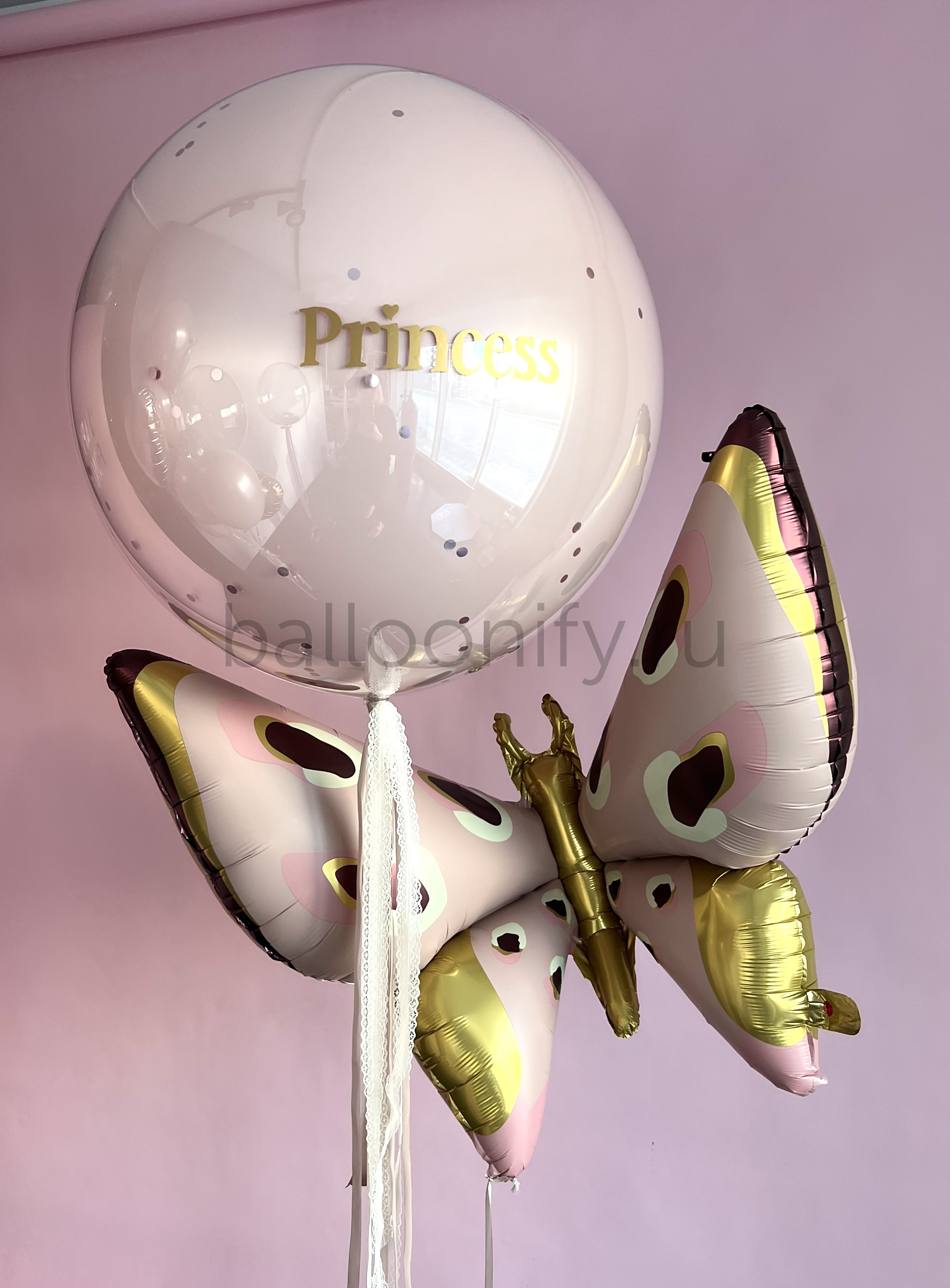 Элегантная композиция из гелиевых шаров в нежных пастельных тонах с акцентом на большом шаре с золотой надписью «Princess», дополненная шарами-бабочками — идеальный декор для детского праздника в стиле «принцесса». 🌟