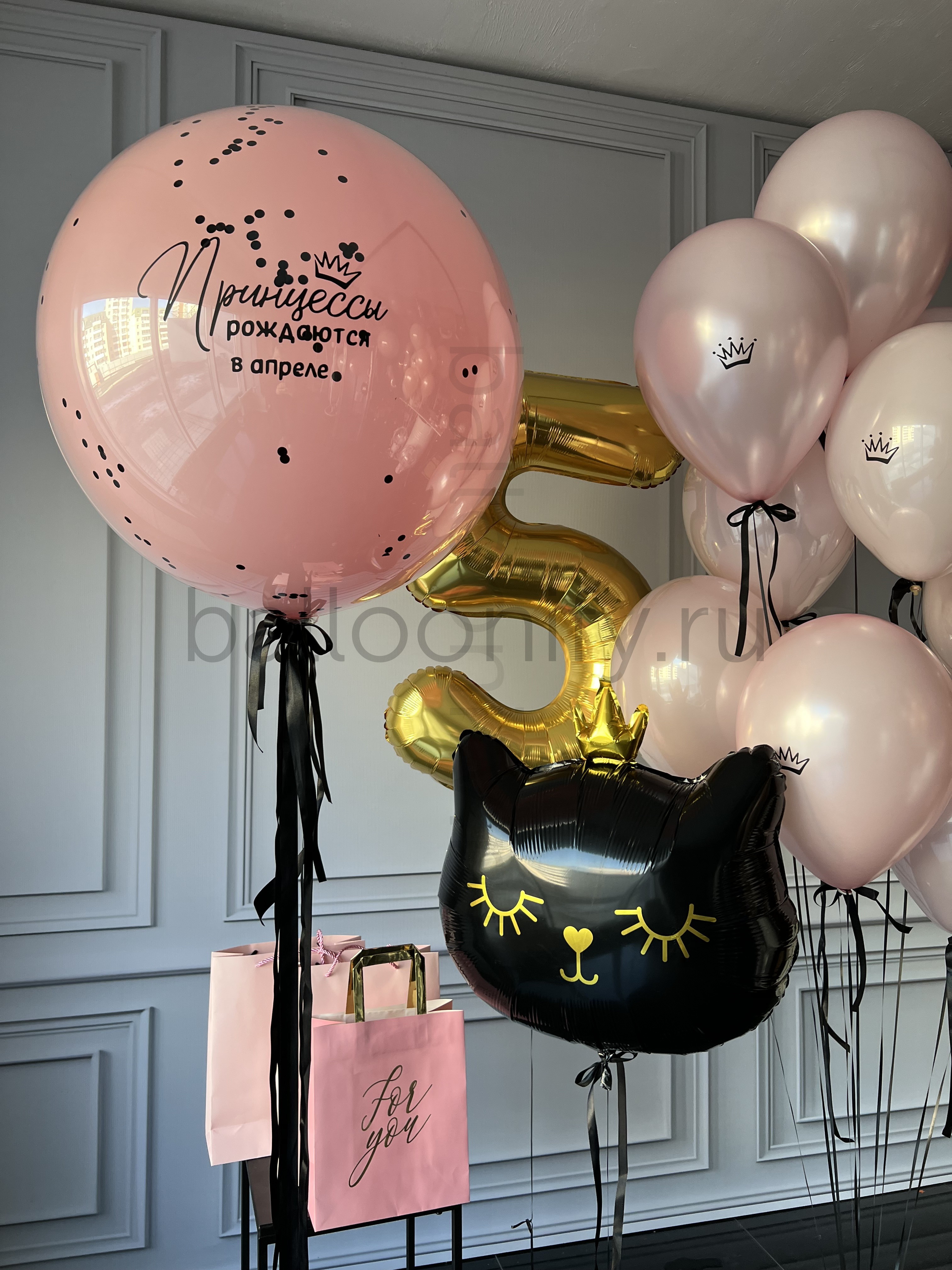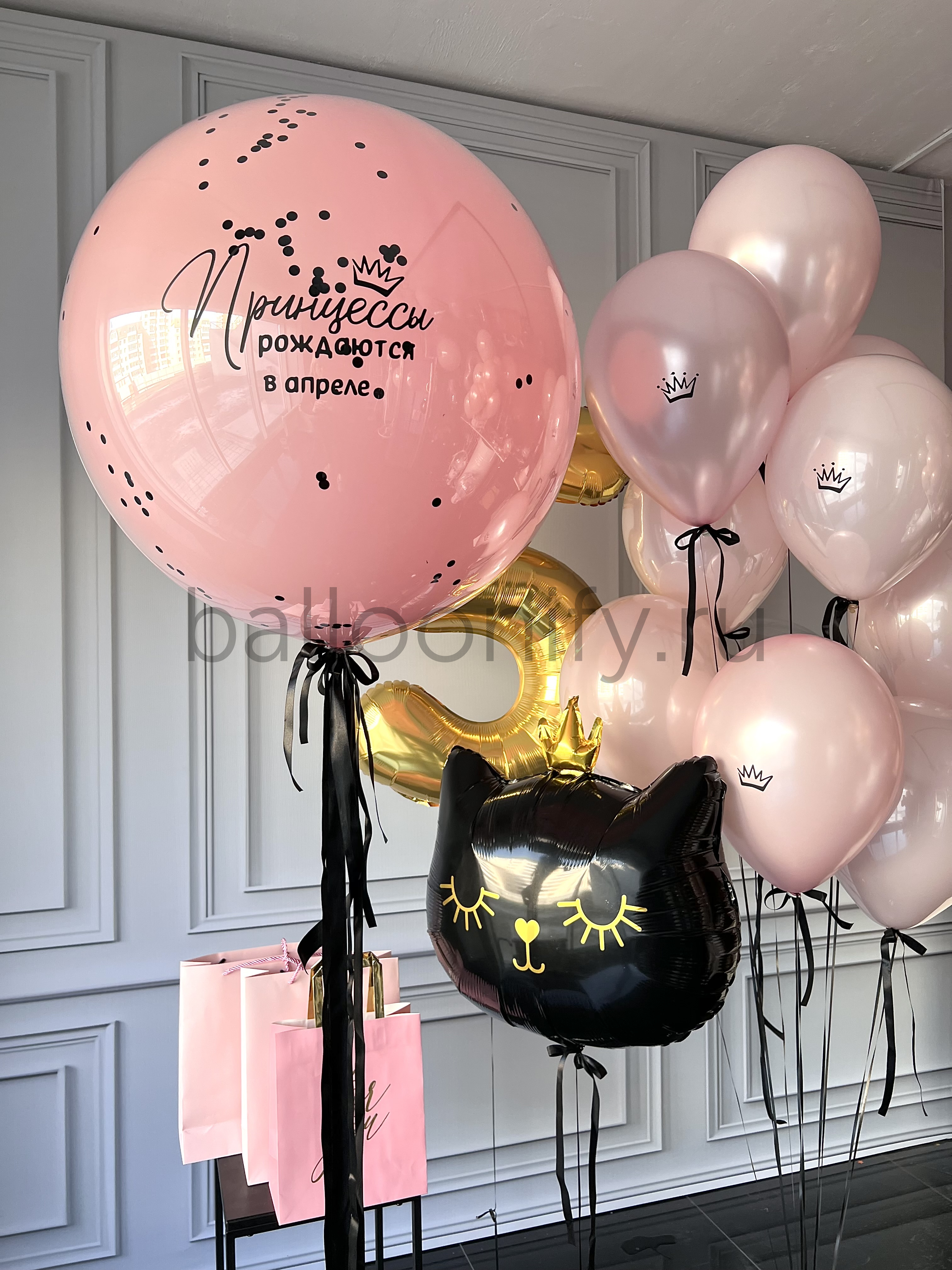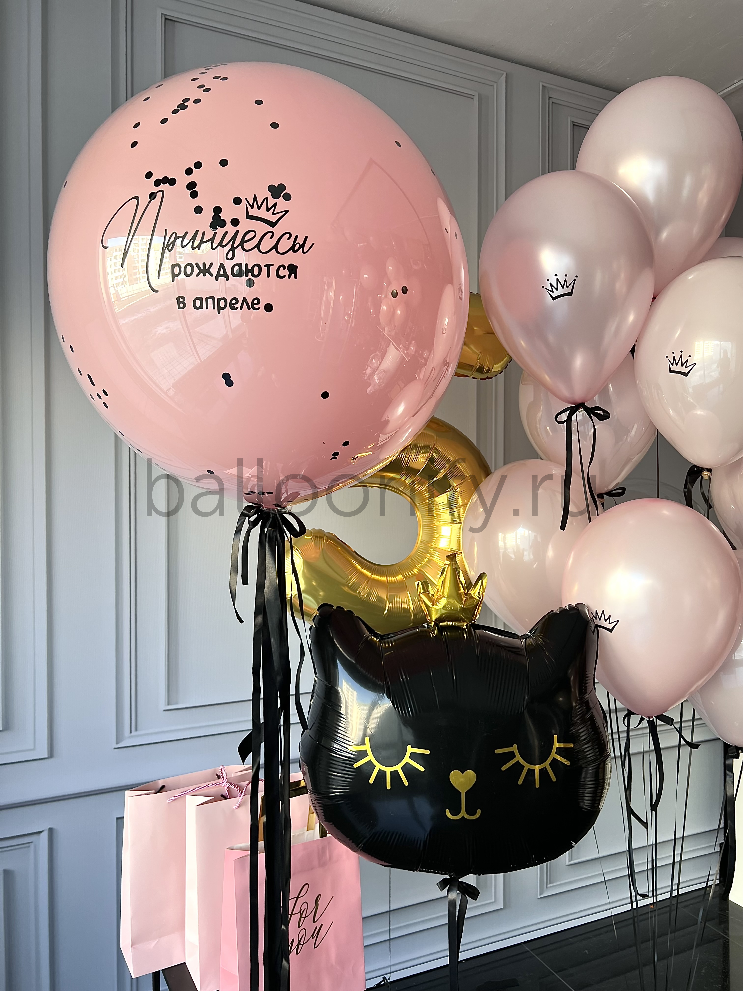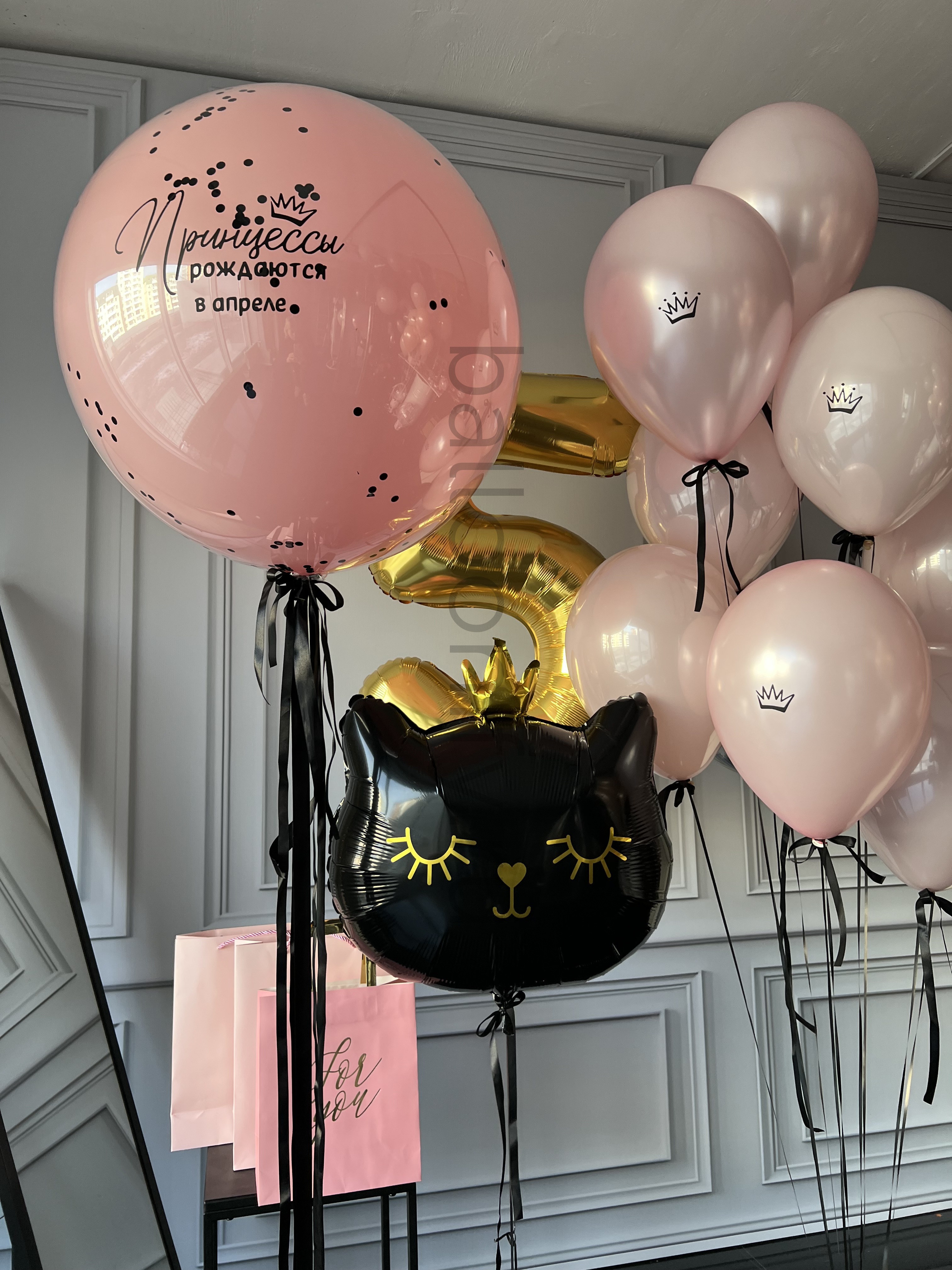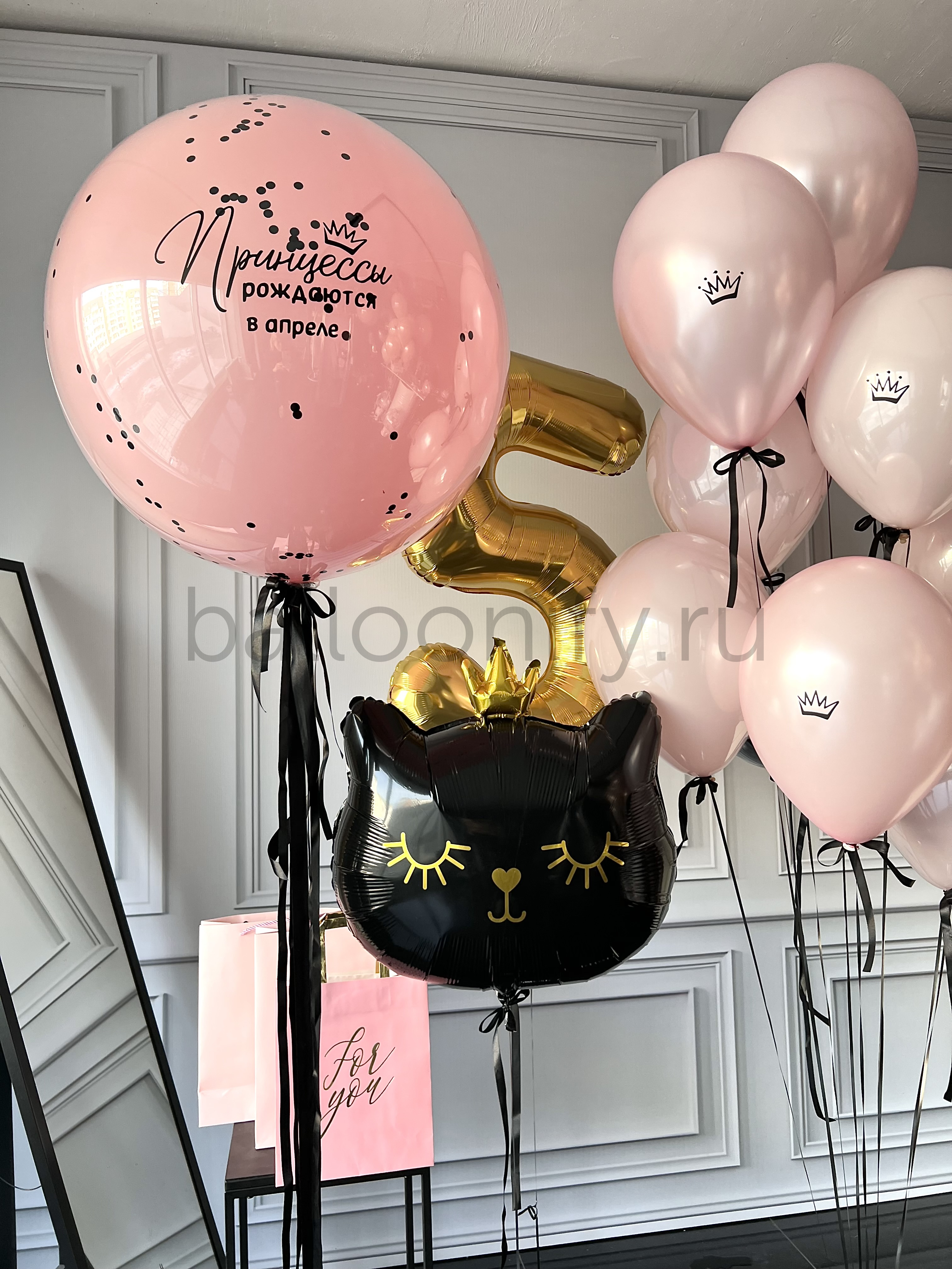 Изящная композиция из гелиевых шаров в нежно-розовой гамме с чёрными лентами: крупный шар с надписью «Принцессы рождаются в апреле», золотой шар-цифра «5», воздушный шар в виде чёрной кошечки с золотой короной и милыми деталями, а также несколько розовых шаров с коронами. Создаст волшебную атмосферу на детском празднике! 🌟