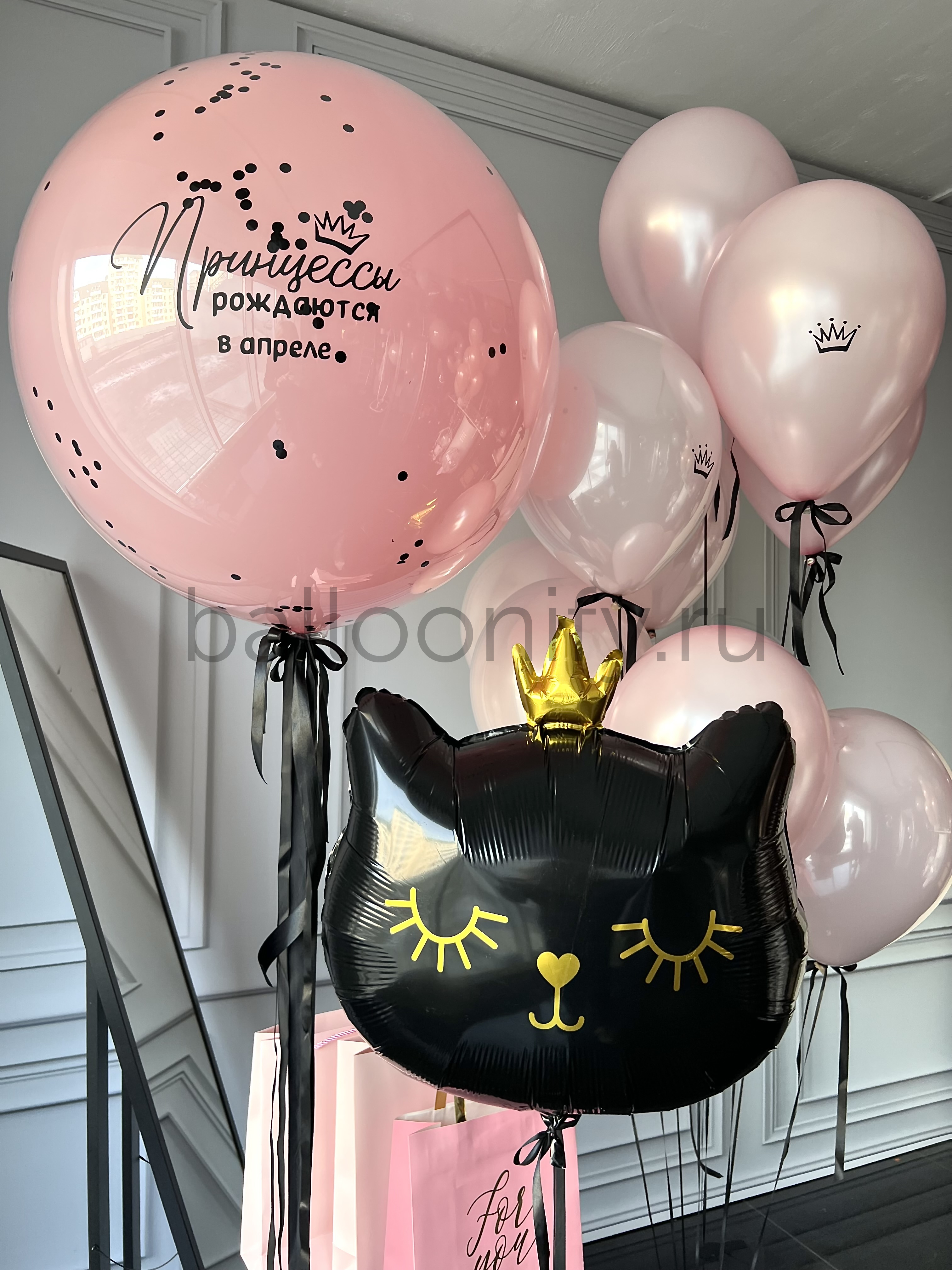 Изящная композиция из гелиевых шаров для маленькой принцессы: крупный розовый шар с надписью «Принцессы рождаются в апреле» и чёрными декоративными точками, несколько нежно-розовых шаров с миниатюрными коронами, а также эффектный чёрный шар в форме кошачьей мордочки с золотой короной и жёлтыми деталями. 🌟