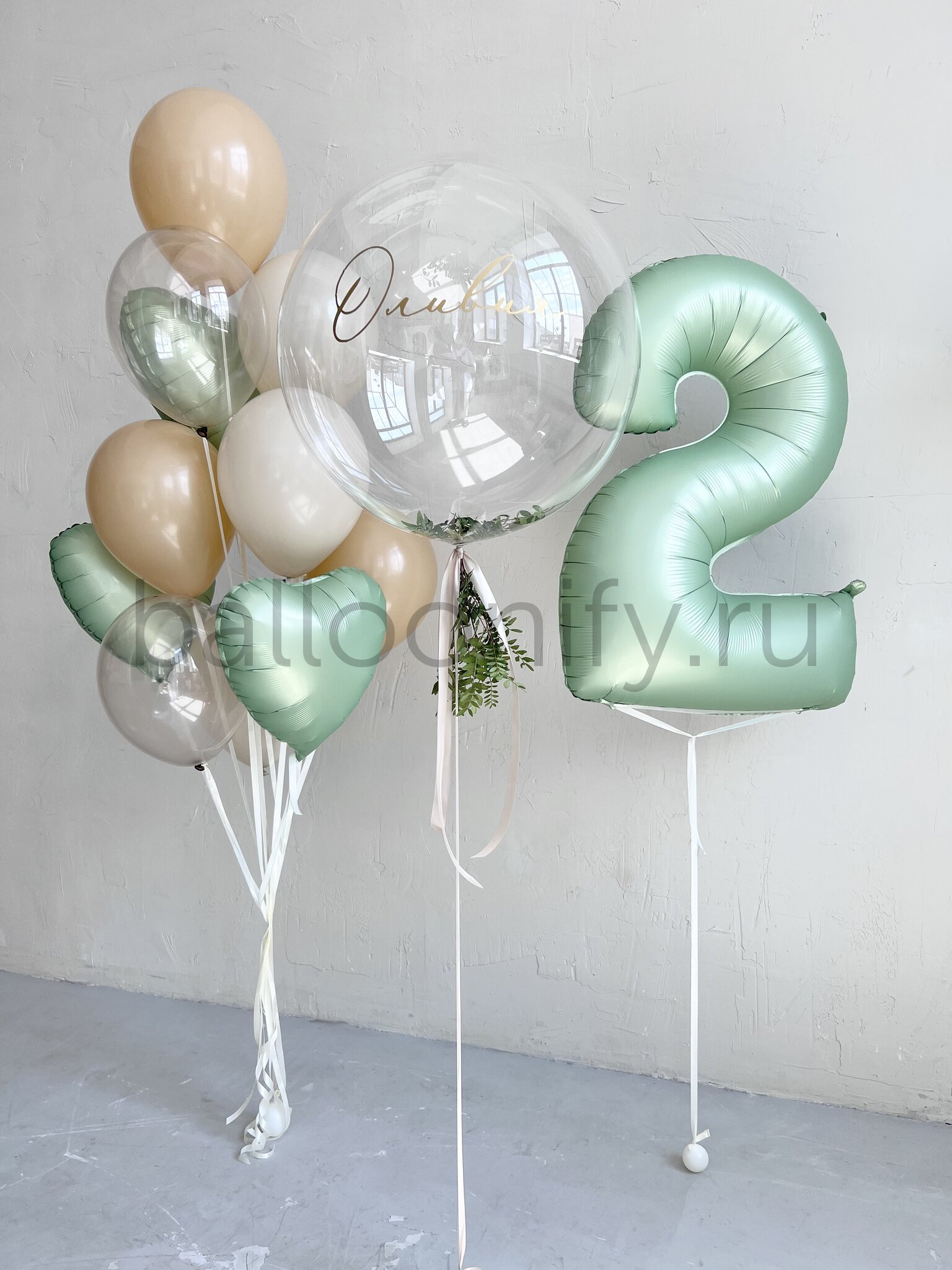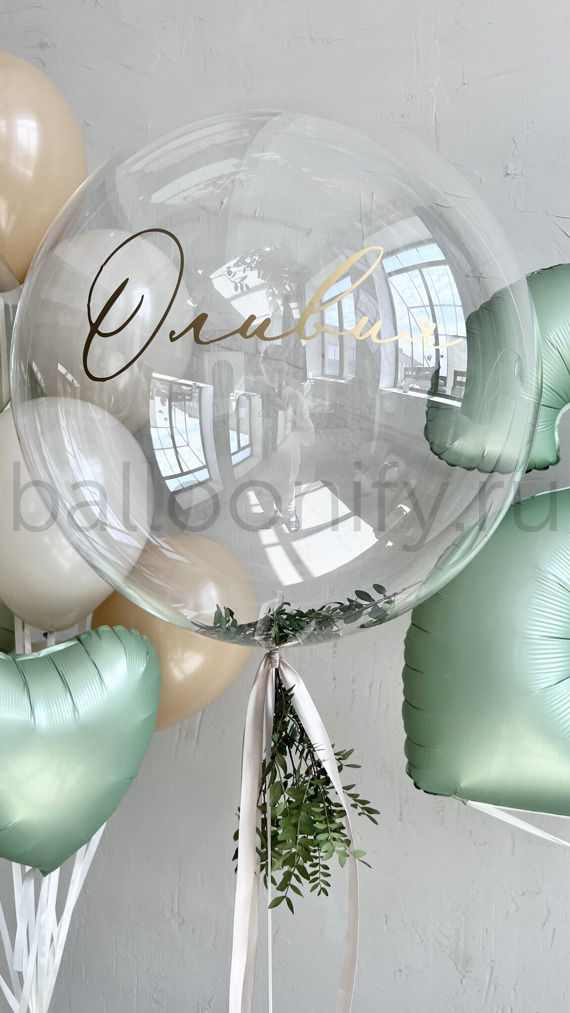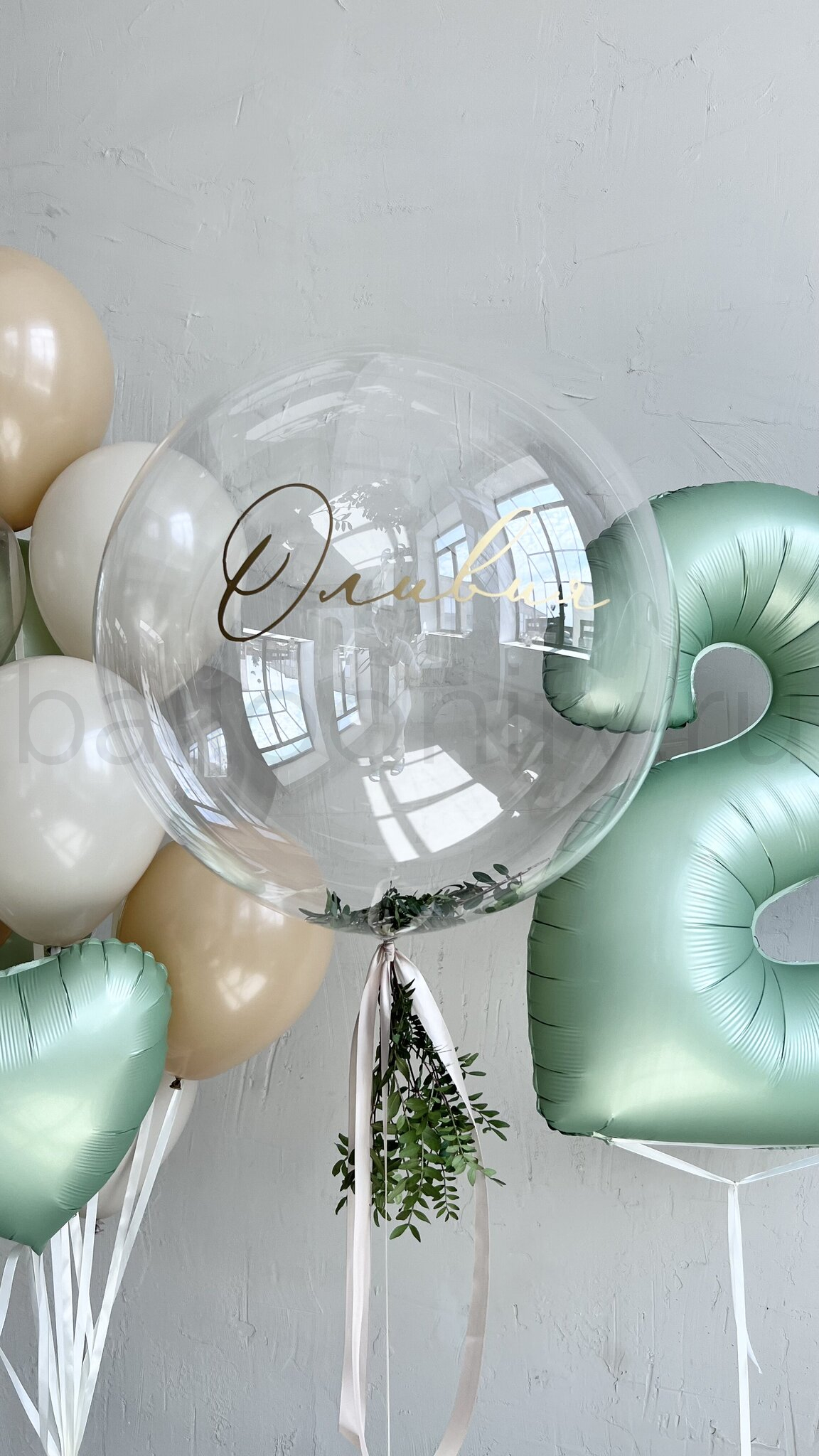 Представляем элегантную композицию воздушных шаров для особых событий. Центральный элемент – впечатляющий прозрачный шар баблс 61 см с возможностью нанесения индивидуальной надписи. Декор из зелени придает композиции природную естественность. Сочетание природных оттенков создает атмосферу уюта и торжественности.