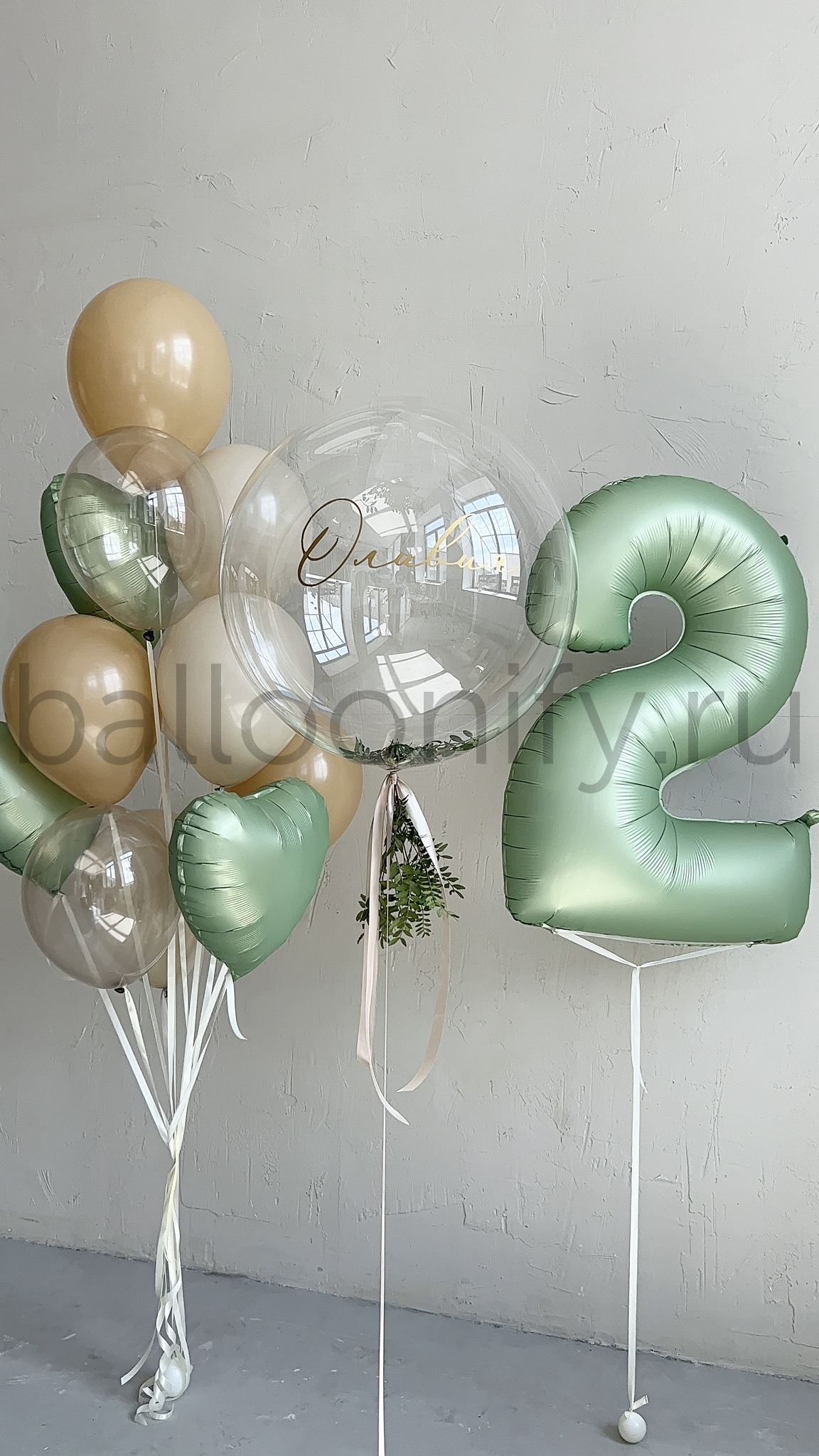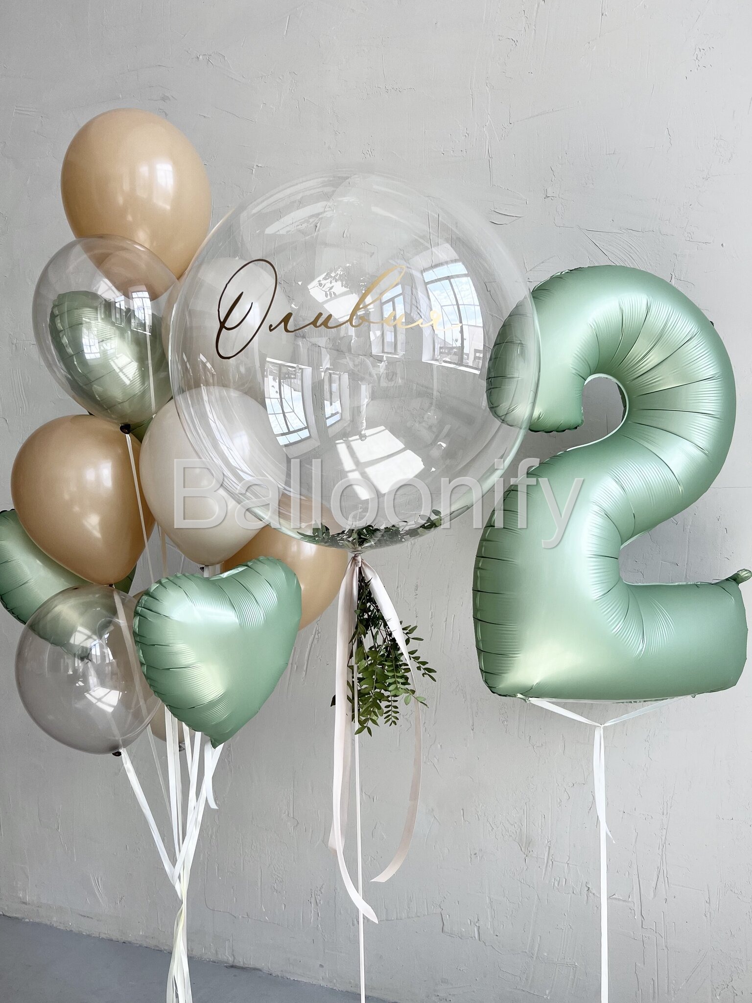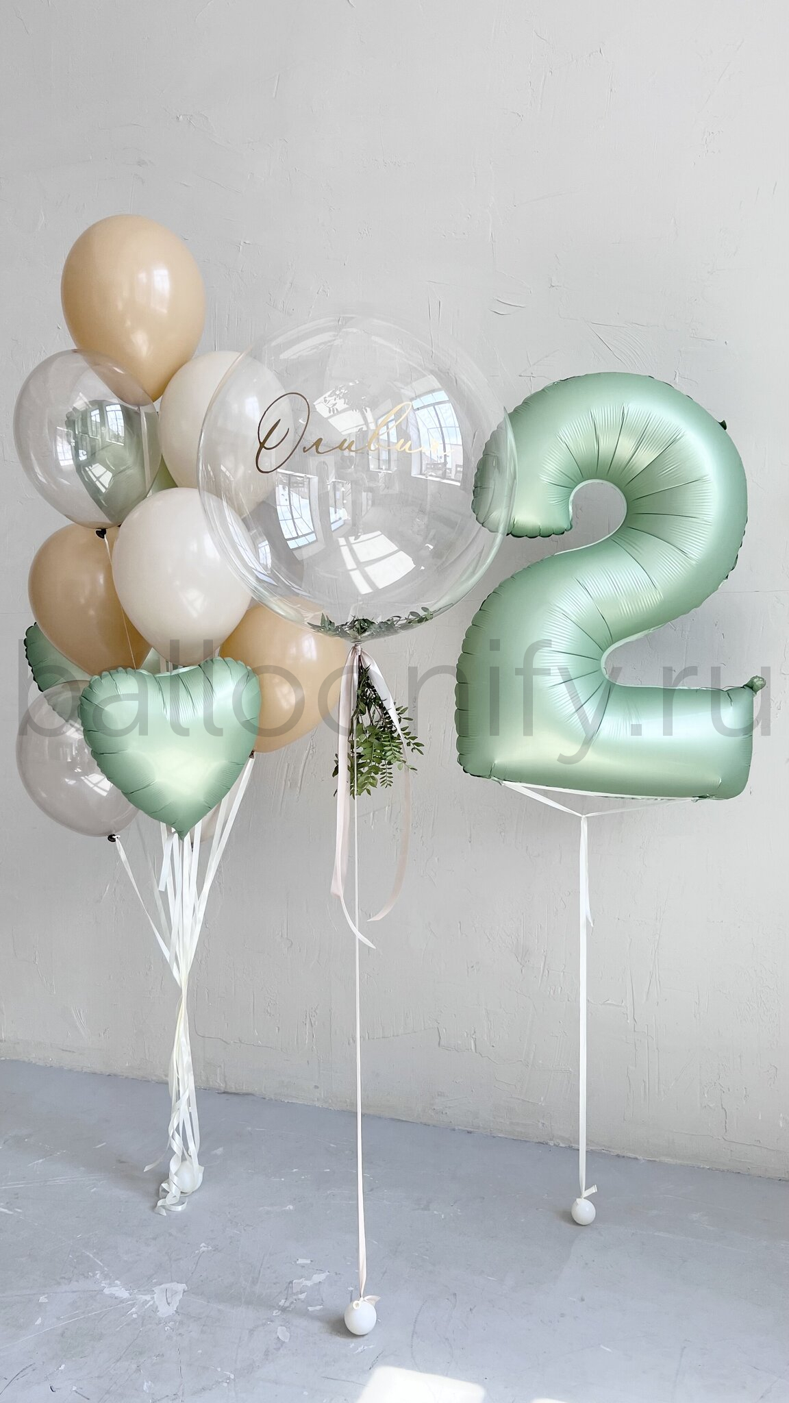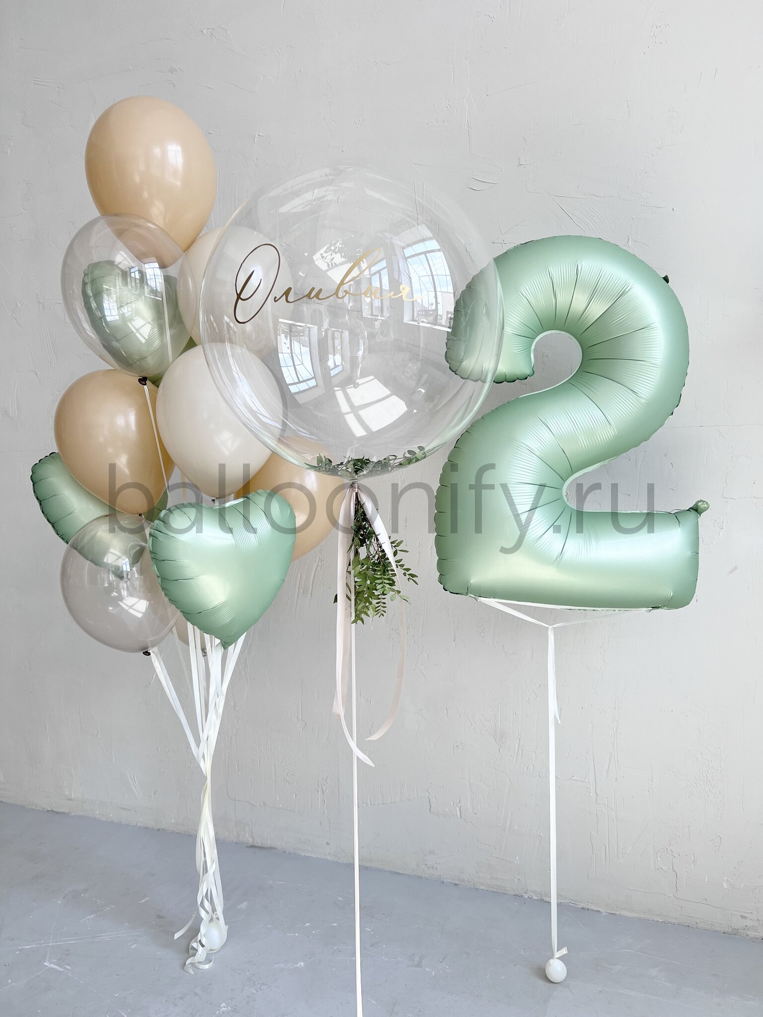 Представляем элегантную композицию воздушных шаров для особых событий. Центральный элемент – впечатляющий прозрачный шар баблс 61 см с возможностью нанесения индивидуальной надписи. Декор из зелени придает композиции природную естественность. Сочетание природных оттенков создает атмосферу уюта и торжественности.