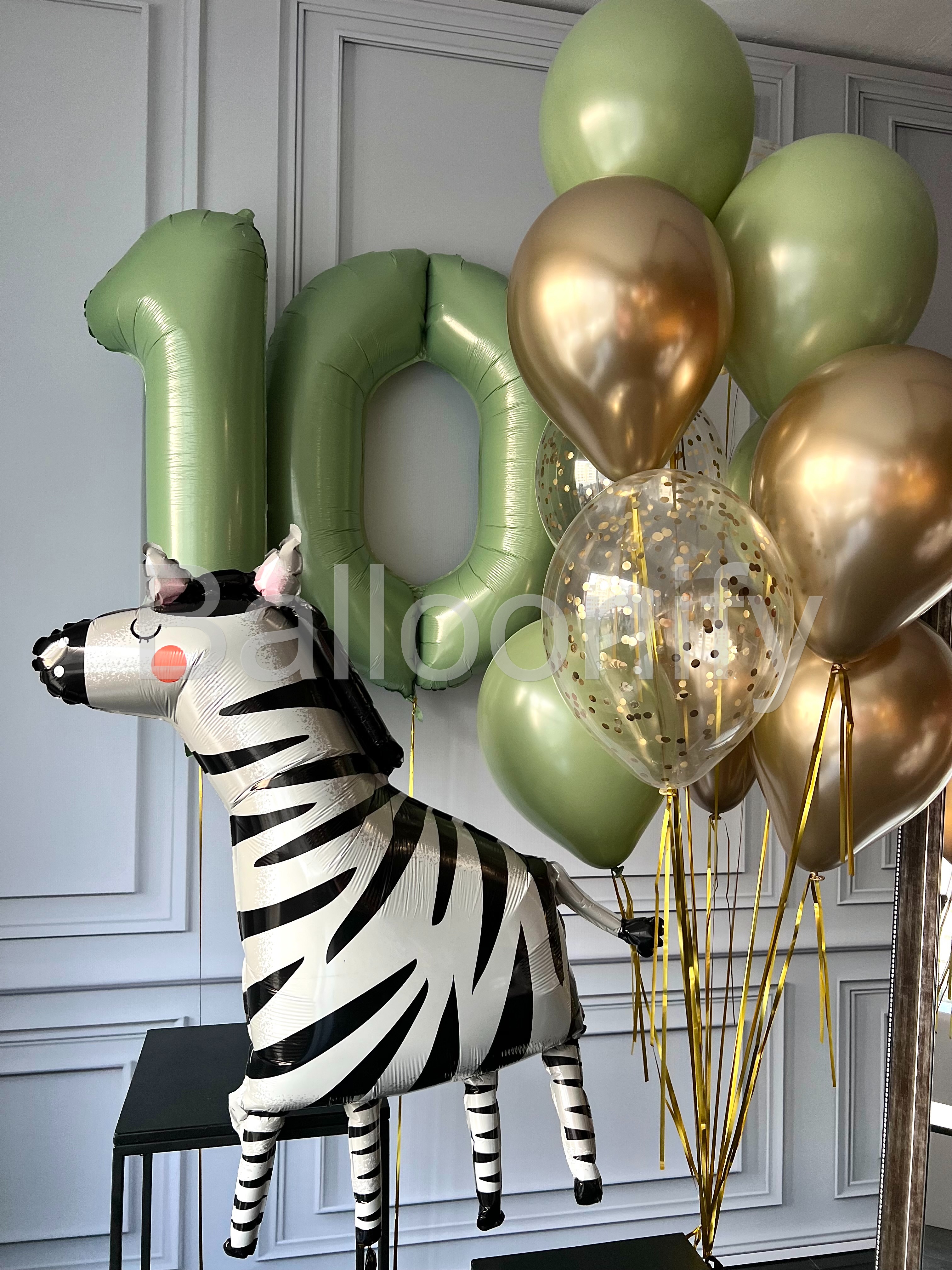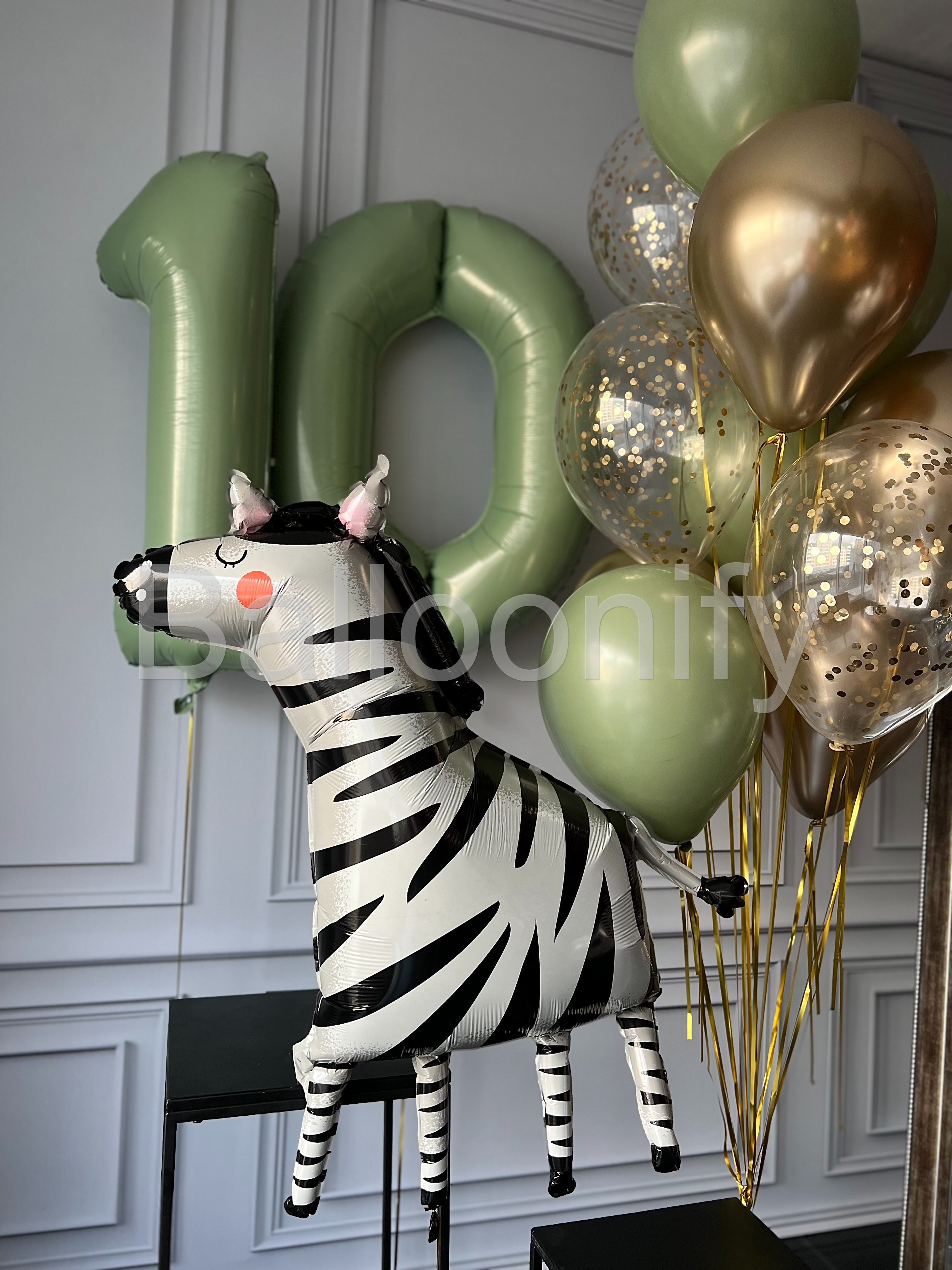 Превратите день рождения ребёнка в незабываемое событие! Этот изысканный набор шаров создаст атмосферу радости и волшебства. Нежные оливковые и сияющие золотые оттенки гармонично сочетаются, делая оформление стильным и праздничным! Большие цифры и превосходная фигура зебры сразу зададут тему торжества, а шары с конфетти добавят лёгкости и блеска. Подарите ребёнку праздник мечты! 🌟