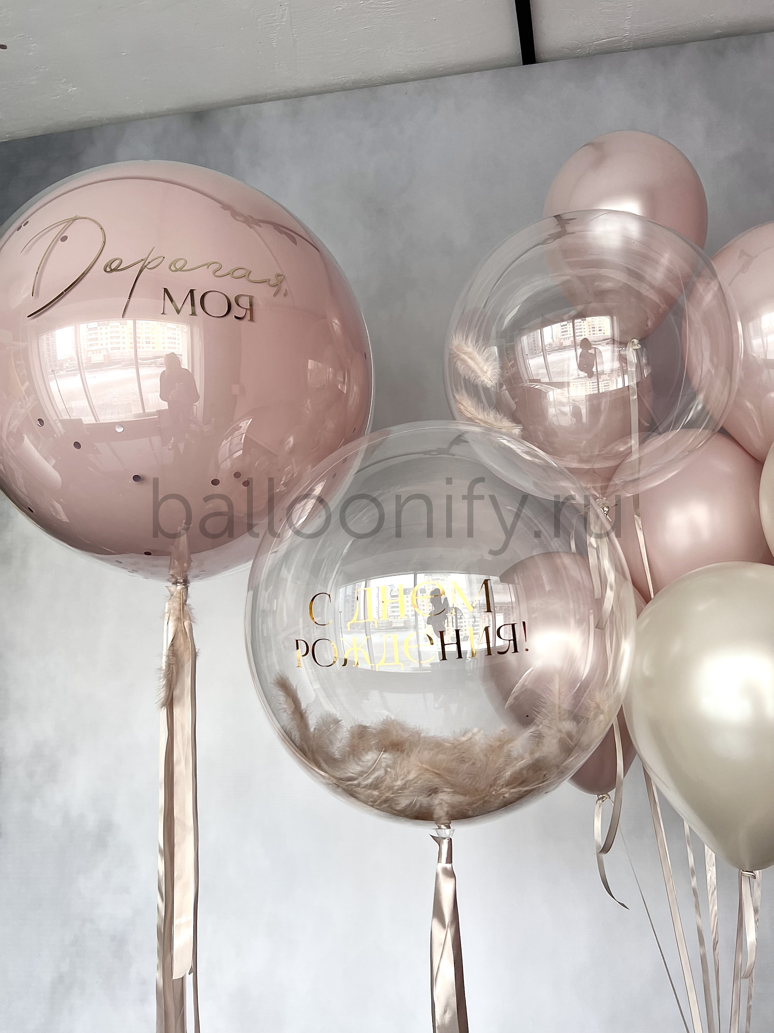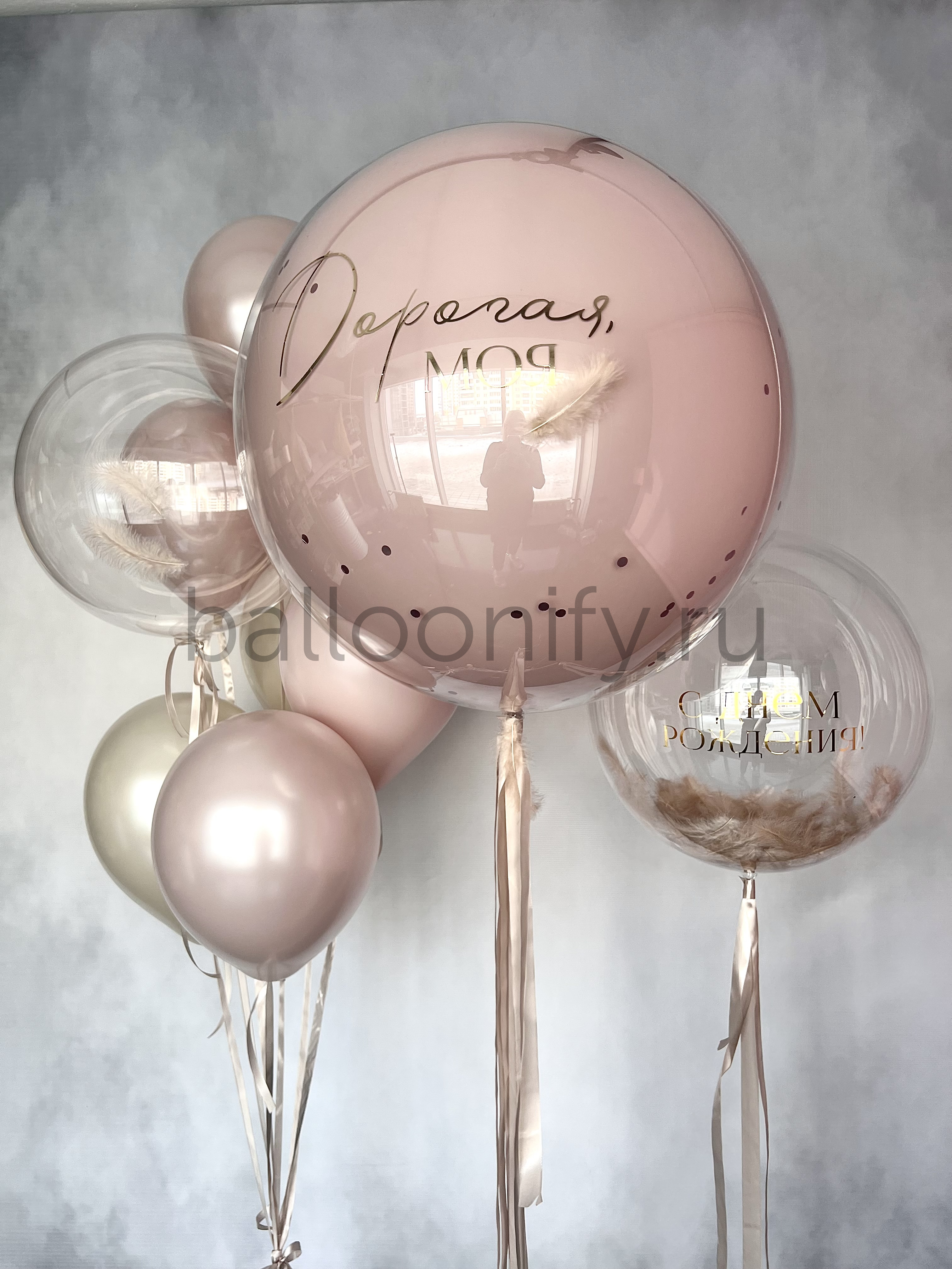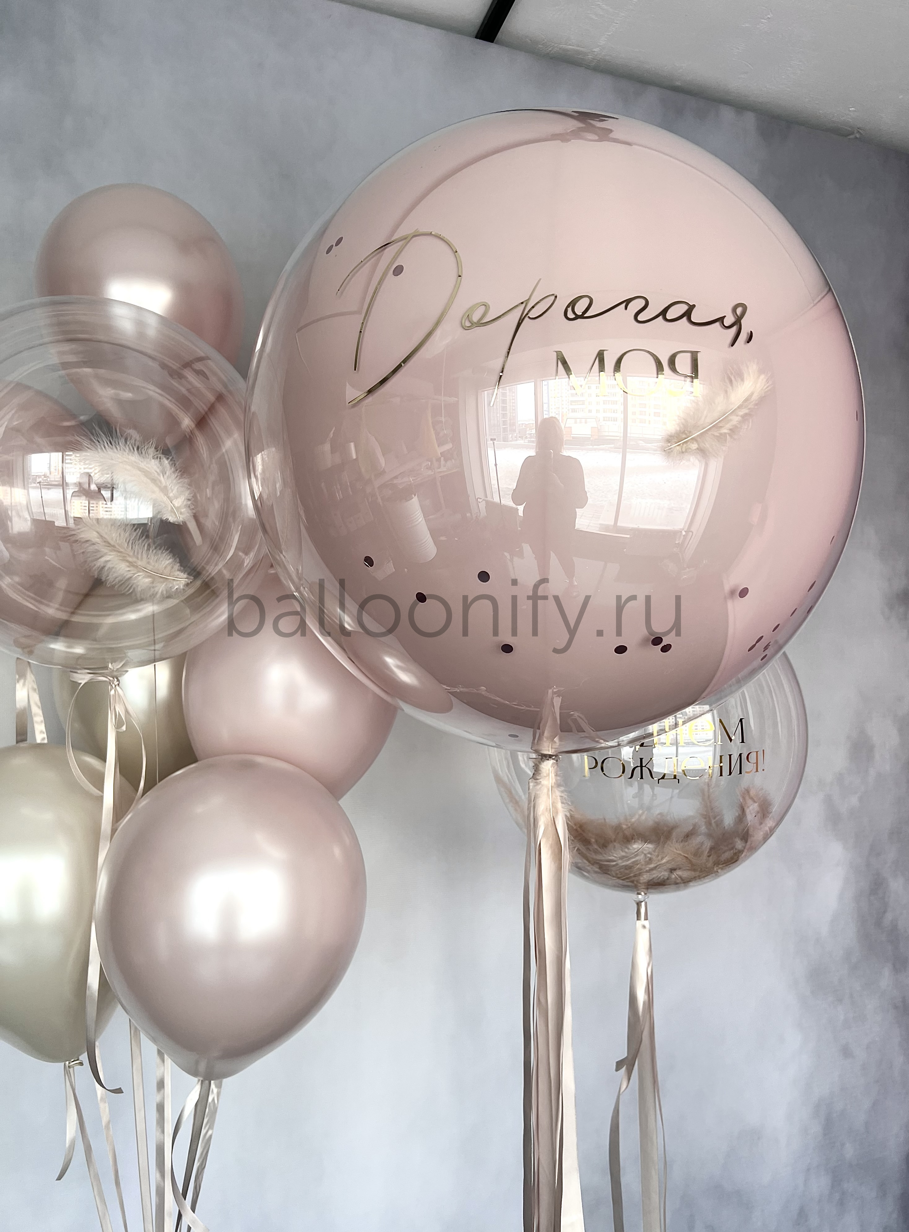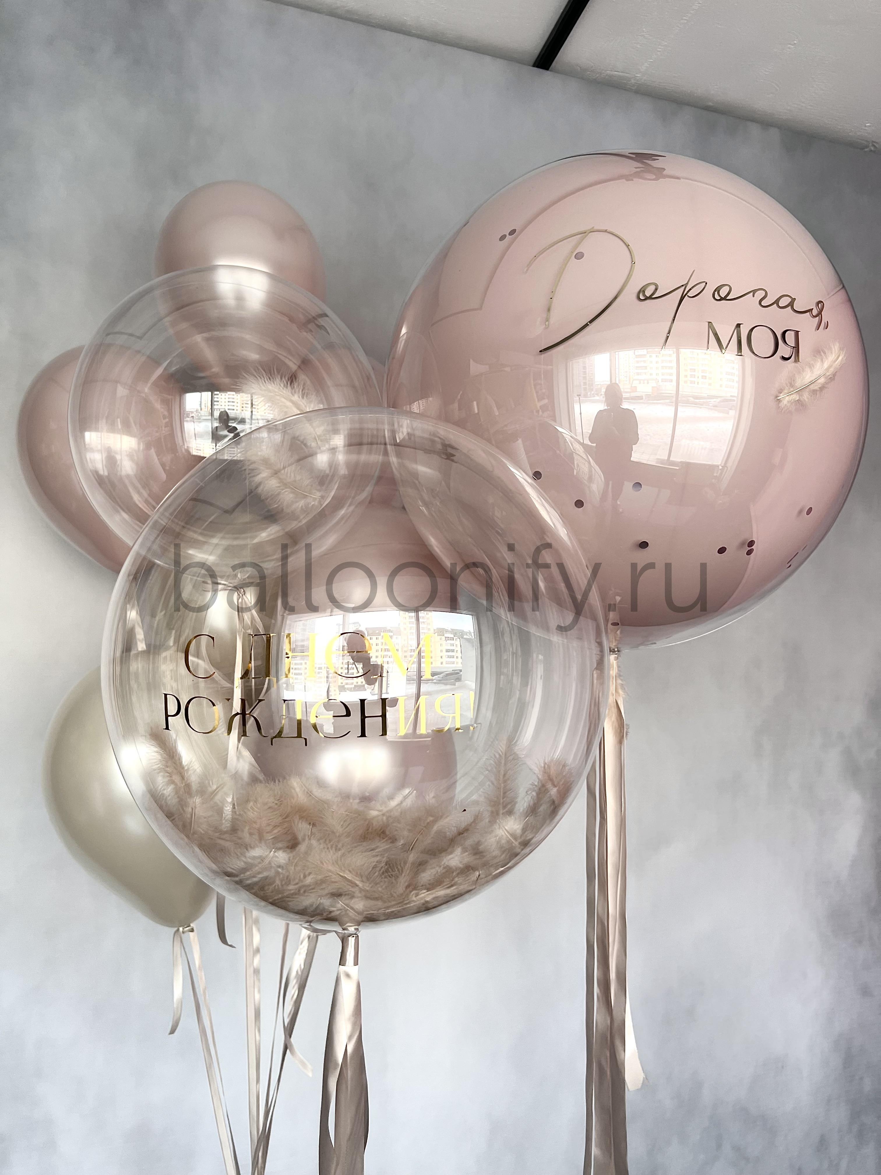 Элегантная композиция из воздушных шаров в нежных пудровых и кремовых оттенках: крупный розовый шар с изящной золотой надписью «Дорогая, моя…», прозрачные шары-кристаллы с перьями и надписью «С днём рождения!», а также блестящие шары пастельных тонов, перевязанные тонкими лентами. Создаст утончённую и праздничную атмосферу на дне рождения. 🌟