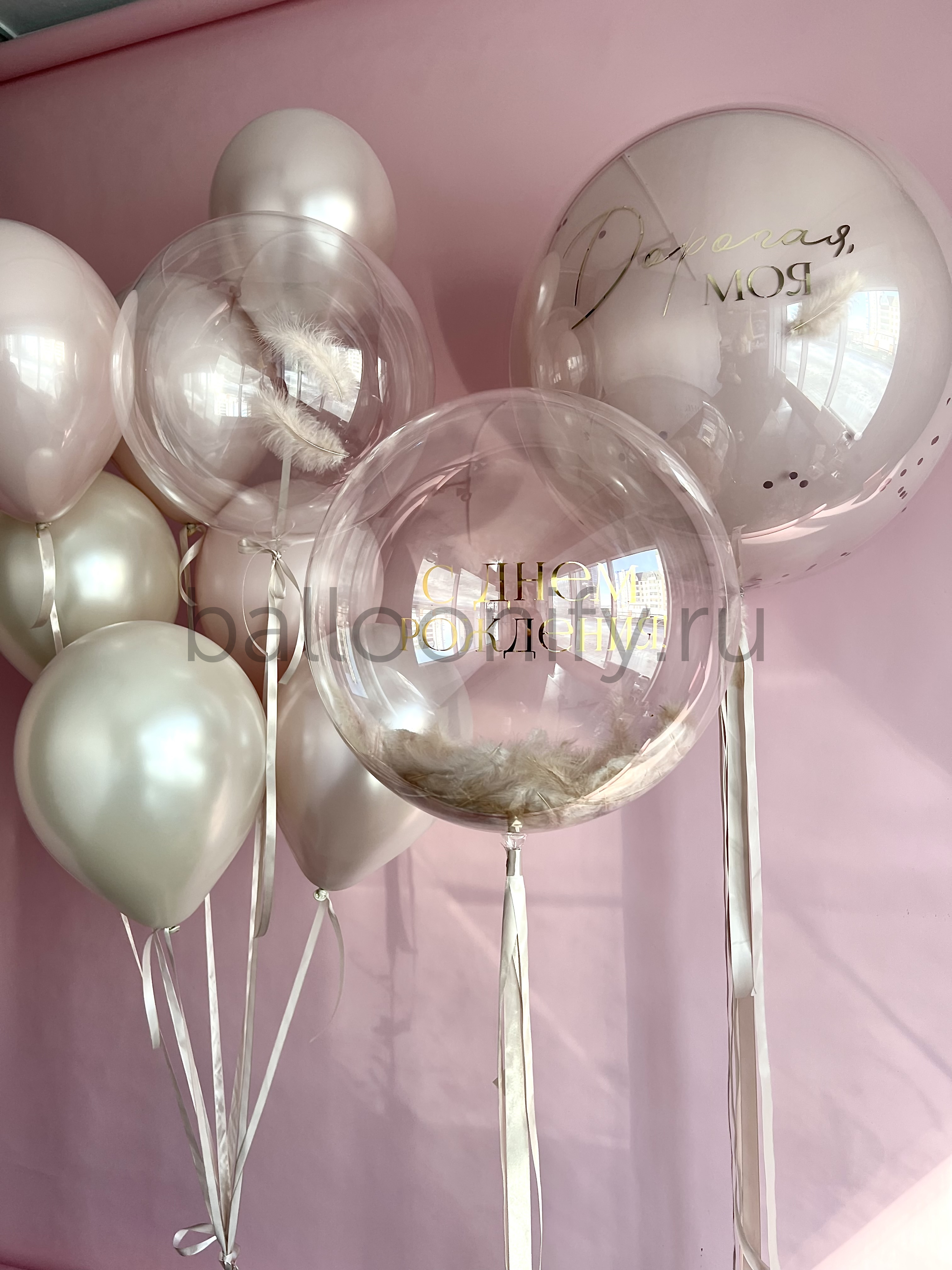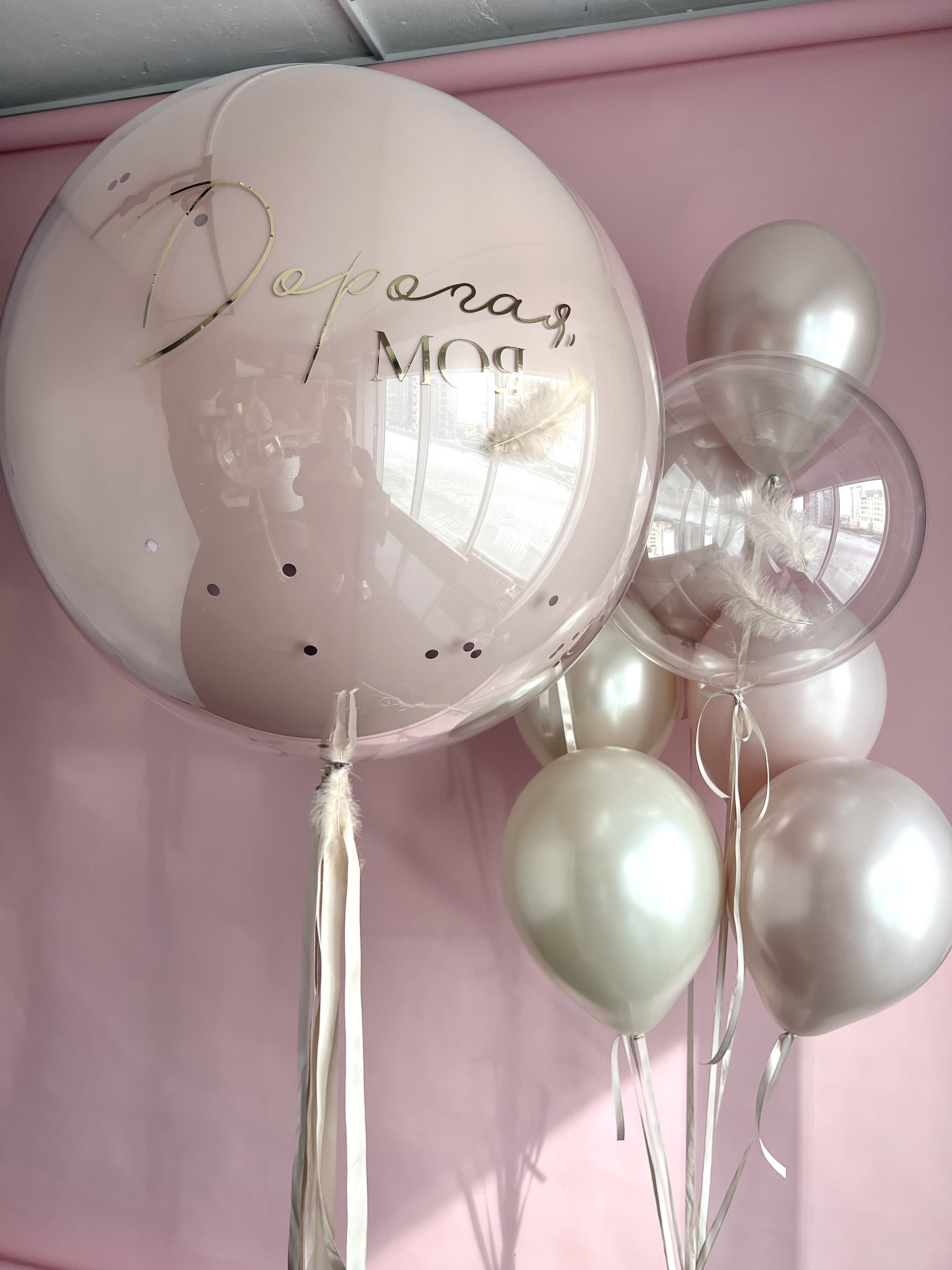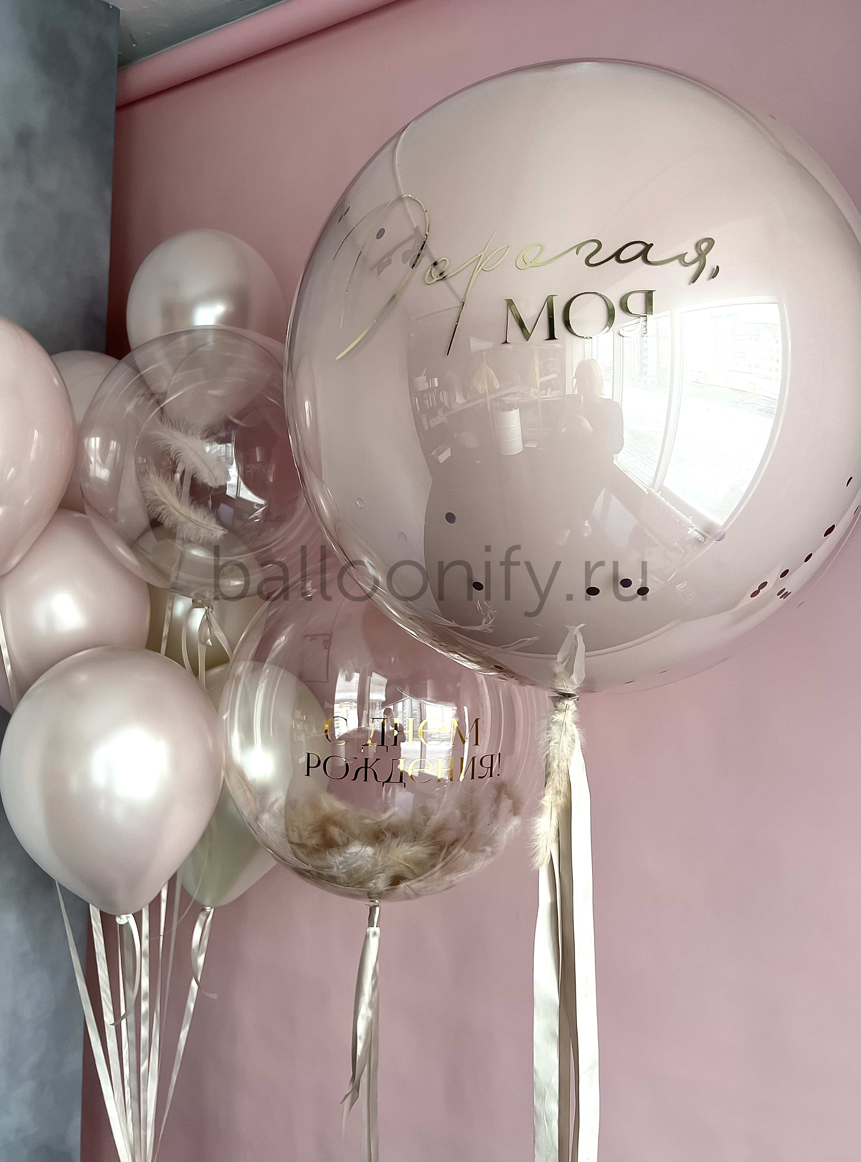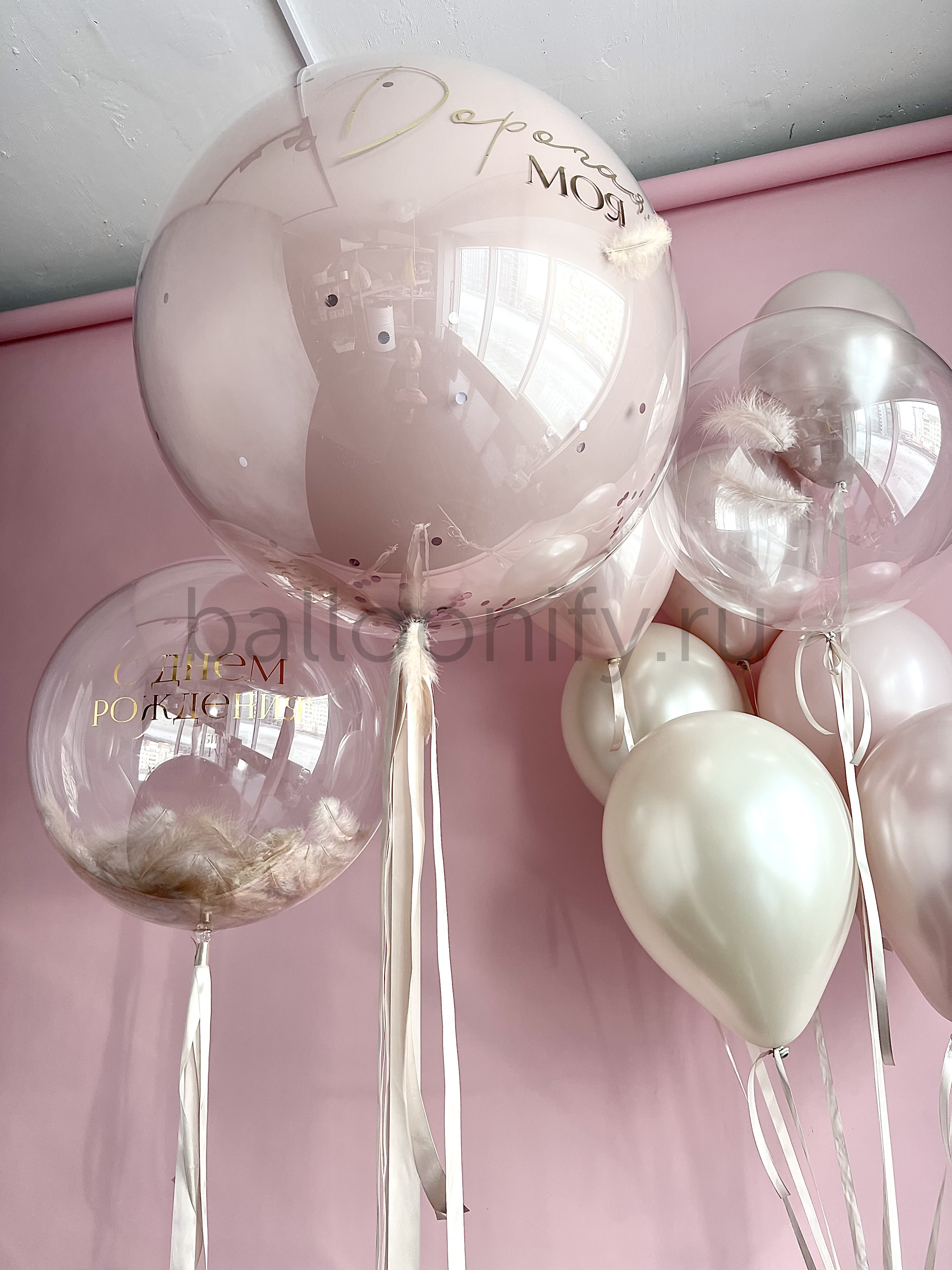 Элегантная композиция из воздушных шаров в нежных пудровых и кремовых оттенках: крупный розовый шар с изящной золотой надписью «Дорогая, моя…», прозрачные шары-кристаллы с перьями и надписью «С днём рождения!», а также блестящие шары пастельных тонов, перевязанные тонкими лентами. Создаст утончённую и праздничную атмосферу на дне рождения. 🌟