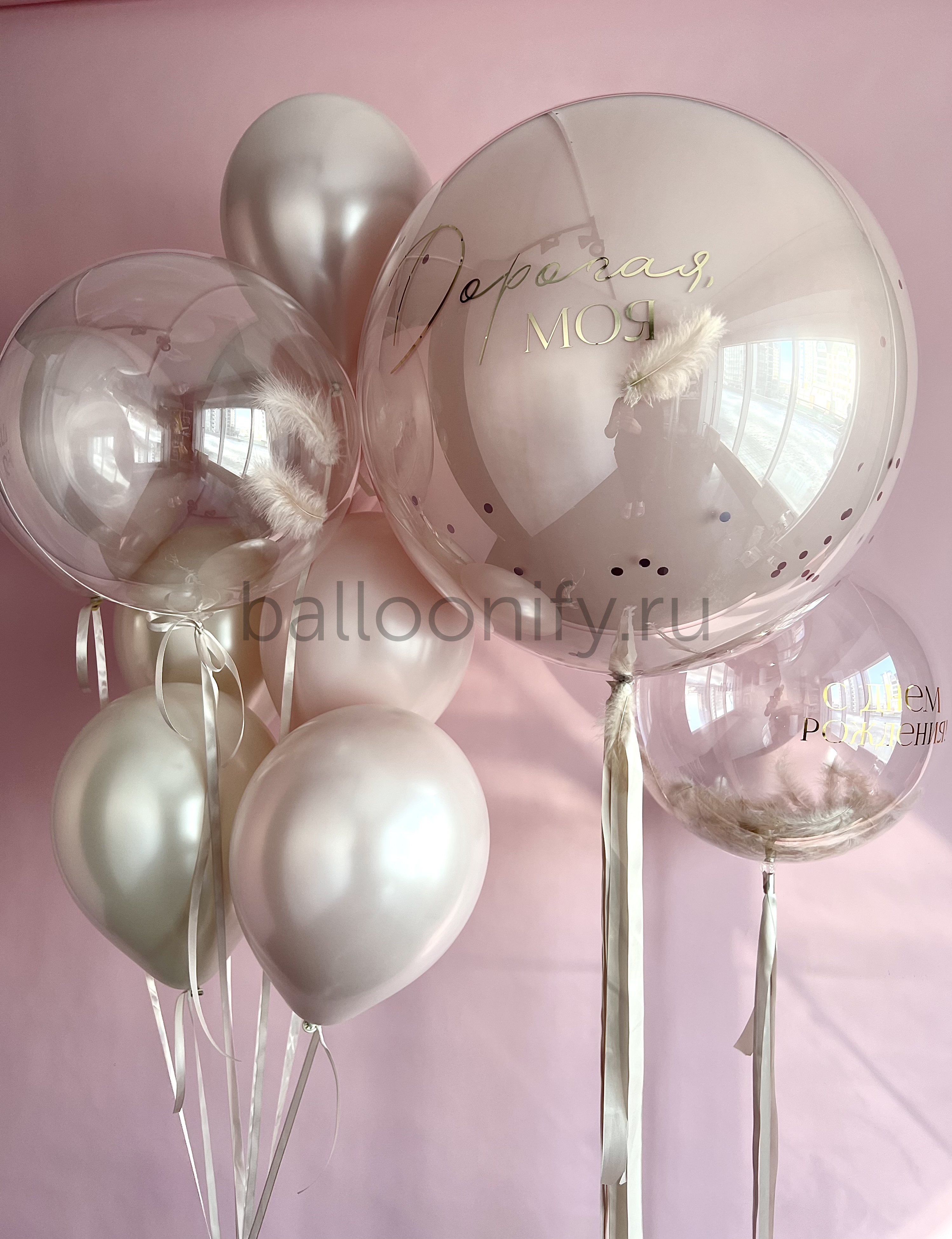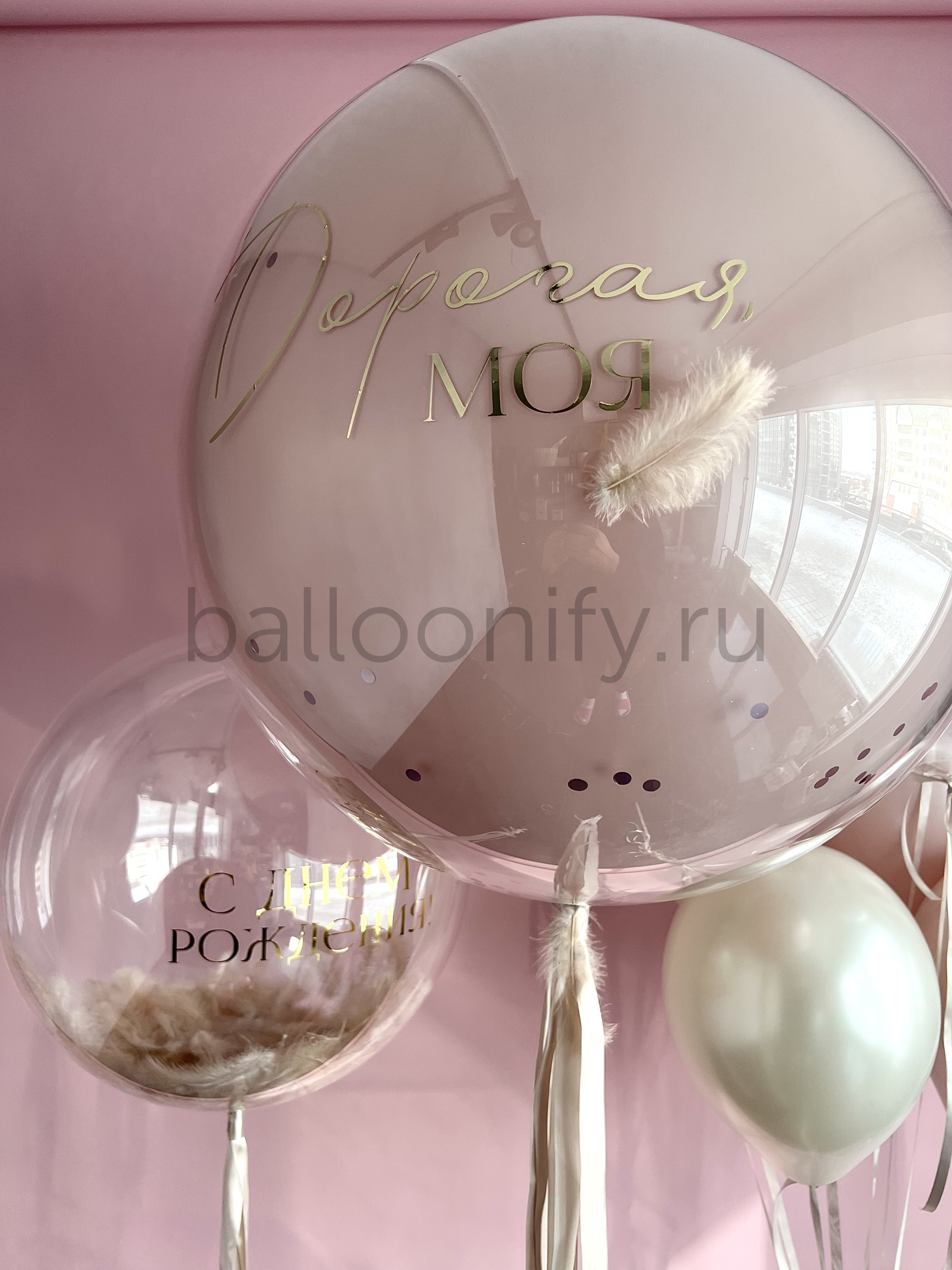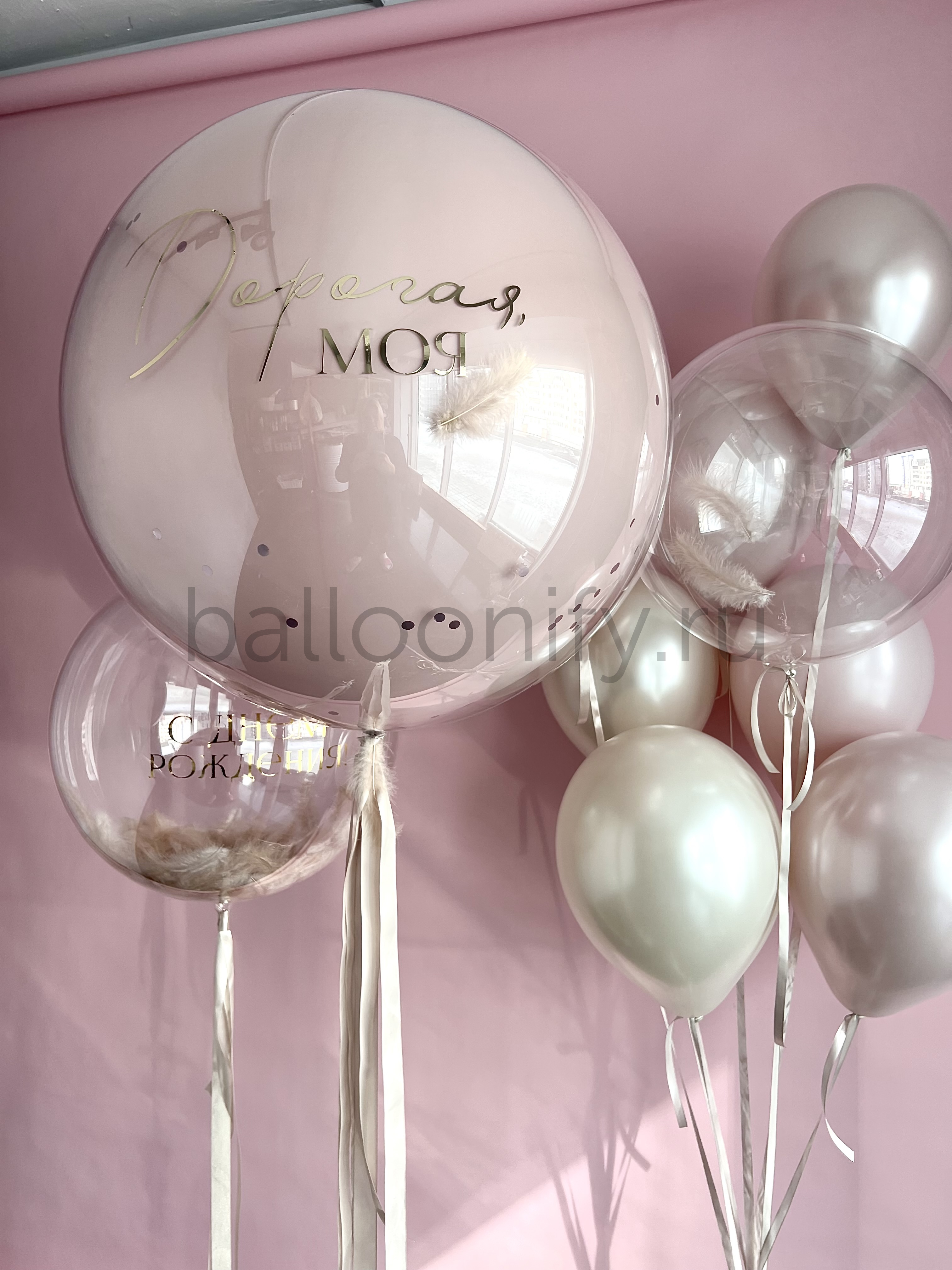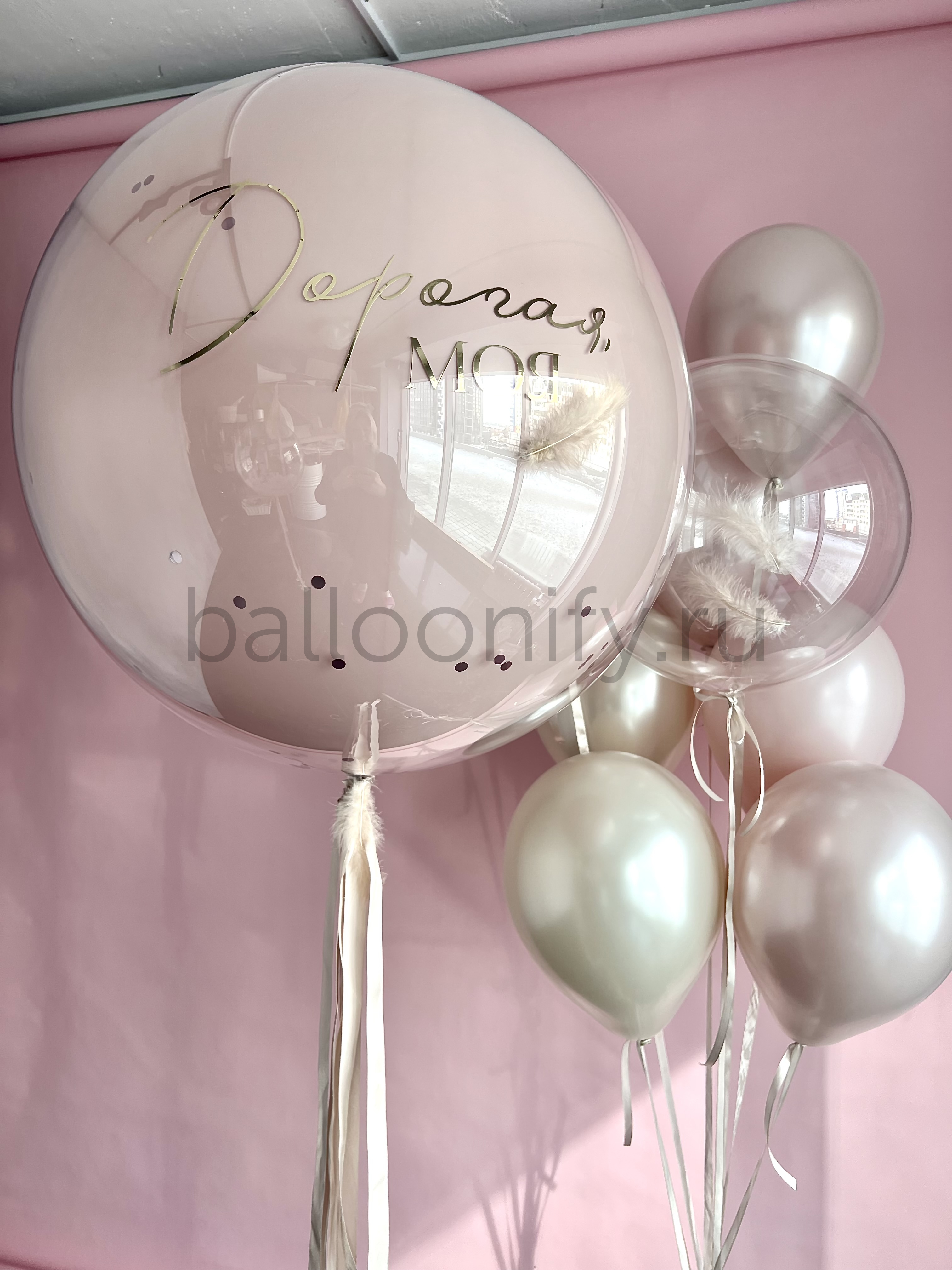 Элегантная композиция из воздушных шаров в нежных пудровых и кремовых оттенках: крупный розовый шар с изящной золотой надписью «Дорогая, моя…», прозрачные шары-кристаллы с перьями и надписью «С днём рождения!», а также блестящие шары пастельных тонов, перевязанные тонкими лентами. Создаст утончённую и праздничную атмосферу на дне рождения. 🌟