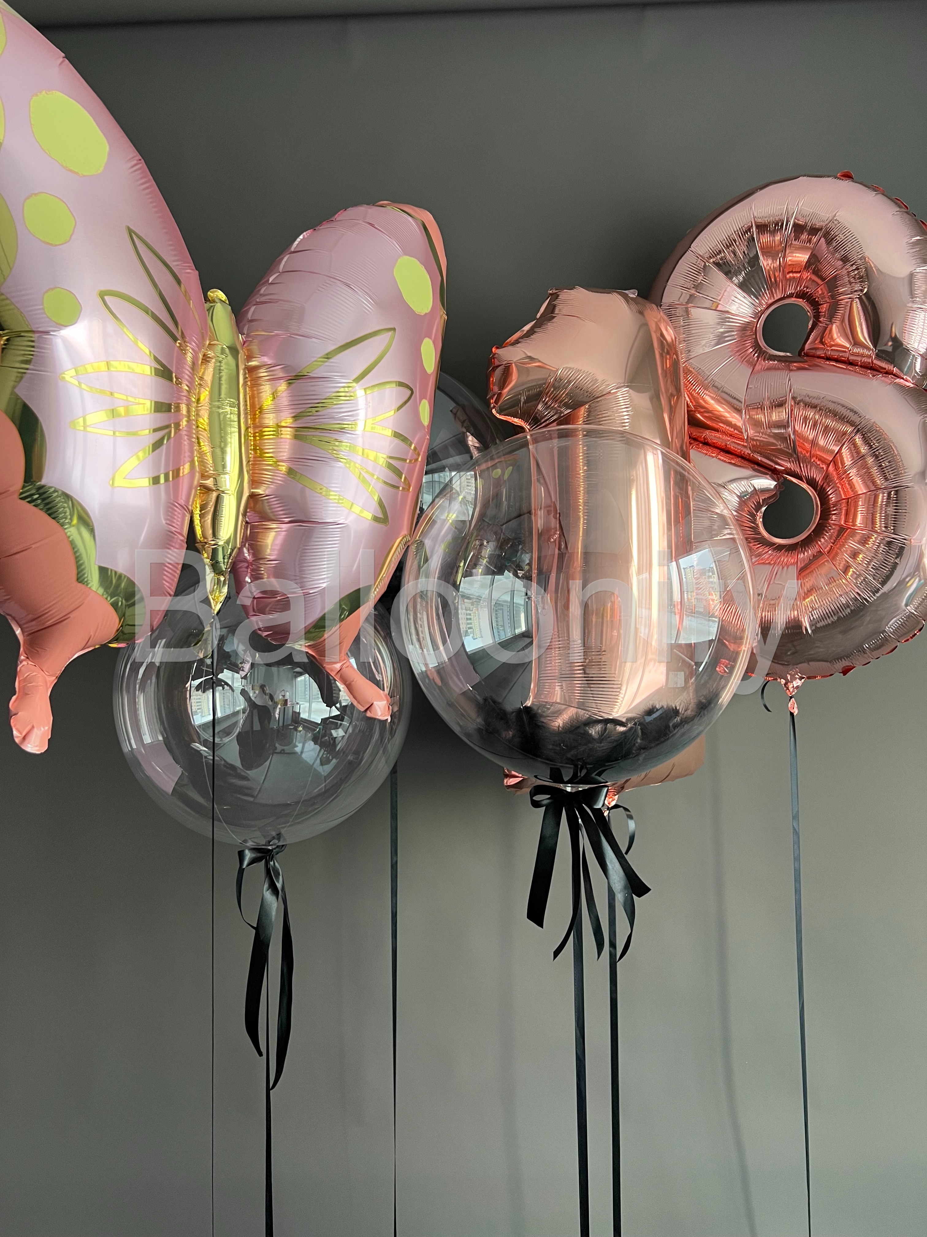 Дополняют образ прозрачные шары-пузыри с элегантными чёрными лентами. Их лаконичный дизайн гармонично сочетается с яркой бабочкой, придавая композиции утончённость и стиль. Такие шары станут не только украшением зала, но и фотозоной, которая покорит гостей! 🌟