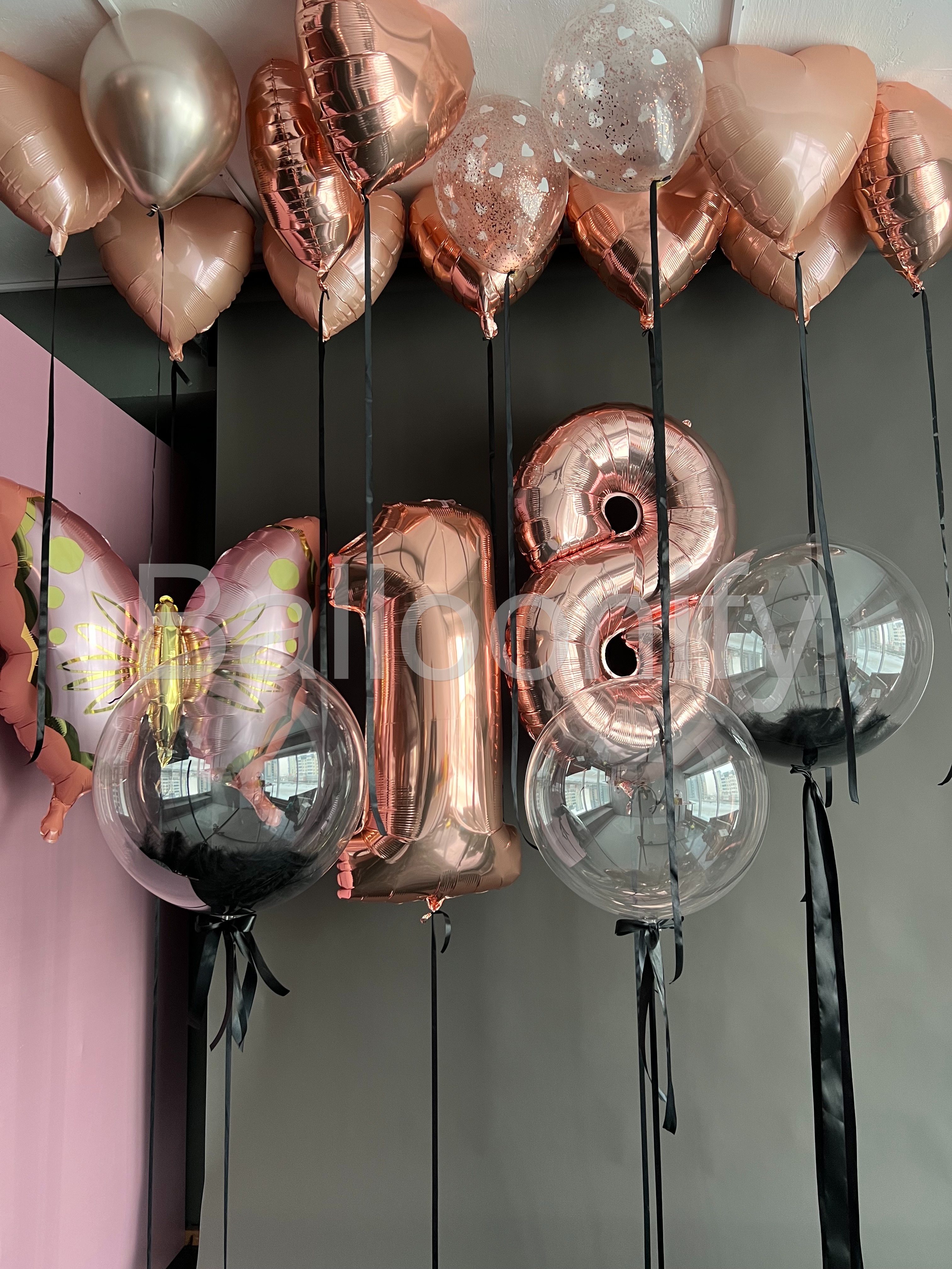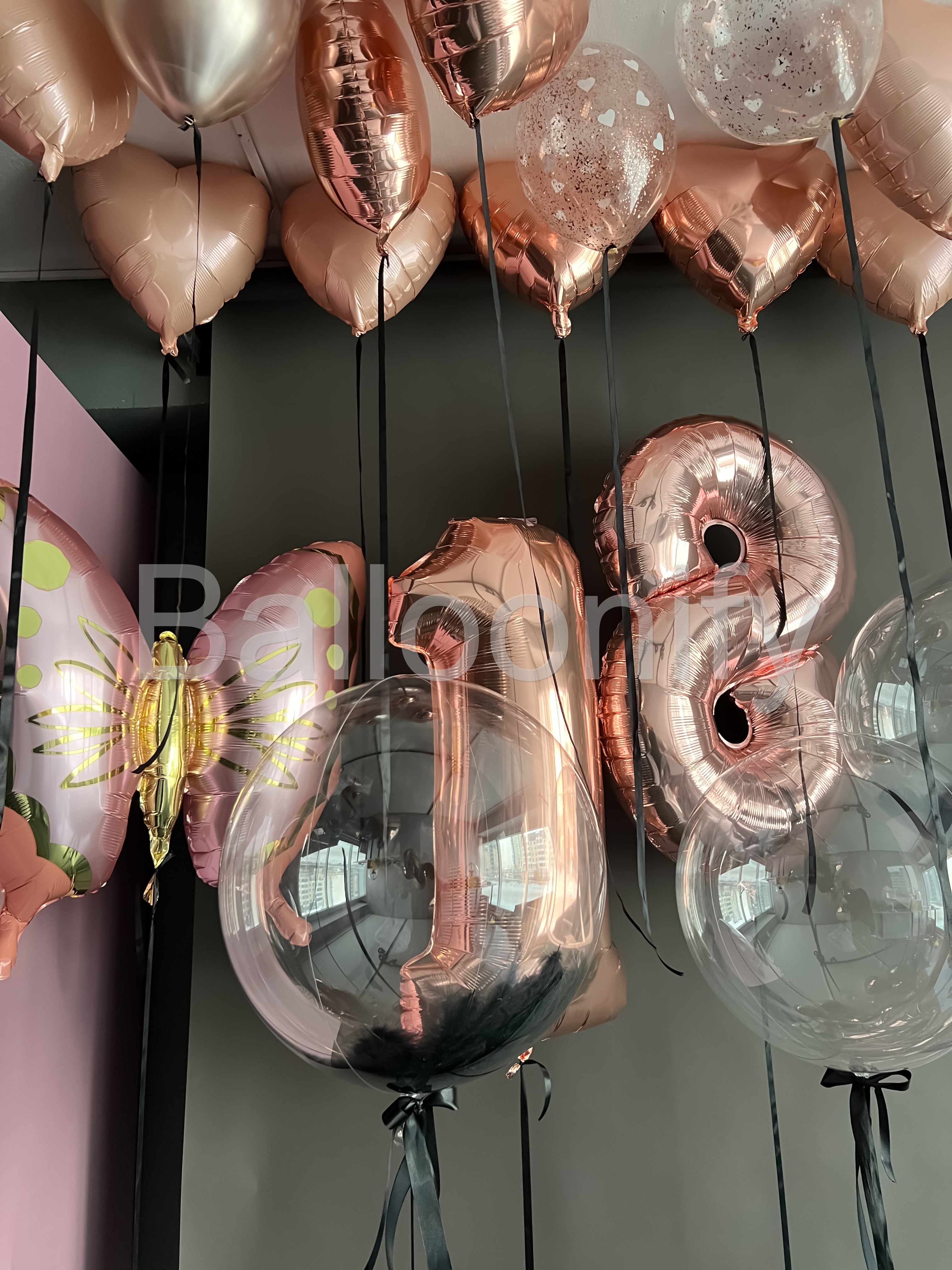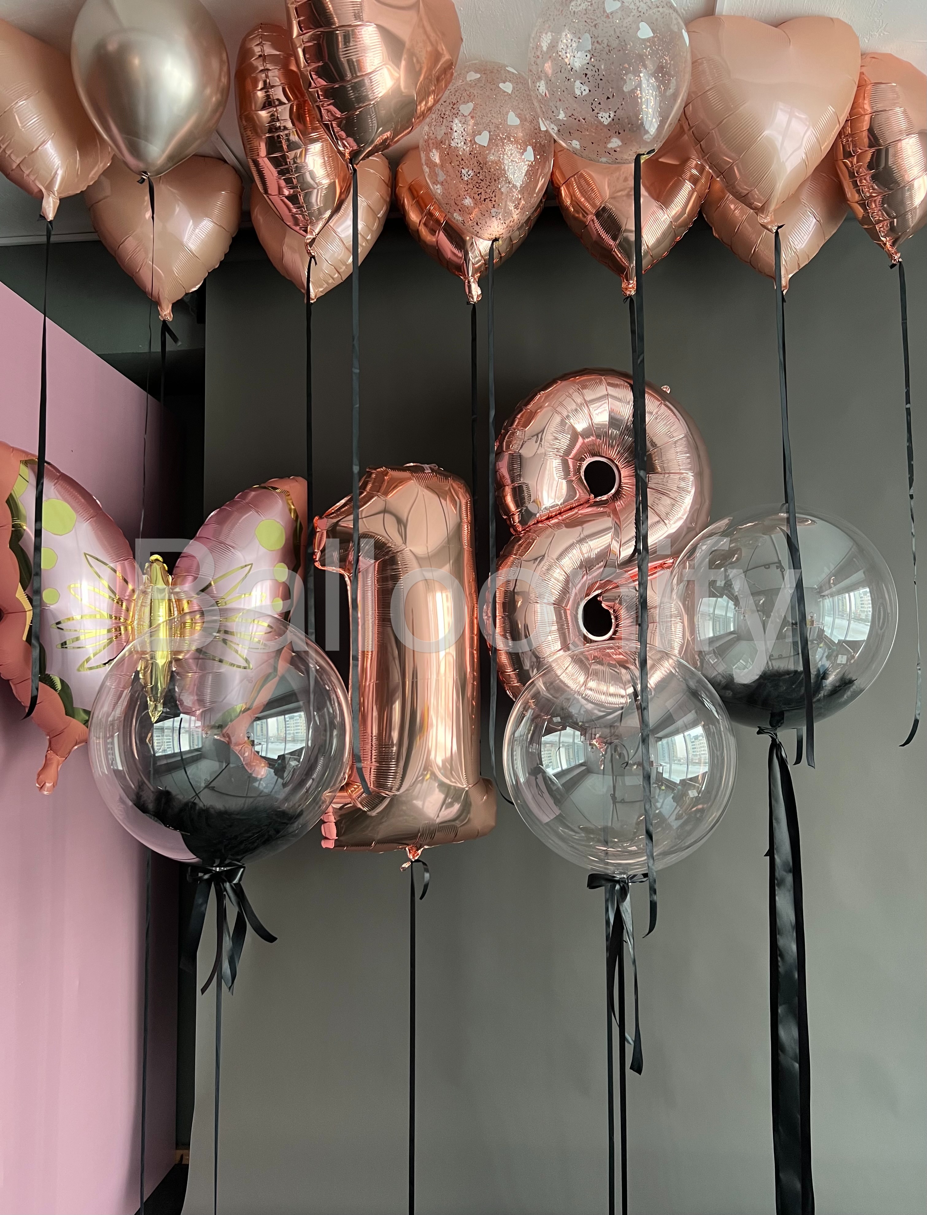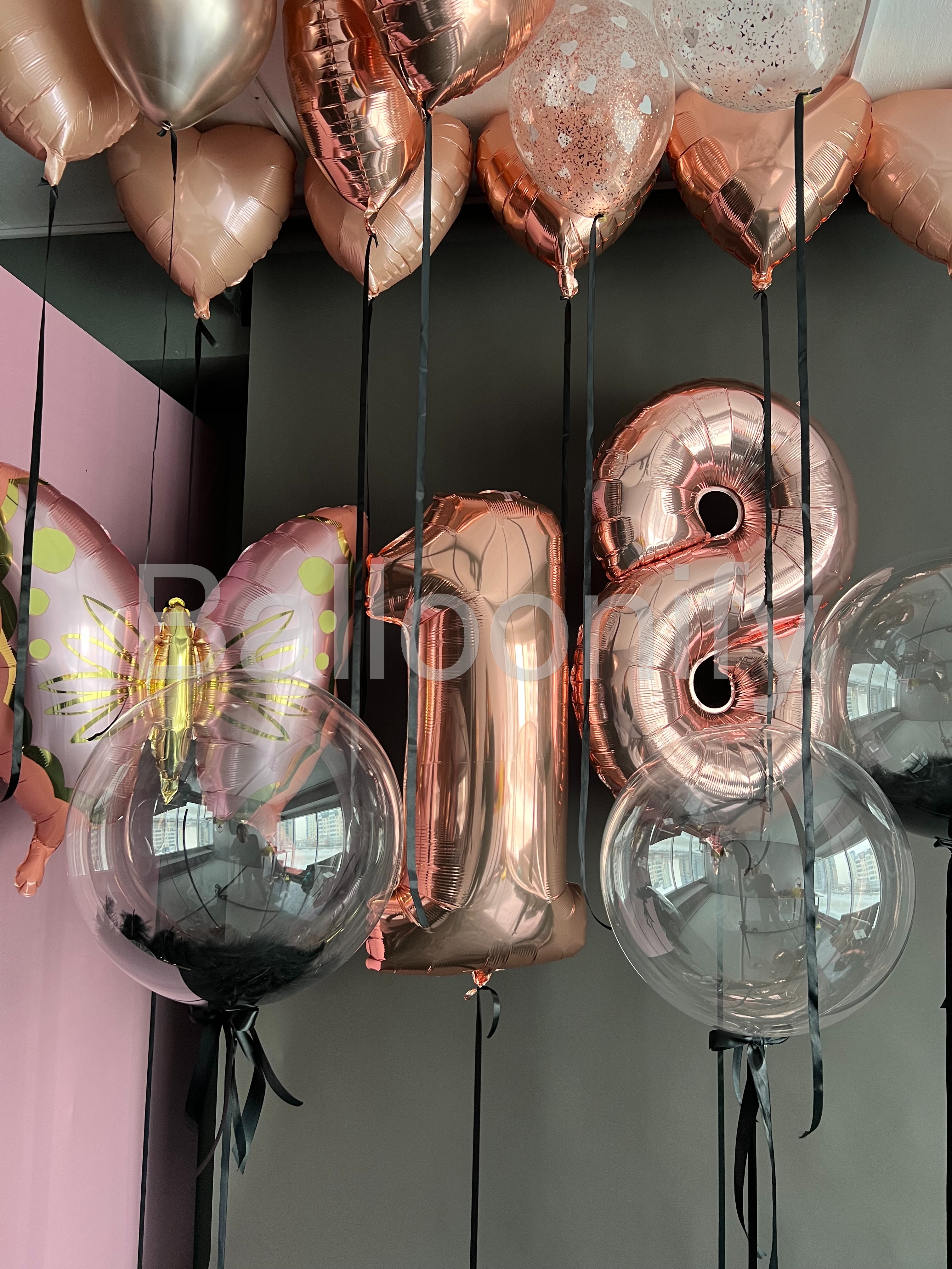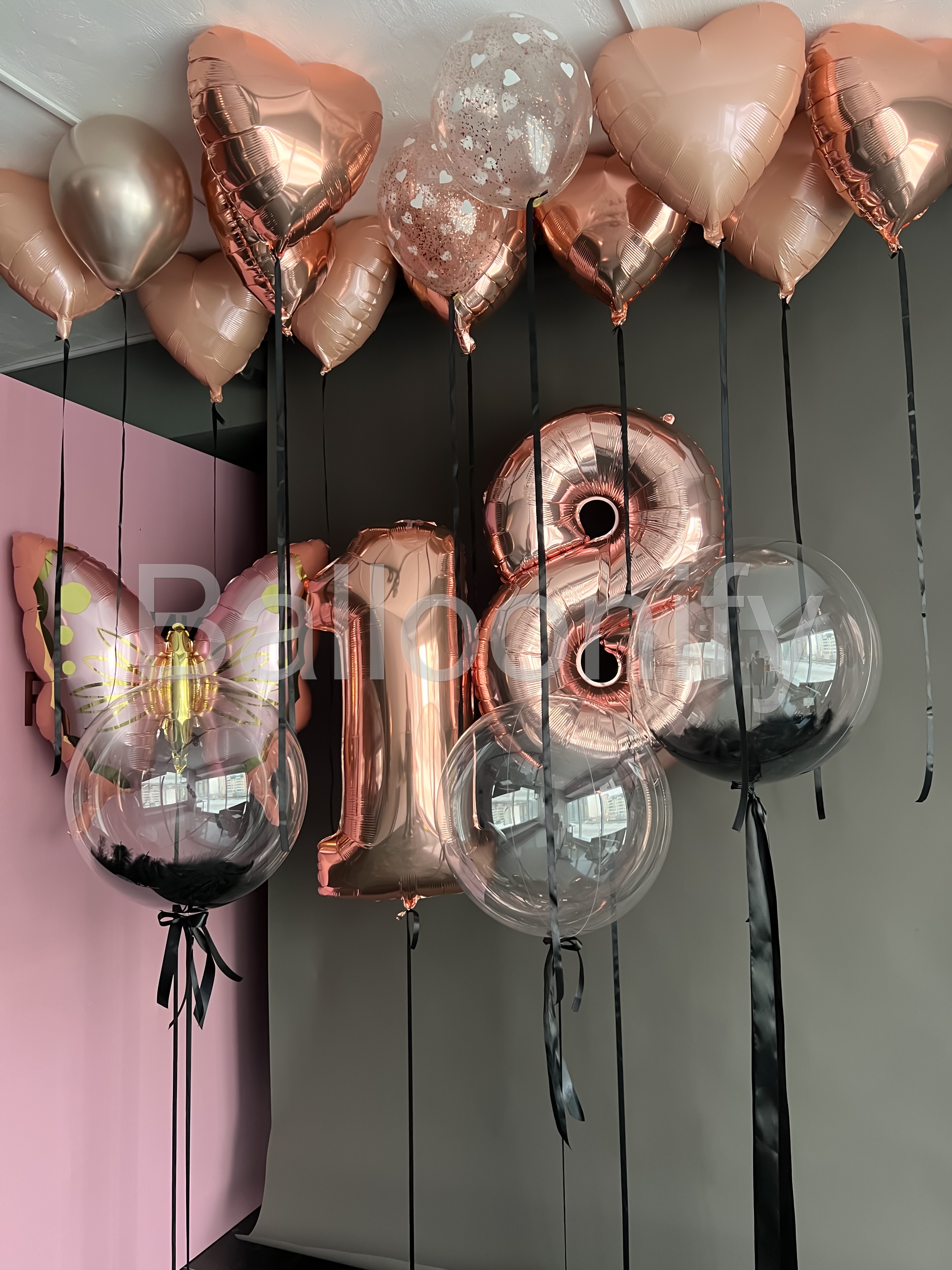 Превратите свой праздник в волшебное событие с нашим изысканным набором воздушных шаров! В центре композиции — роскошная бабочка из фольгированного материала в нежных розовых и золотых тонах, а так же прекрасные фольгированные цифры. Изящные крылья бабочки с яркими акцентами притягивают взгляд и создают атмосферу лёгкости и радости.