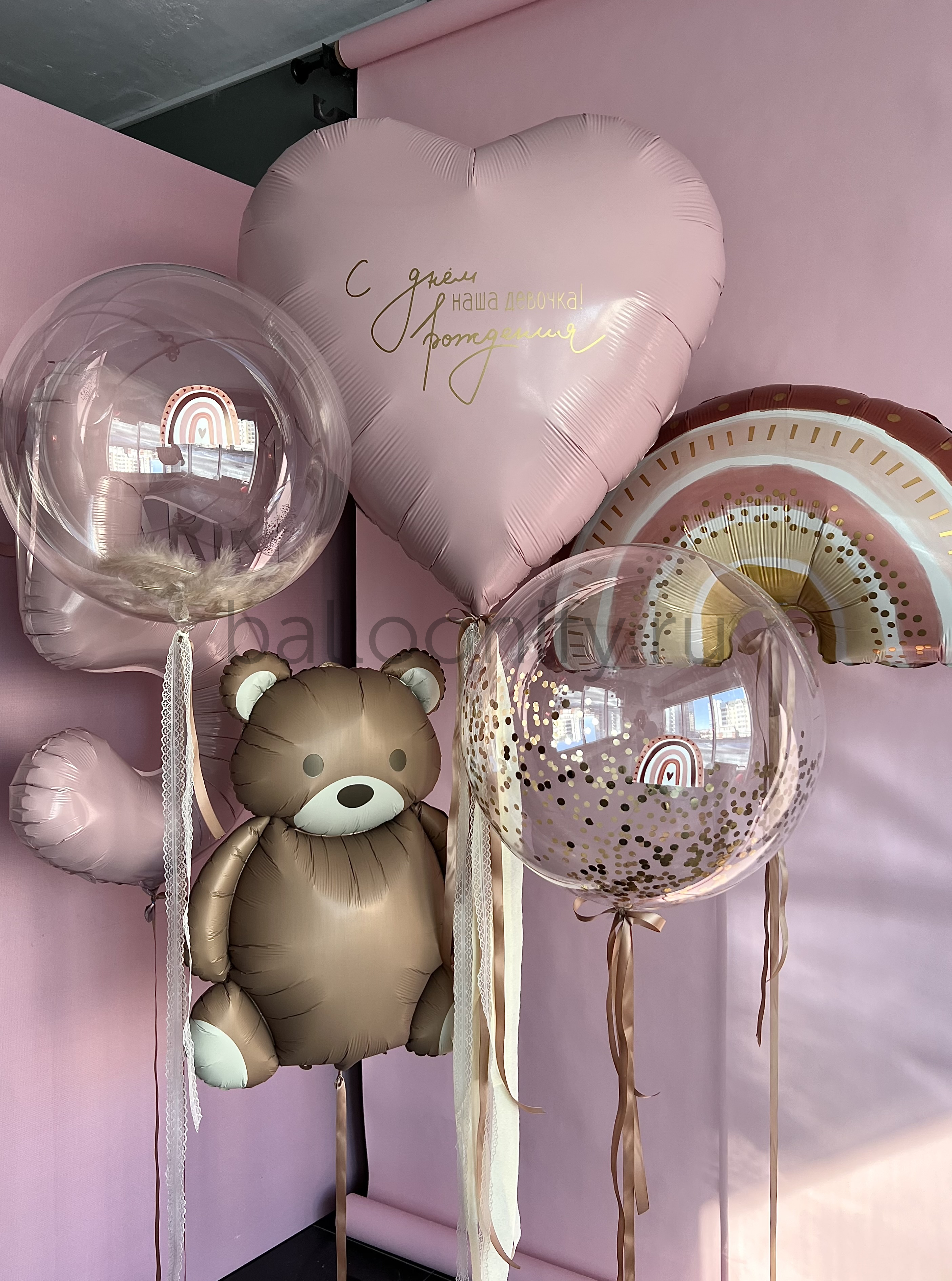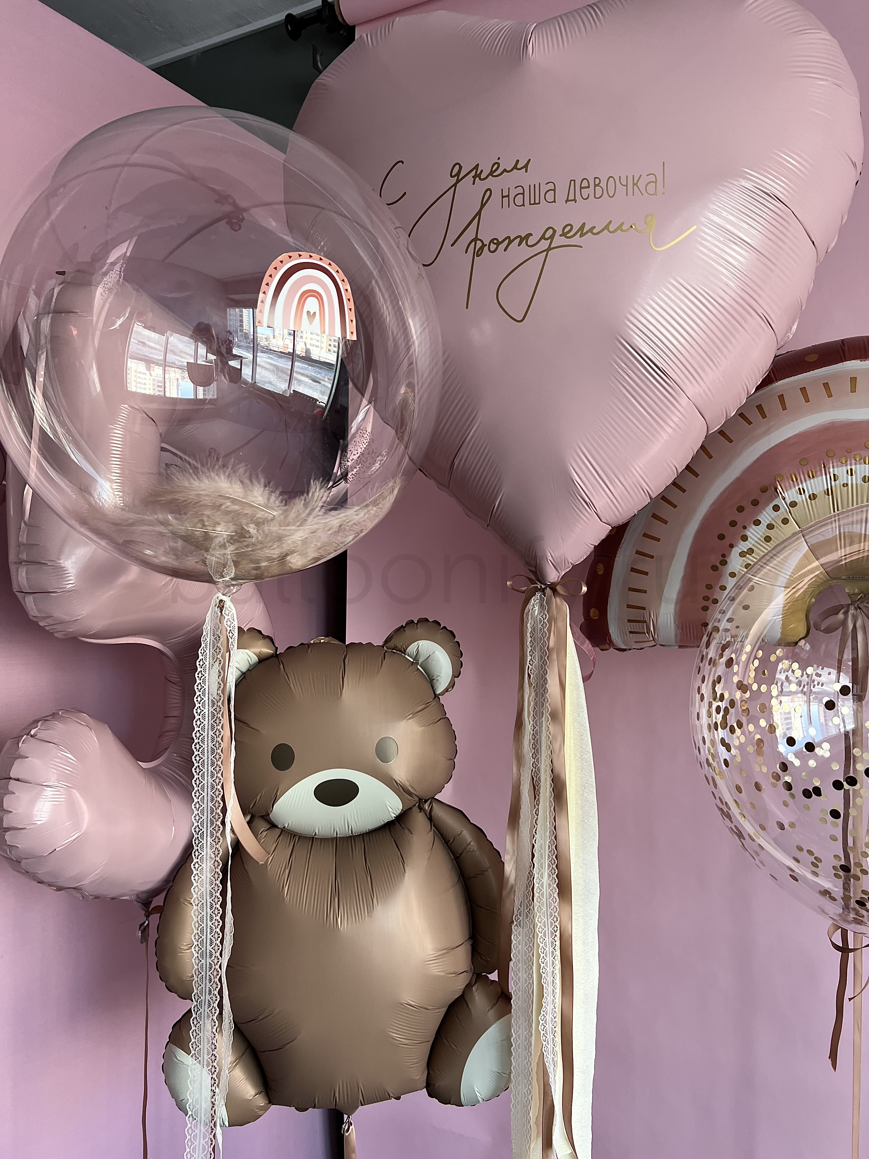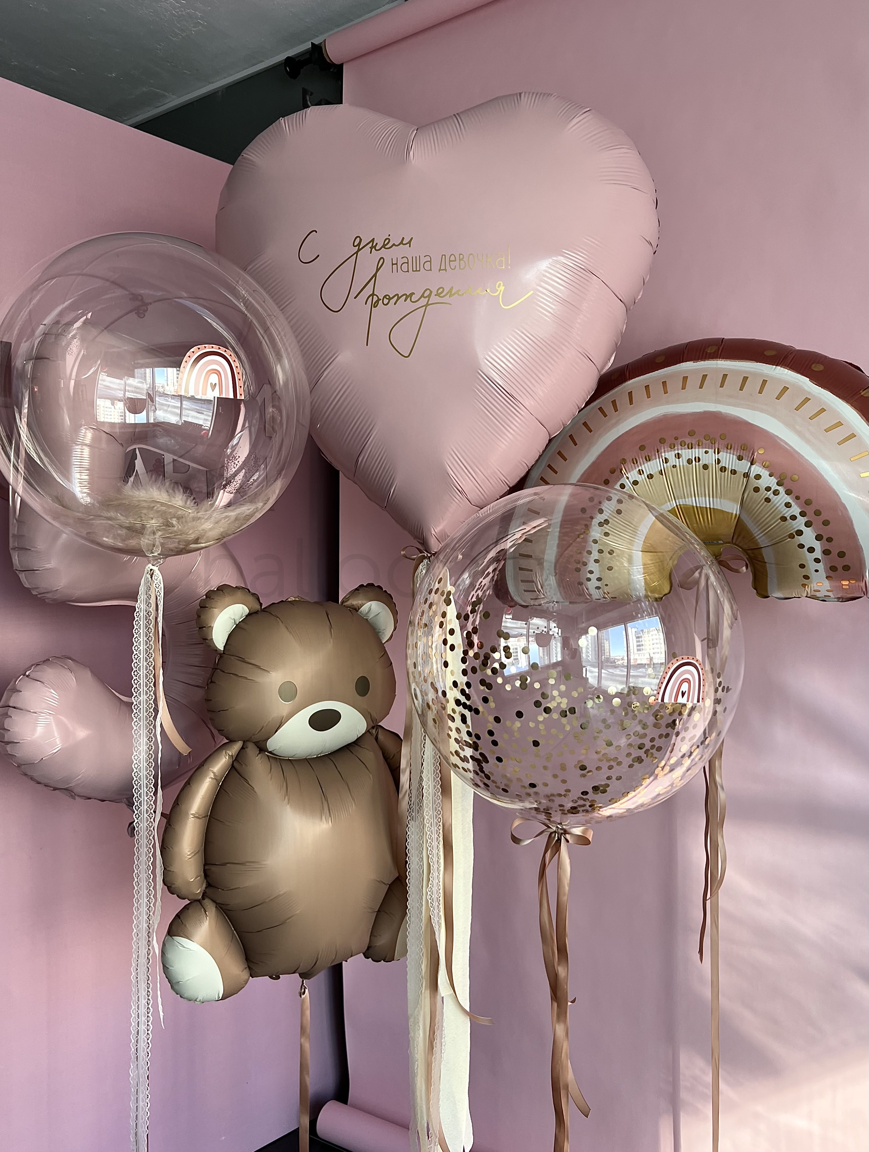 Нежная композиция из воздушных шаров для детского праздника: фольгированный медвежонок, большое розовое сердце с золотой надписью «С днём рождения, наша девочка!», радуга в пастельных тонах и прозрачные шары с конфетти и перьями, украшенные изящными лентами. Создаст волшебную атмосферу и подарит радость маленькой имениннице. 🌟