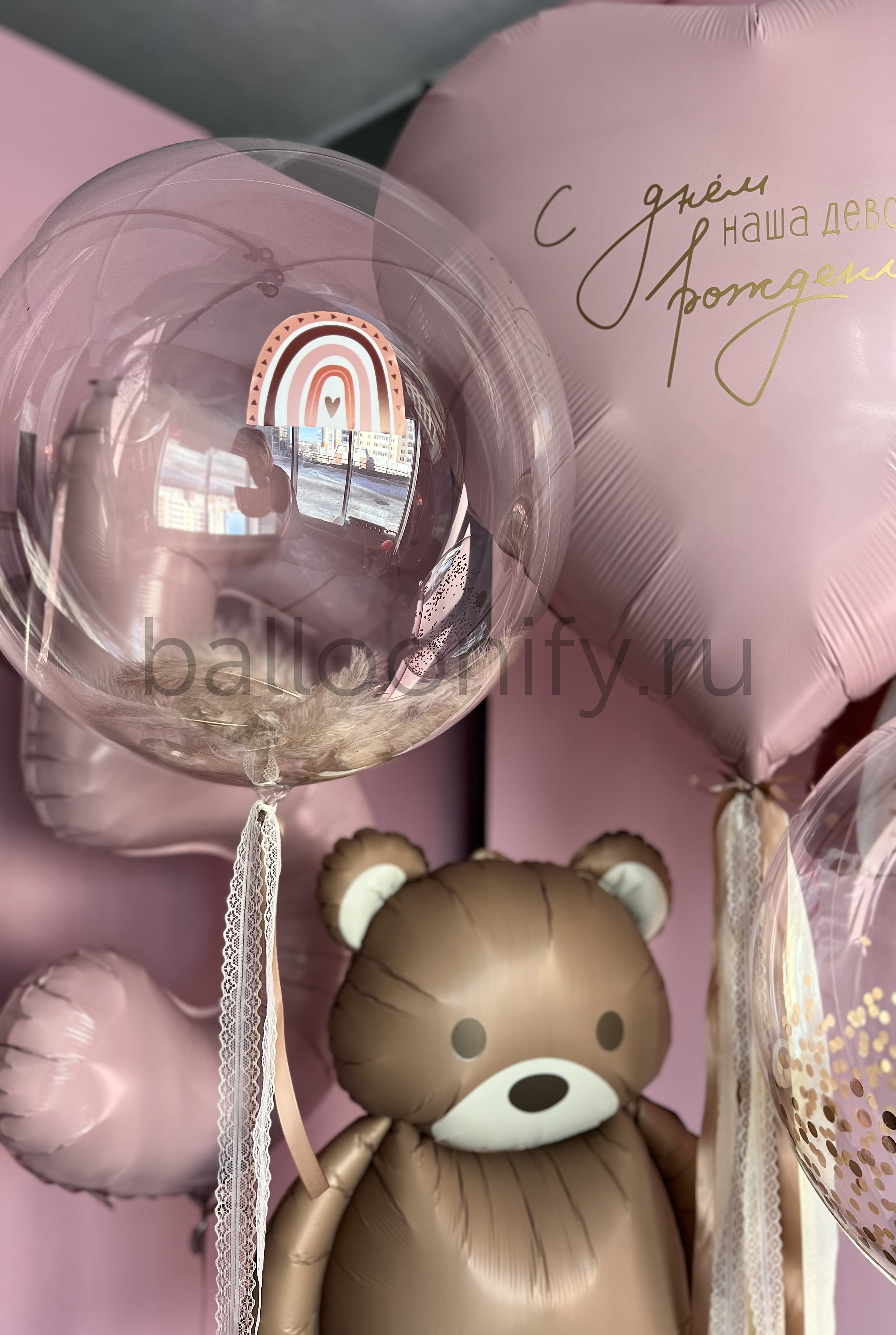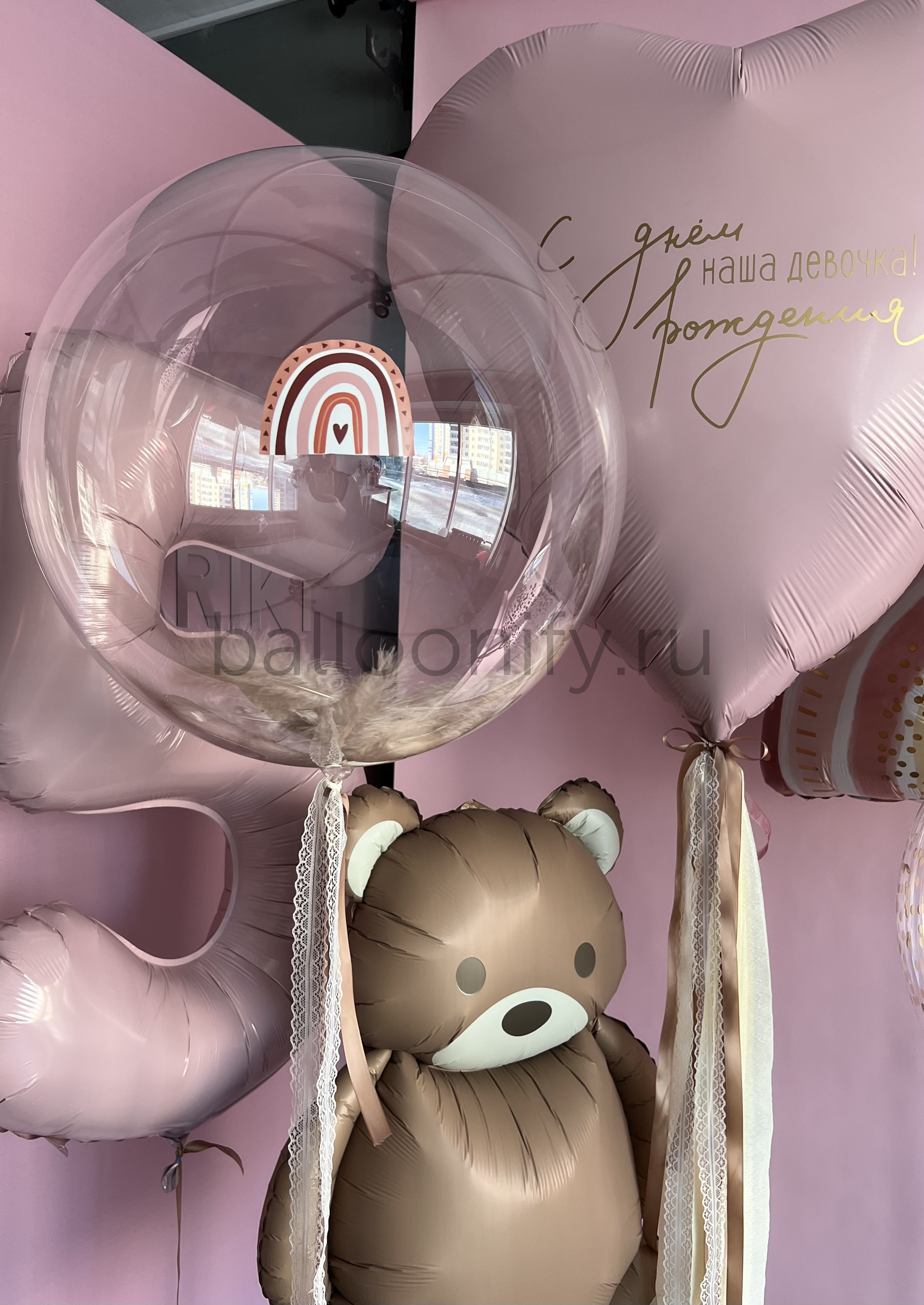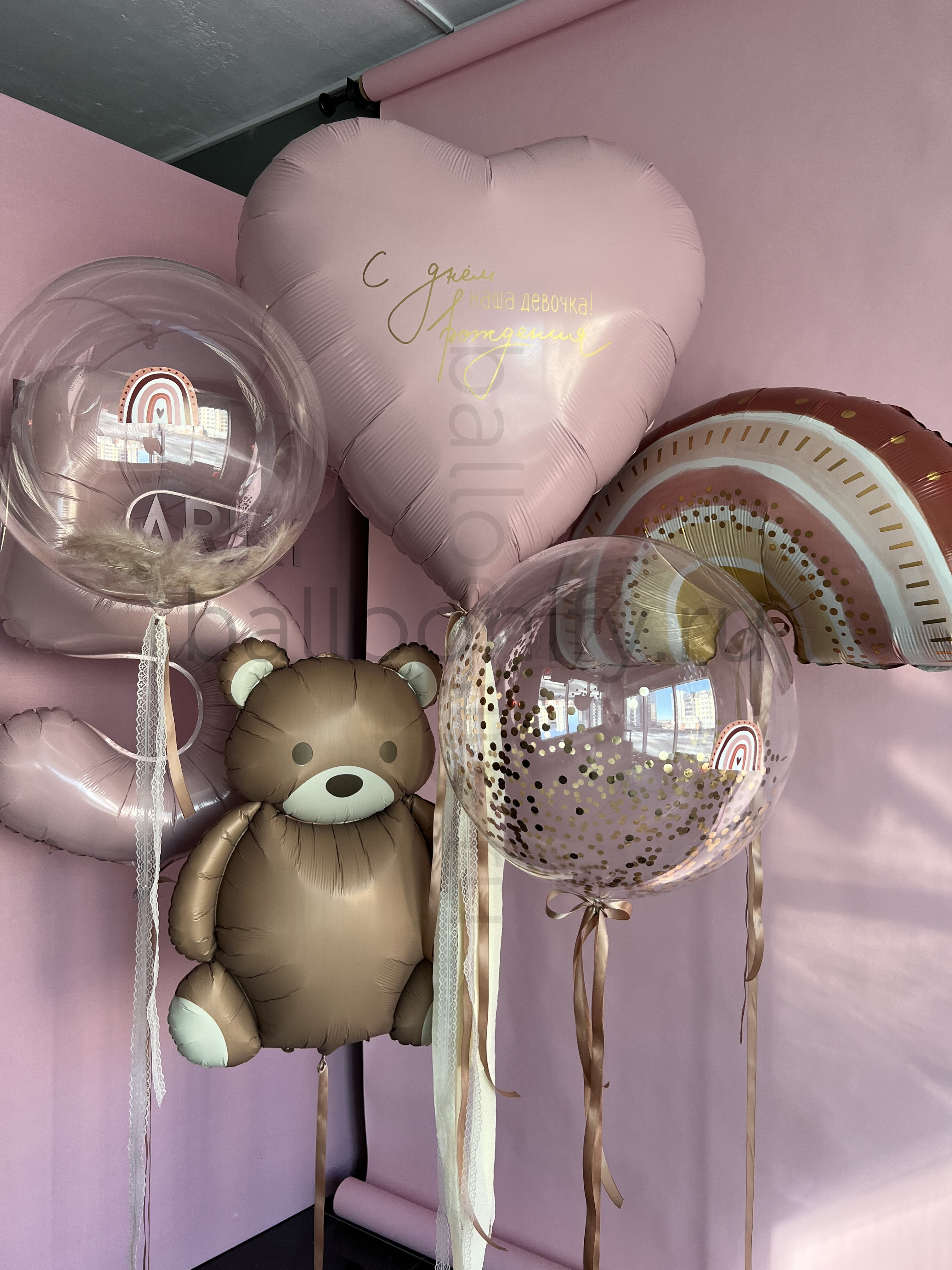 Нежная композиция из воздушных шаров для детского праздника: фольгированный медвежонок, большое розовое сердце с золотой надписью «С днём рождения, наша девочка!», радуга в пастельных тонах и прозрачные шары с конфетти и перьями, украшенные изящными лентами. Создаст волшебную атмосферу и подарит радость маленькой имениннице. 🌟