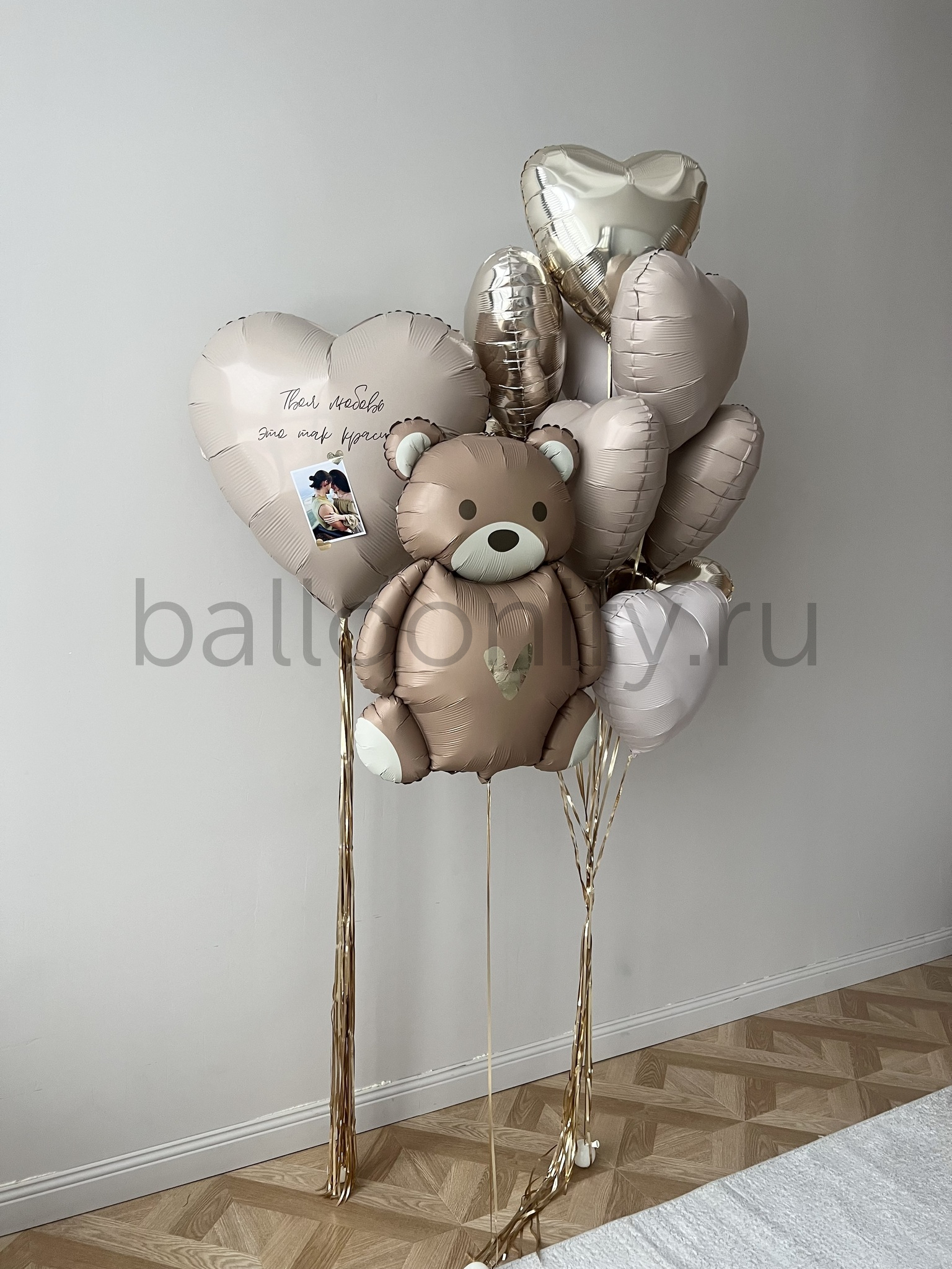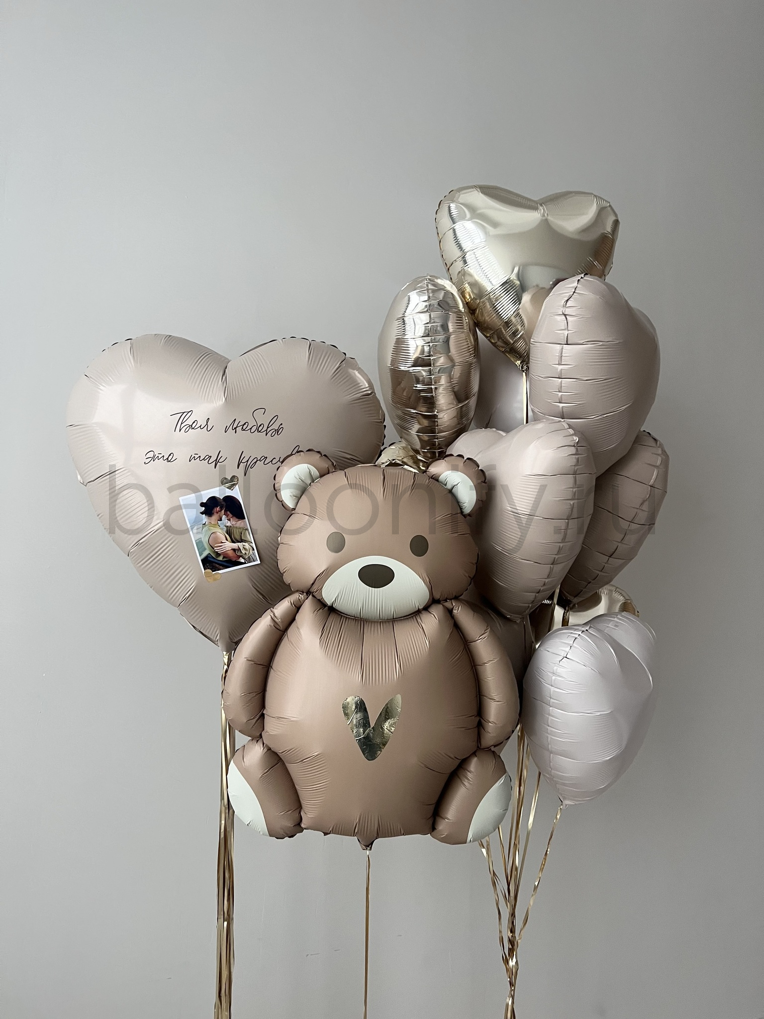 Роскошная коллекция воздушных шаров в благородных тонах кремового и шампань, создающая изысканную атмосферу праздника. Универсальный набор для торжественных событий, прекрасно подходящий для поздравления женщин и детей. Индивидуальное сердце с фотографией станет особенным элементом вашего поздравления.