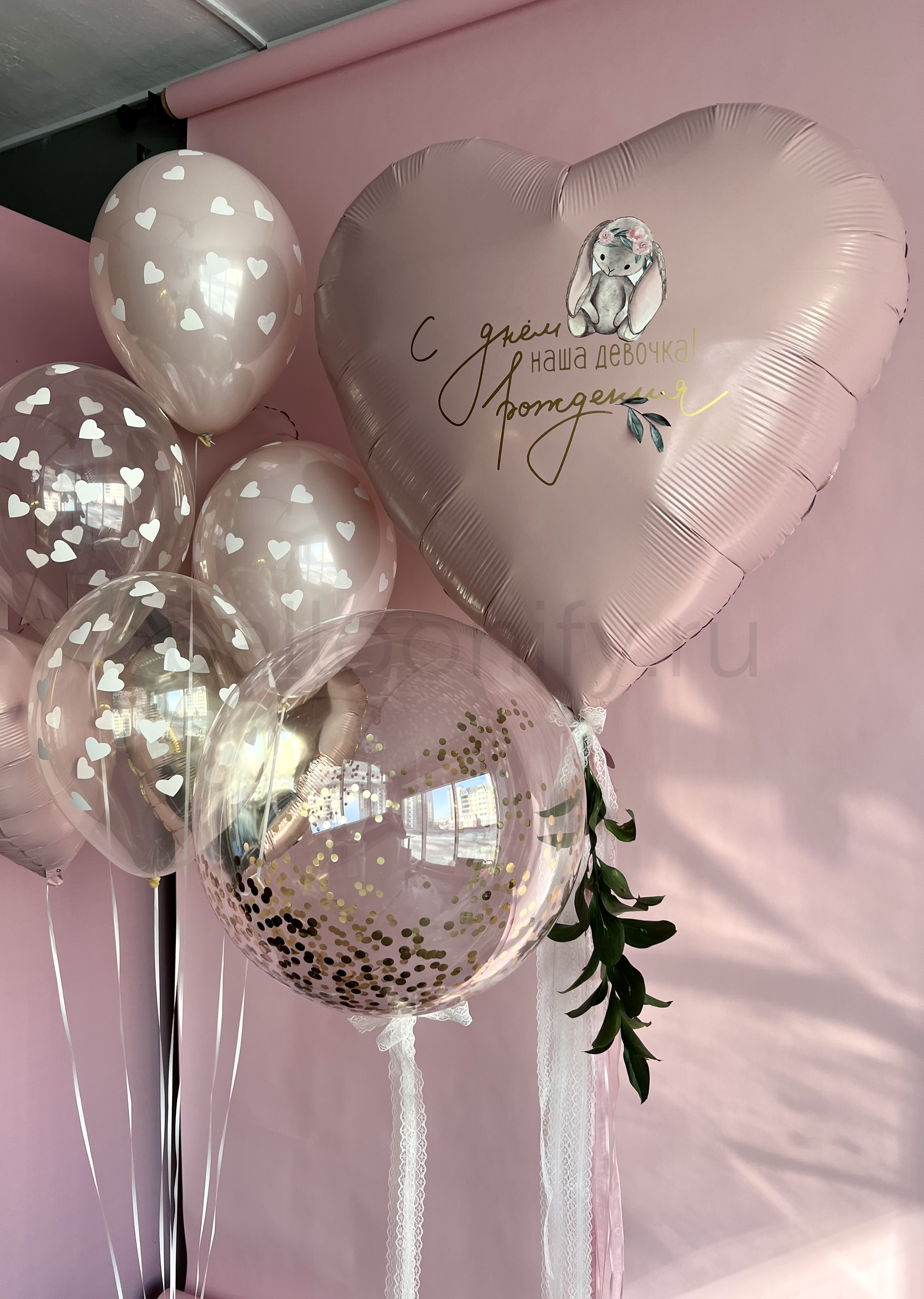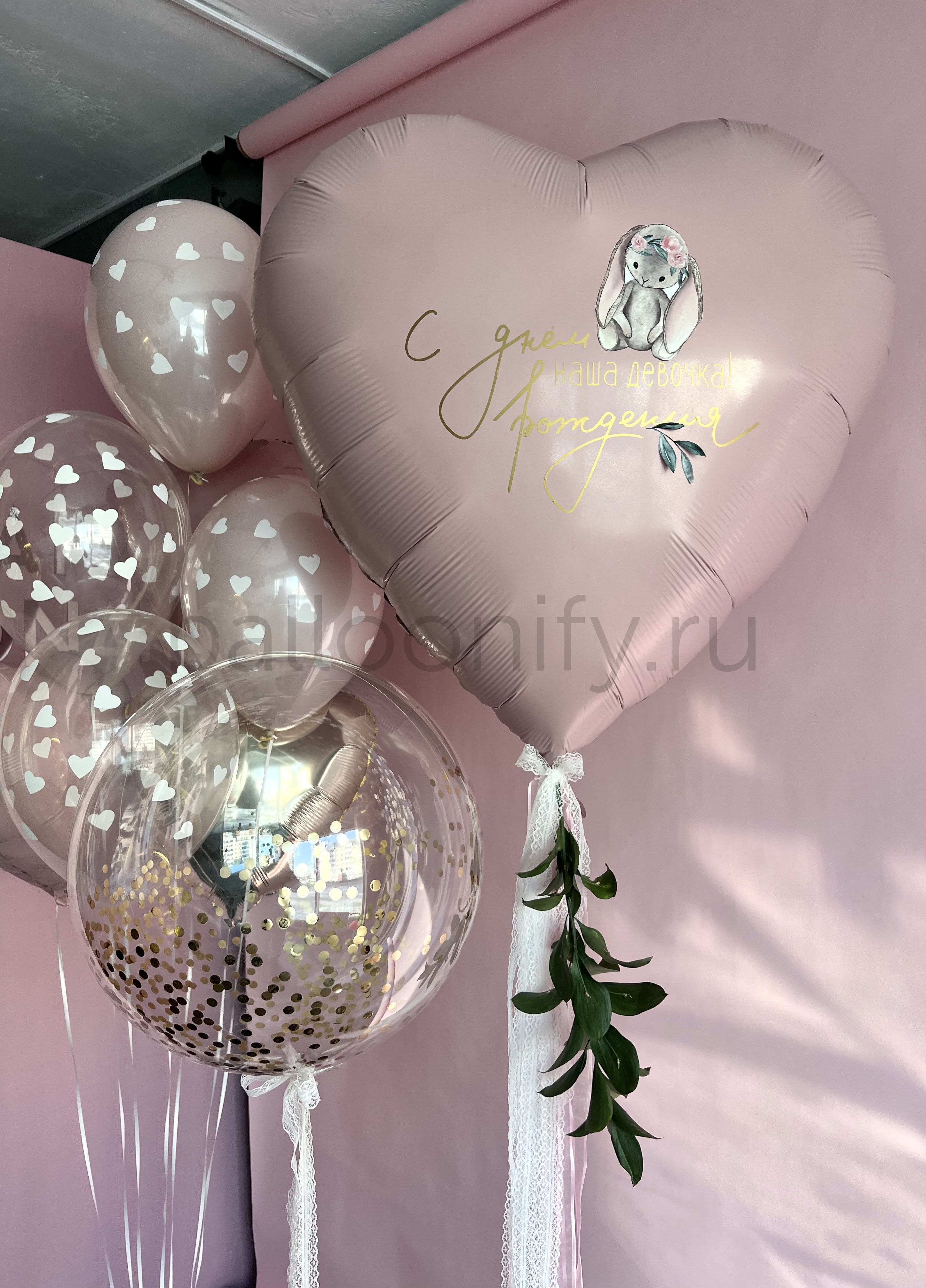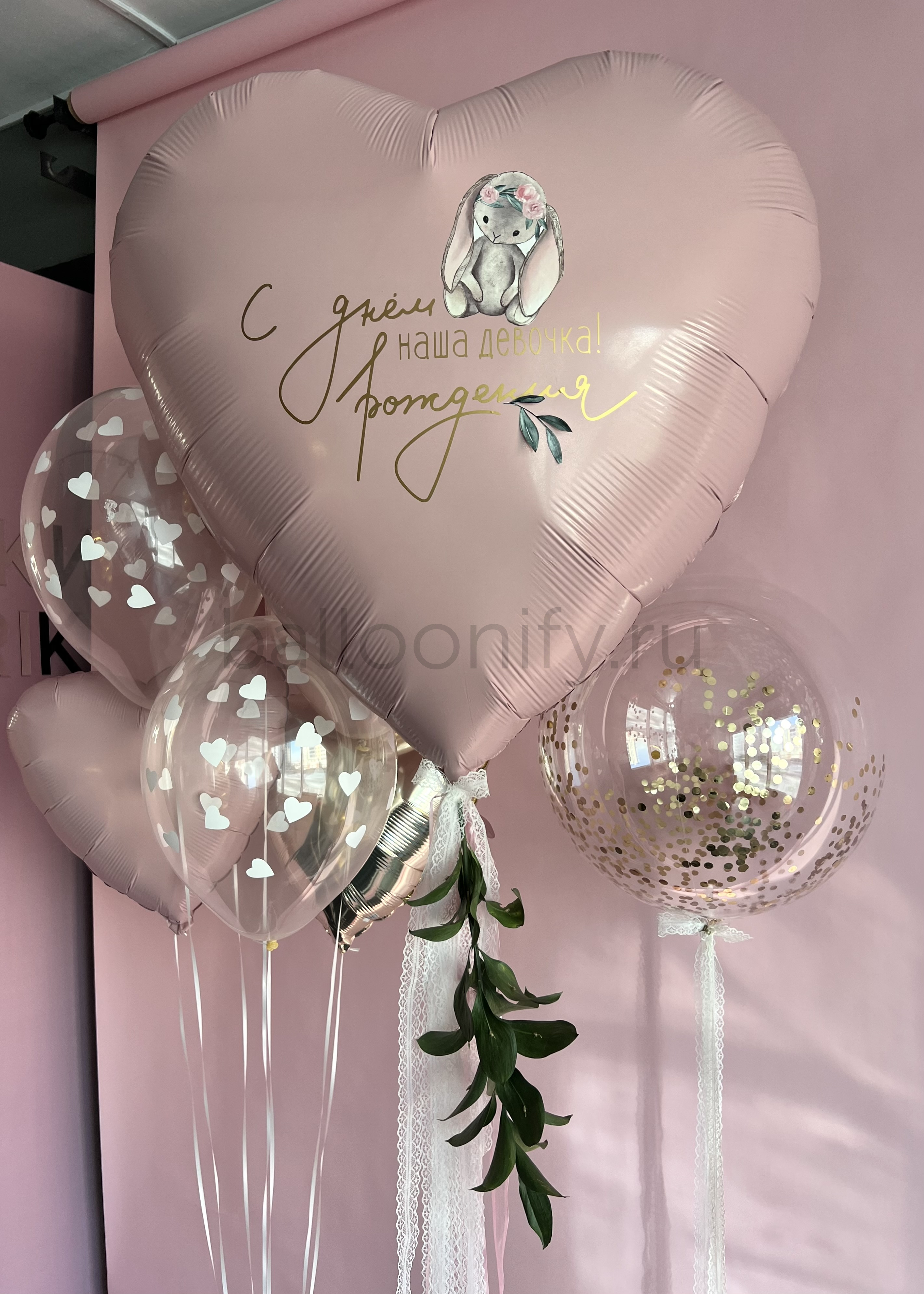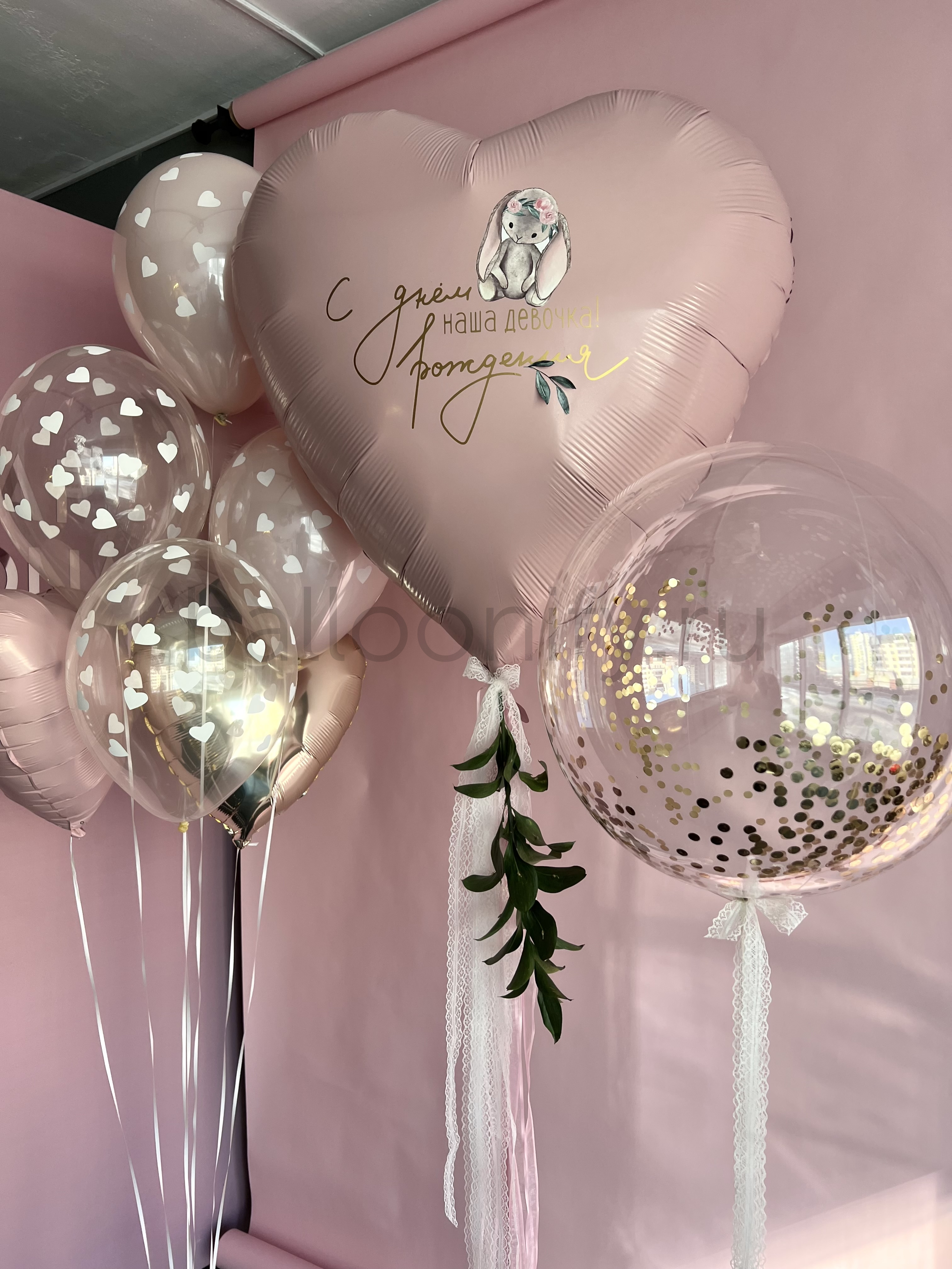 Нежная композиция из гелиевых шаров для детского праздника: в центре — большой фольгированный шар-сердце пудрового оттенка с трогательной надписью «С днём рождения, наша девочка!» и милым изображением зайчика в цветочной короне. Дополнена прозрачными шарами с белыми сердечками, блестящим шаром с золотым конфетти, изящными кружевными лентами и веточкой зелени. Создаёт атмосферу уюта и радости — идеально для дня рождения маленькой принцессы. 🌟