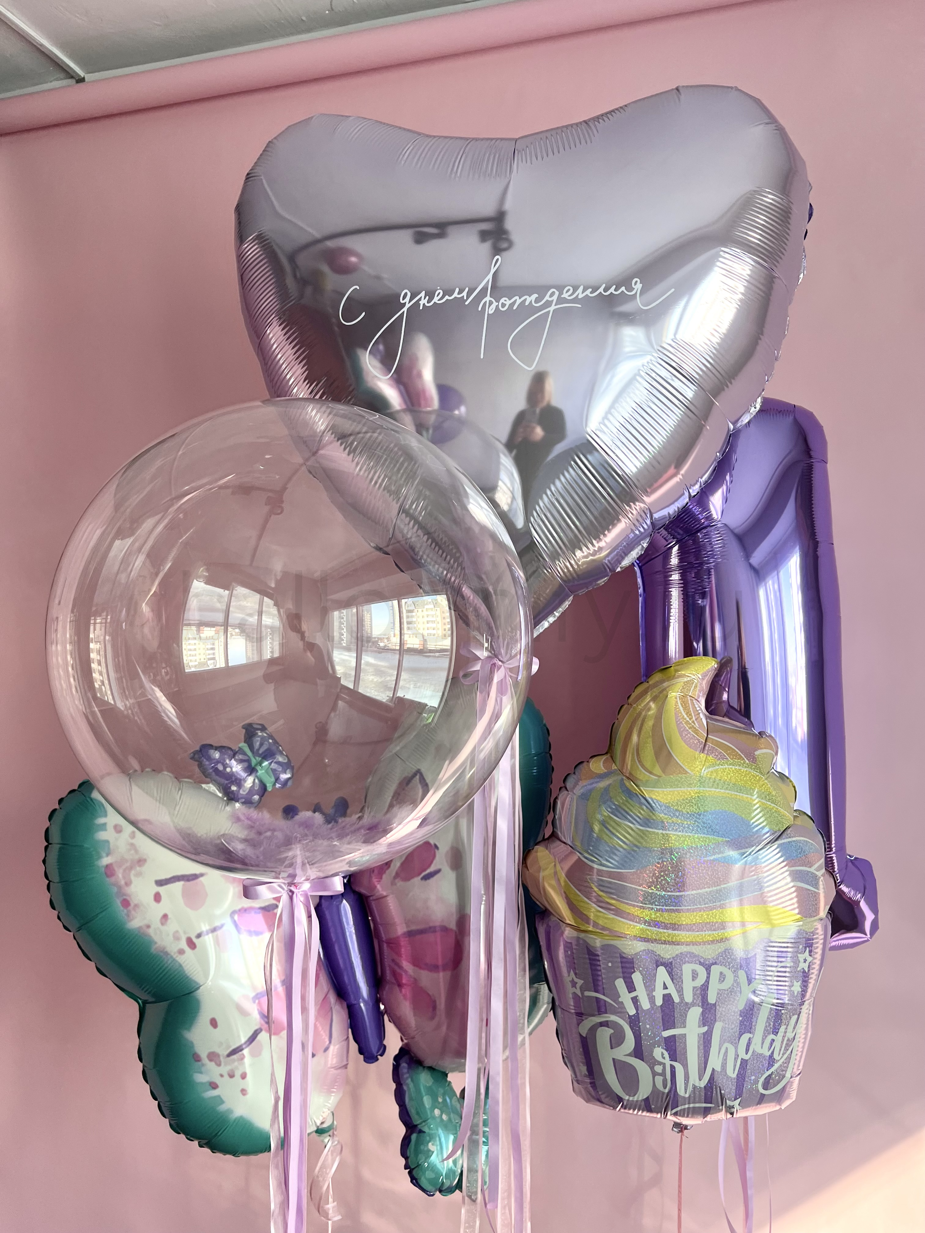 Элегантная композиция из воздушных шаров для дня рождения: большое серебристое сердце с изящной надписью «С днём рождения», блестящая фиолетовая цифра «1», прозрачный шар, яркие шары в форме бабочек с нежным цветочным рисунком, а также шар в виде кекса с радужной глазурью и надписью «Happy Birthday». Нежные ленты завершают образ, придавая композиции лёгкость и праздничность. 🌟