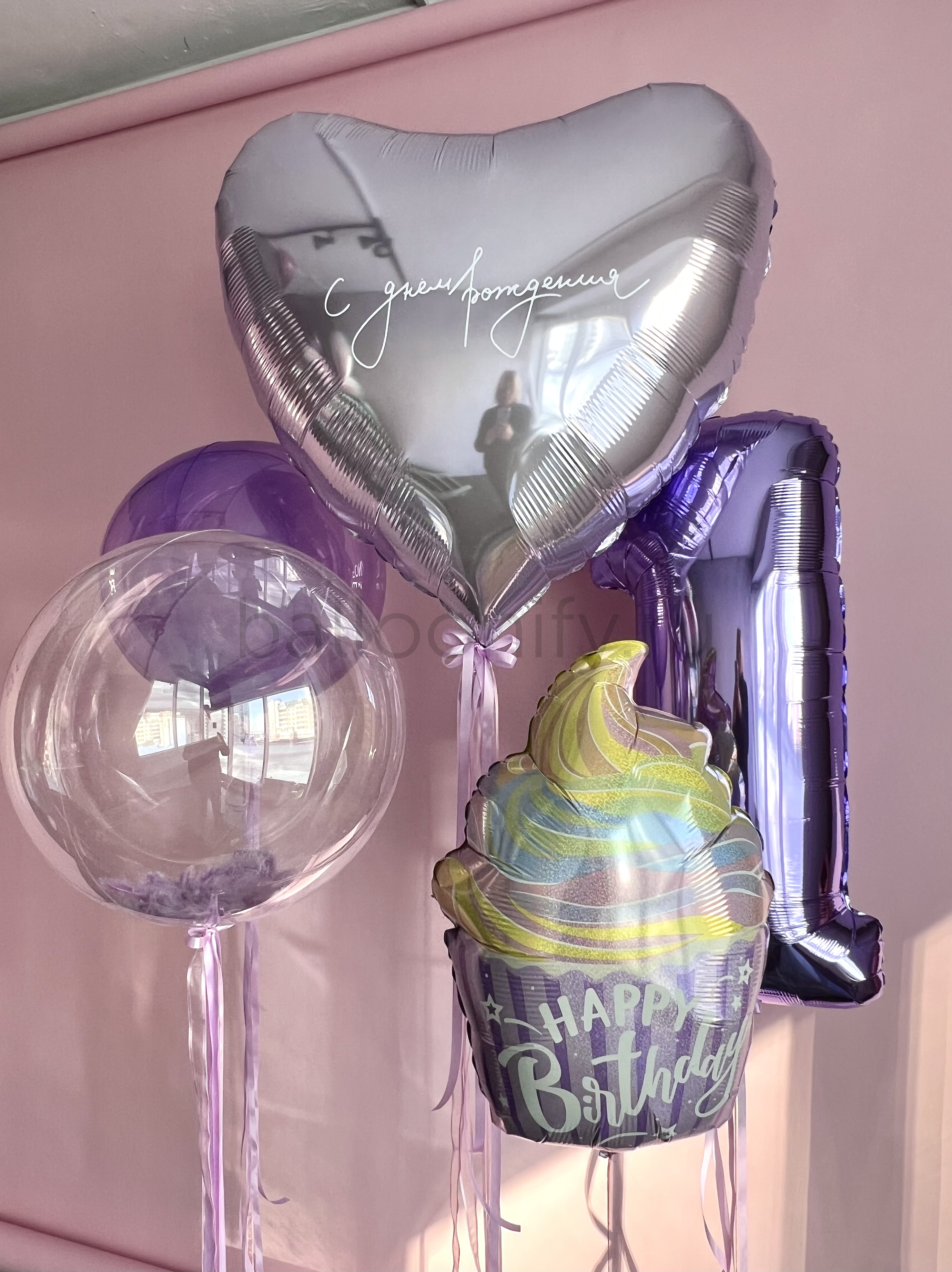 Нежная композиция из гелиевых шаров для празднования первого дня рождения: серебристое сердце с надписью «С днём рождения», фиолетовый шар, прозрачный шар-пузырь с сиреневым наполнением, яркий шар в виде кекса с радужной глазурью и надписью «Happy Birthday», а также большая фиолетовая цифра «1». Элегантные ленты и гармоничная цветовая гамма создадут праздничную атмосферу. 🌟
