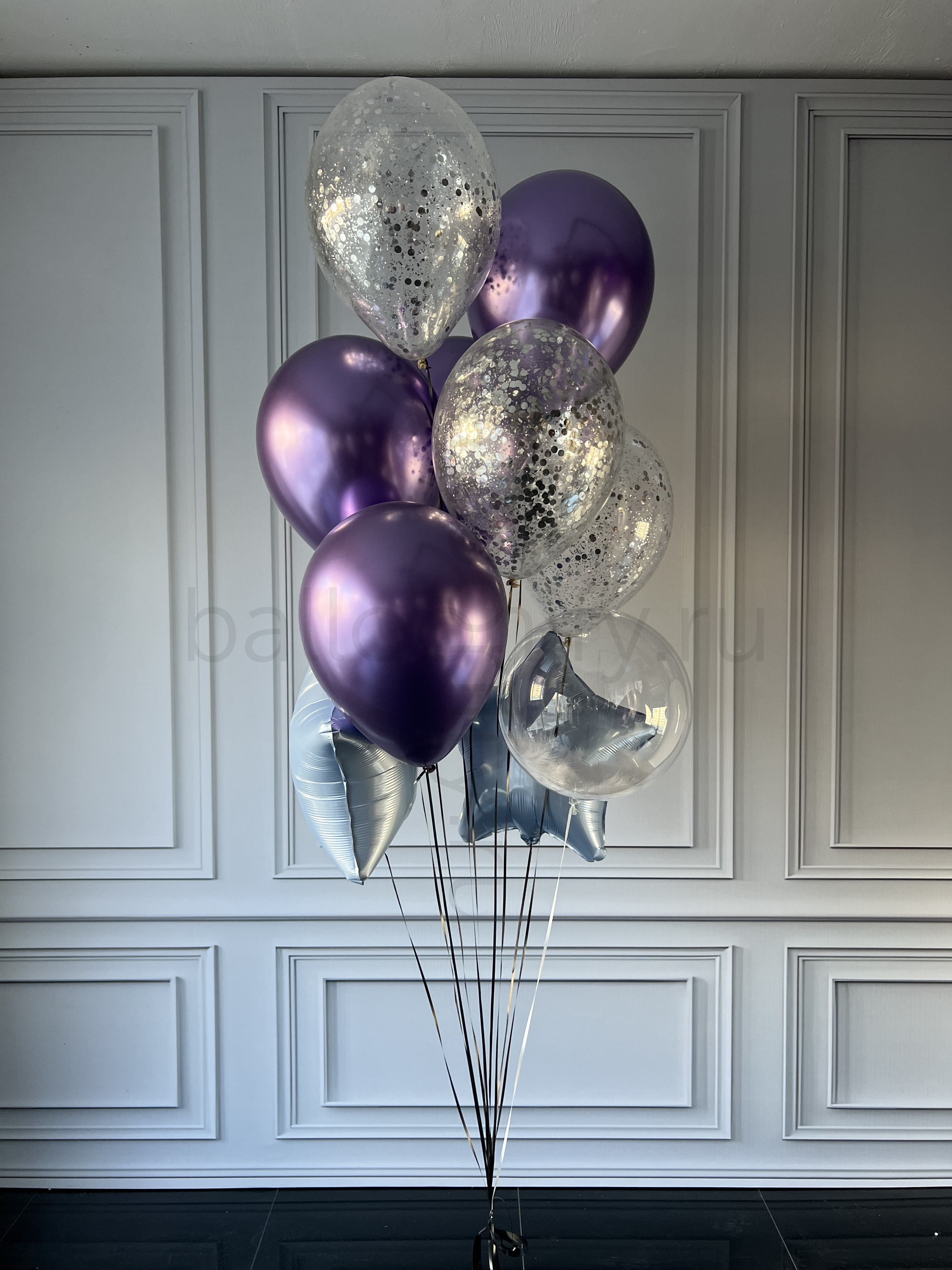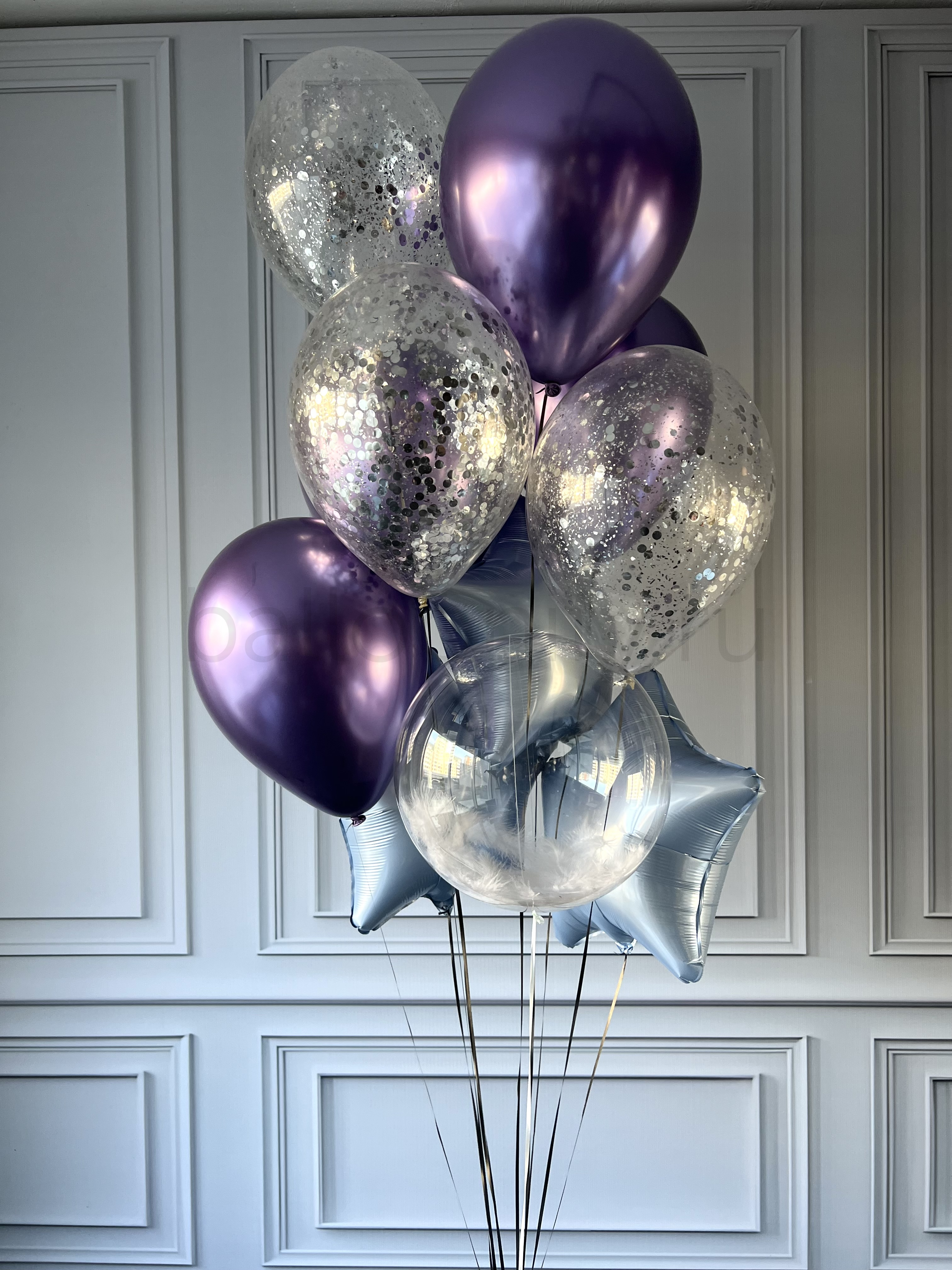 Элегантная композиция из гелиевых шаров: сочетание блестящих хромированных фиолетовых шаров, прозрачных шаров с серебристым конфетти и изящных шаров-звёзд в светло-голубом оттенке. Гармоничное сочетание цветов и фактур создаёт праздничный, но сдержанный образ — идеально для дня рождения, юбилея или другого особого события. 🌟