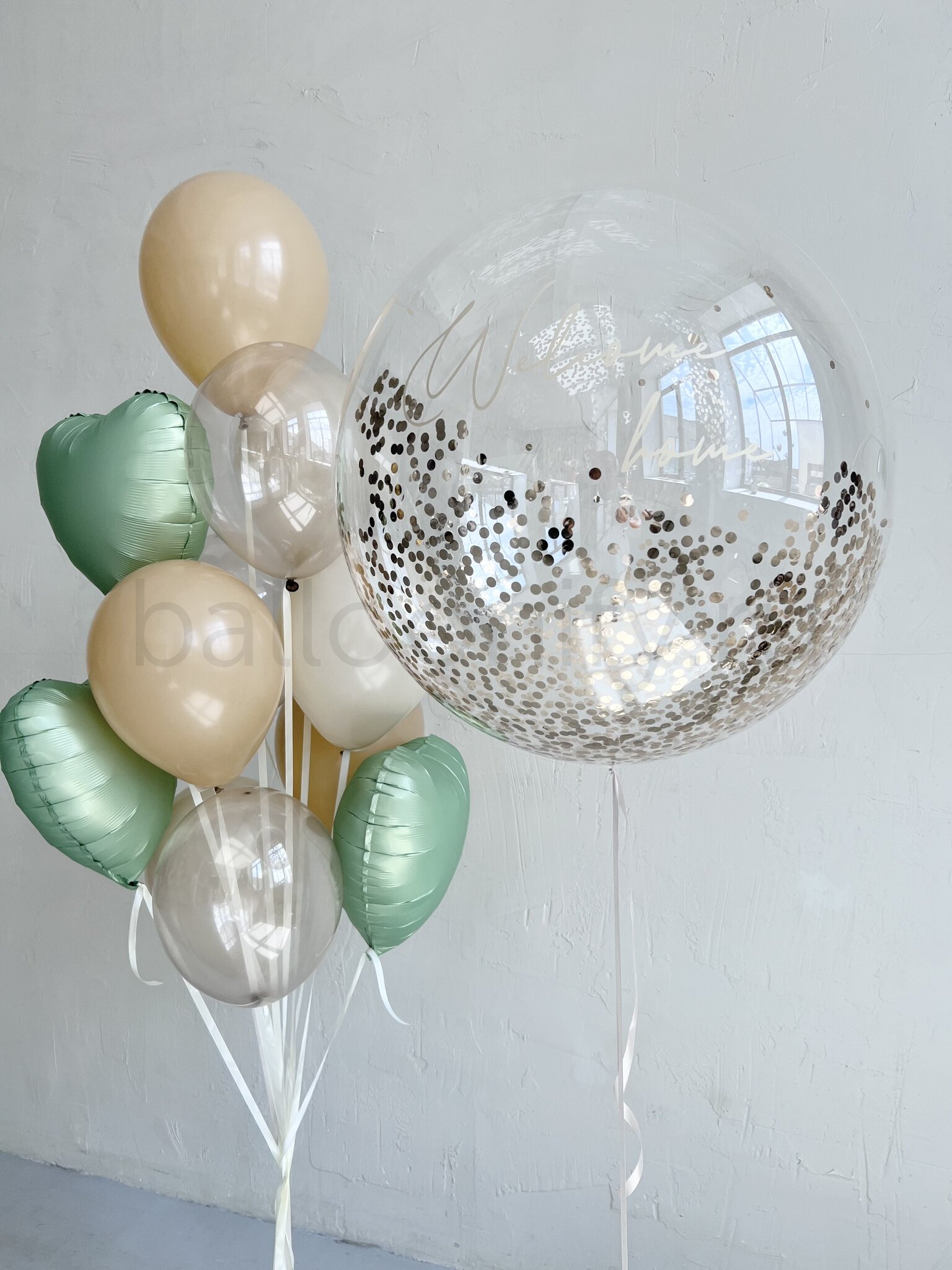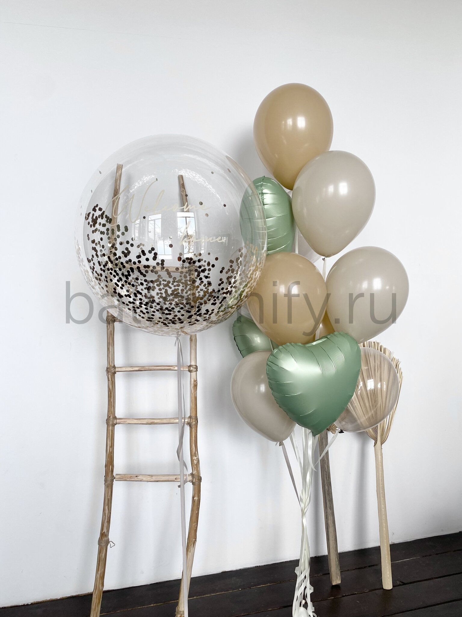 Представляем нежную композицию воздушных шаров для особенных событий в жизни. Центральный элемент – впечатляющий прозрачный шар баблс 61 см наполненный конфетти и с возможностью нанесения индивидуальной надписи. Сочетание природных оттенков создает атмосферу уюта и нежности.🎈