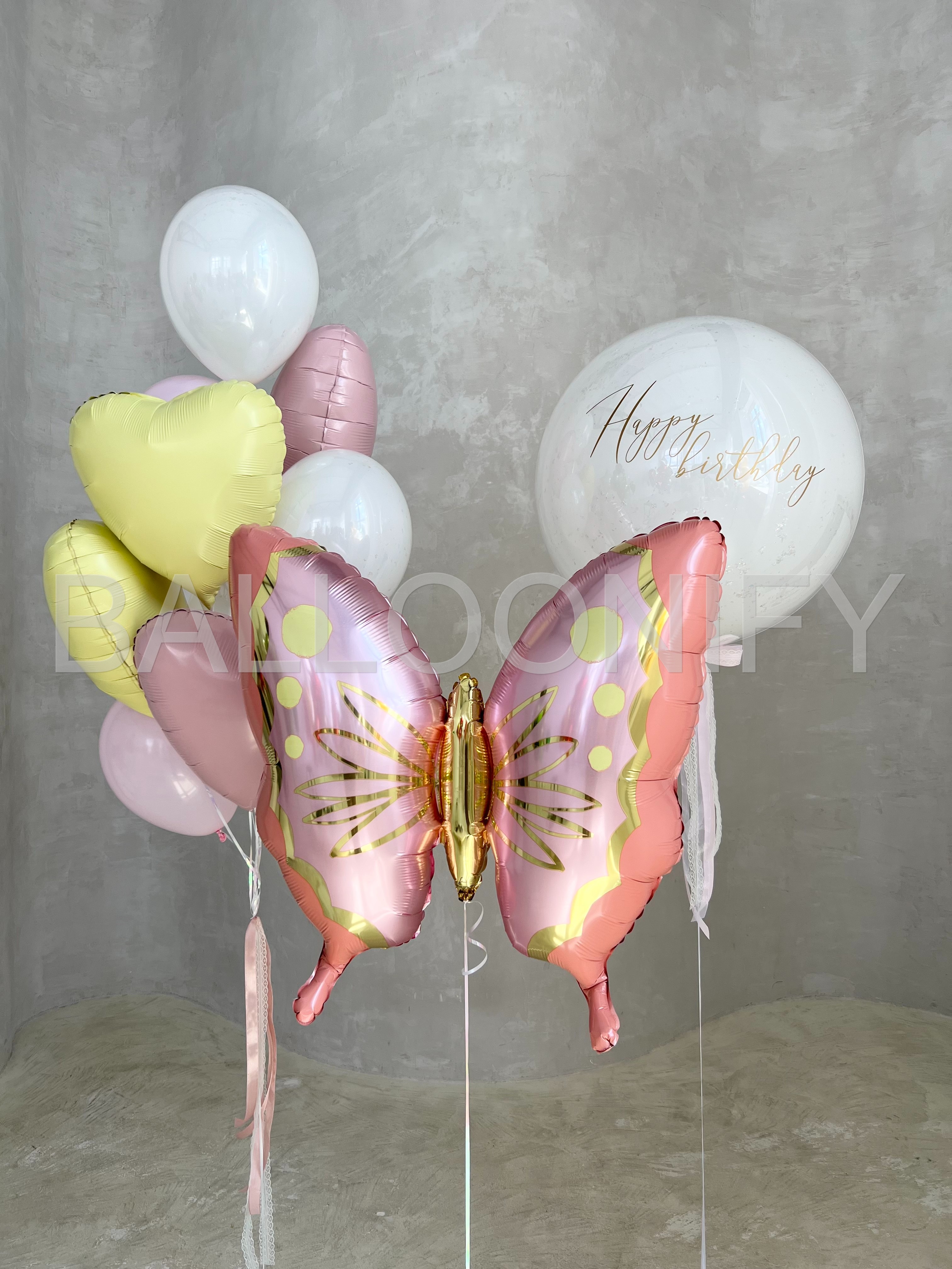 Нежный букет воздушных шаров для дня рождения: большая бабочка в розово-золотых тонах, воздушные шары пастельных оттенков (жёлтые, розовые, белые) и стильный шар с надписью «Happy Birthday» в золотом курсиве. Создаст волшебную атмосферу и станет ярким украшением праздника! 🌟