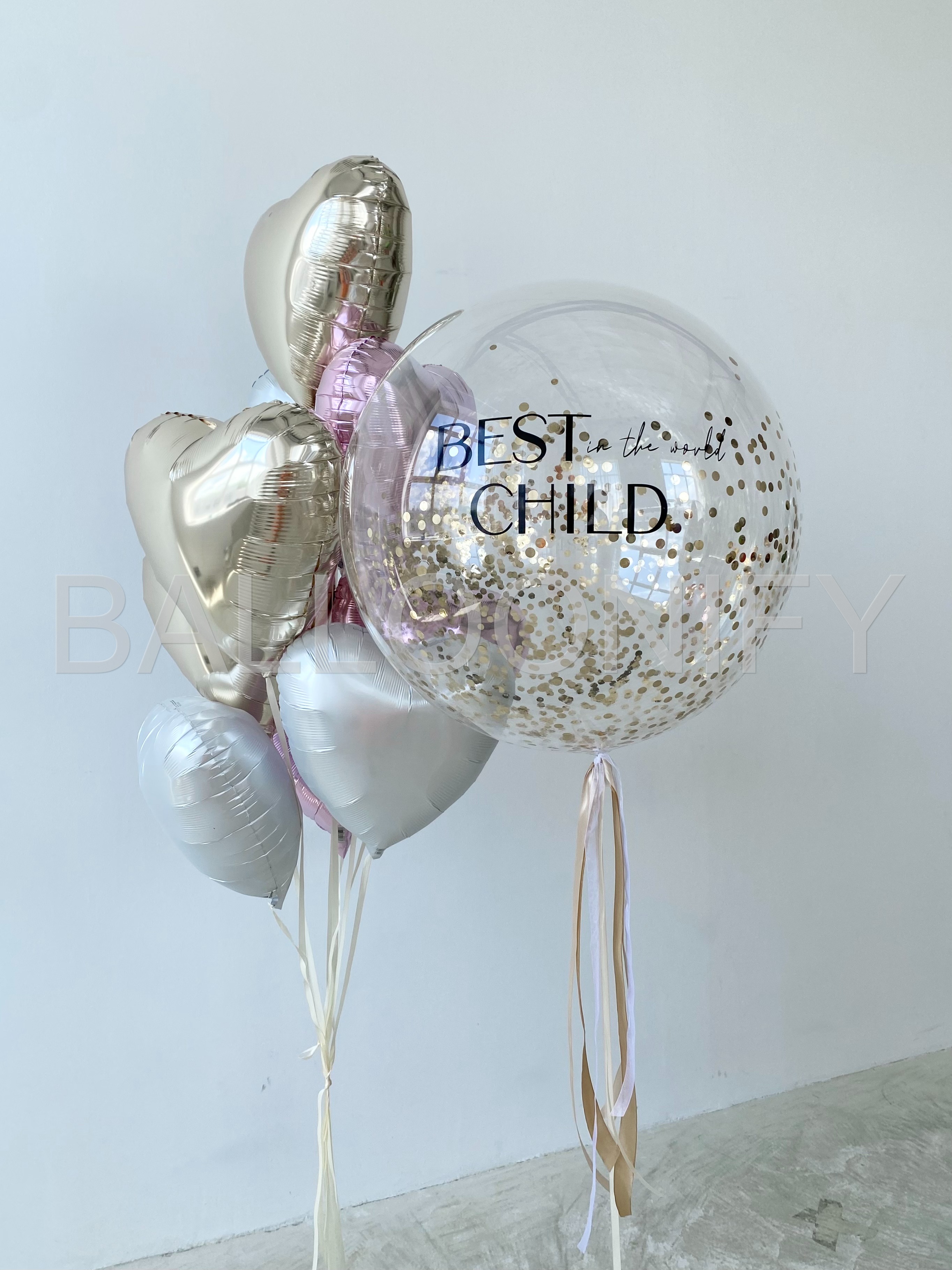Изящная композиция из воздушных шаров для особенного праздника: в центре — прозрачный шар с золотыми конфетти и трогательной надписью «BEST CHILD in the world», окружённый блестящими фольгированными шарами в форме сердец белого, золотистого и нежно-розового цвета. Элегантные ленты завершают образ, придавая композиции утончённость. 🌟