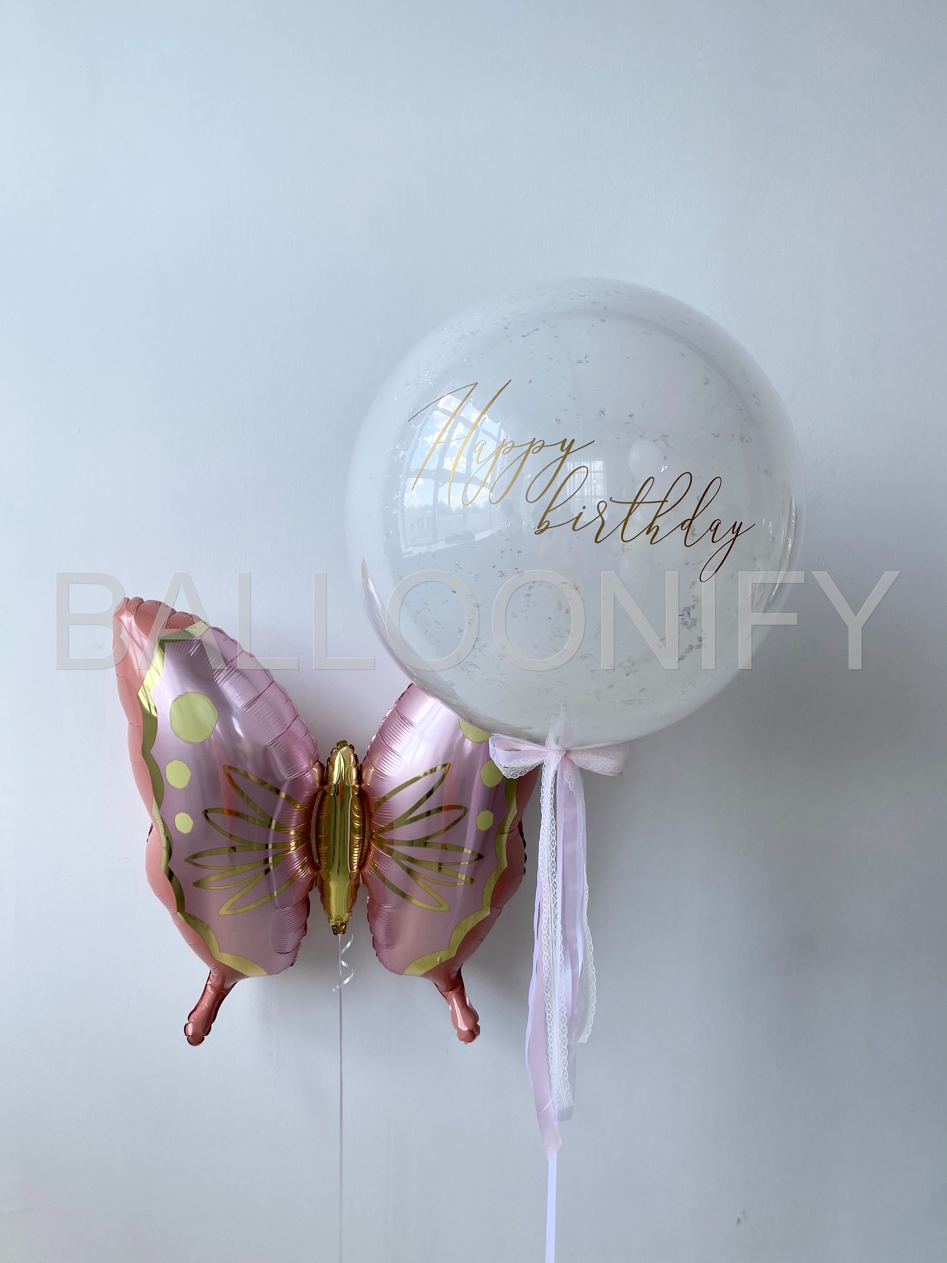 Элегантный набор воздушных шаров для праздника: стеклянный шар с изящной золотой надписью «Happy Birthday» и блестящими вкраплениями, дополненный роскошной бабочкой из фольги в нежно-розовых и золотых тонах. Идеальный декор для дня рождения — добавит нотку утончённости и создаст праздничное настроение! 🌟