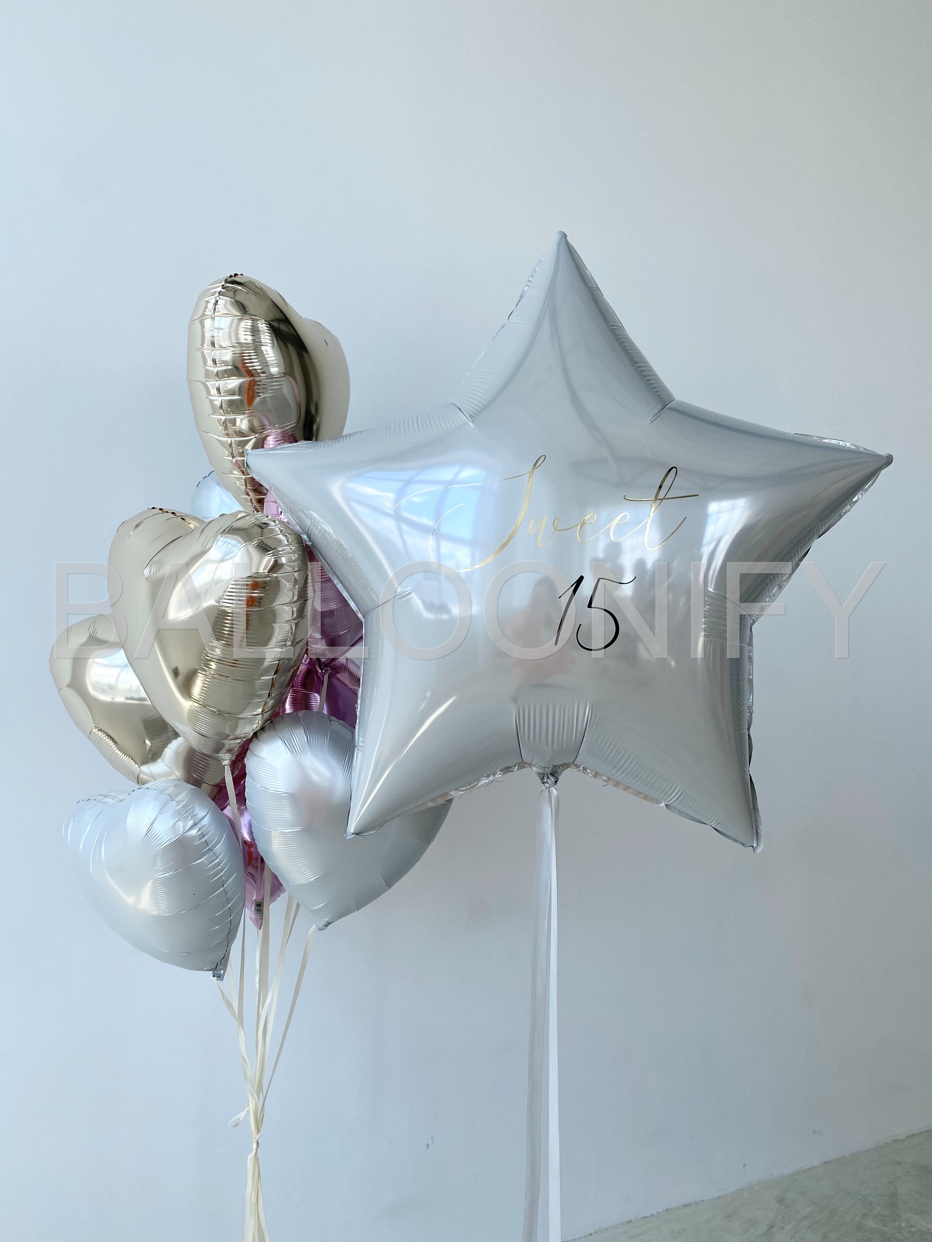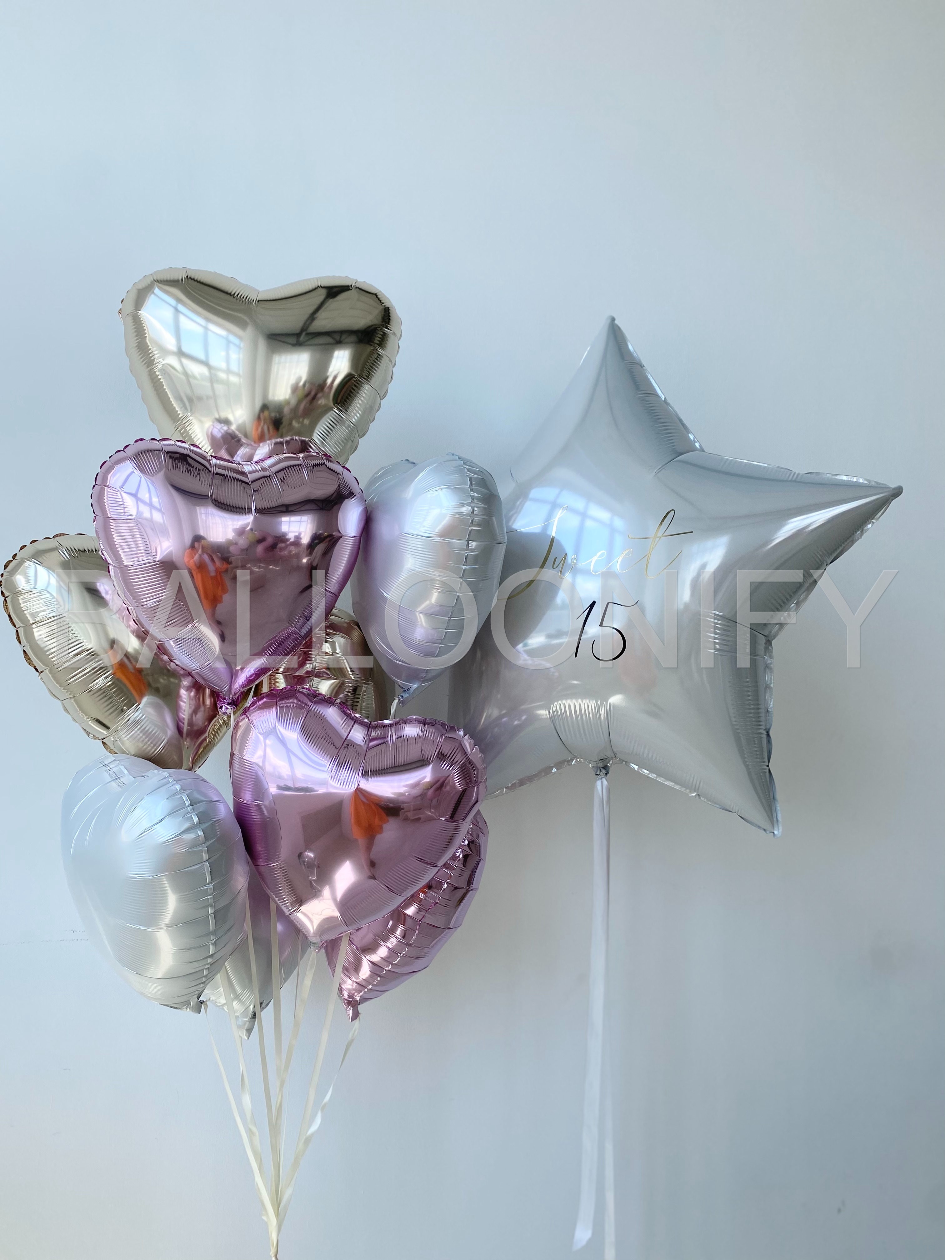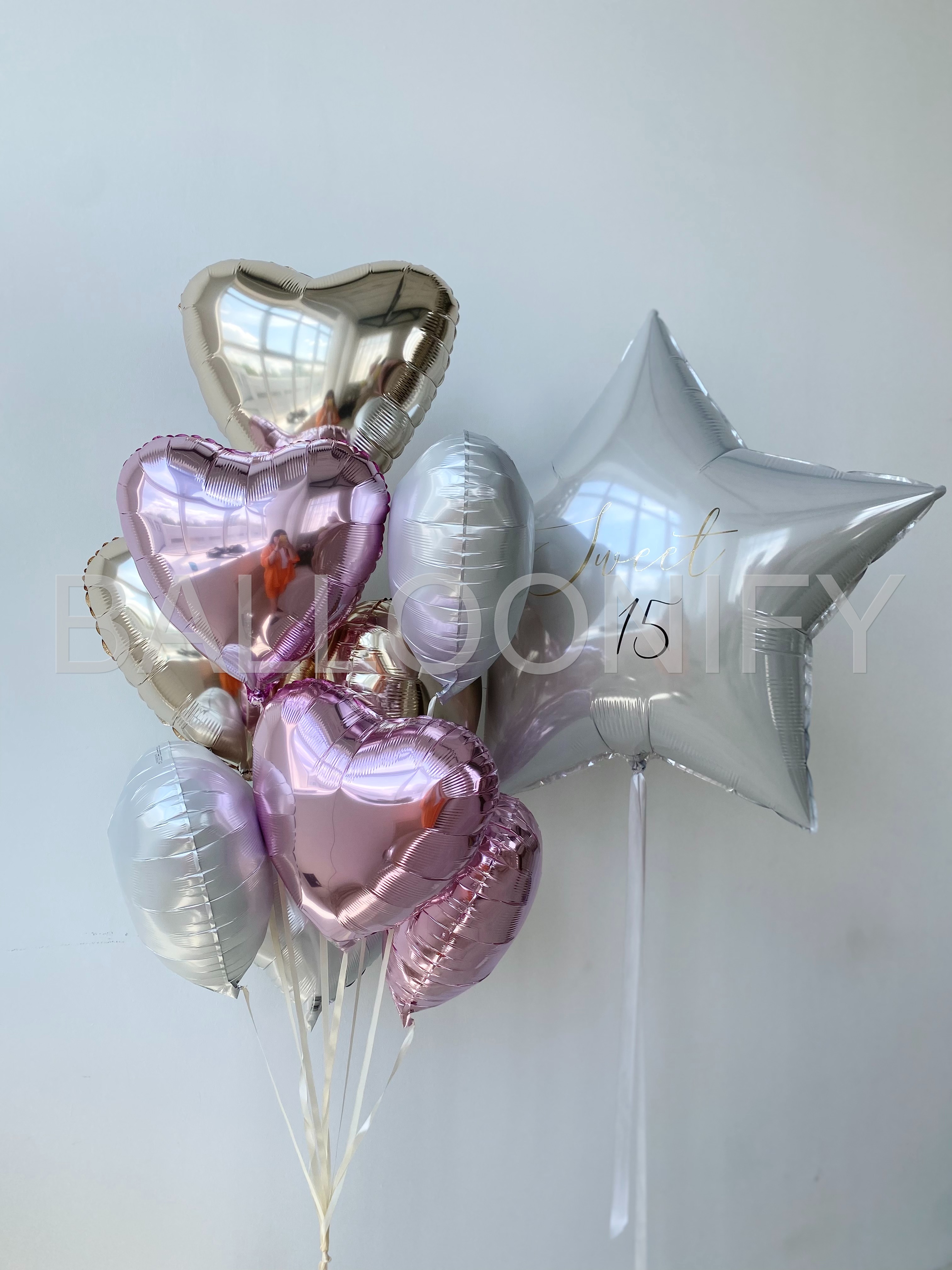 Элегантный букет из фольгированных шаров — идеальное украшение для особенного праздника! В композиции сочетаются нежные розовые и золотистые сердца, дополненные крупной звездой с изысканной надписью «Sweet 15». Блестящая поверхность шаров придаёт набору торжественность и утончённость, а гармоничное сочетание оттенков создаёт атмосферу нежности и радости. Преобразите пространство для дня рождения, романтического события или любого важного момента с этим стильным декором! 🌟