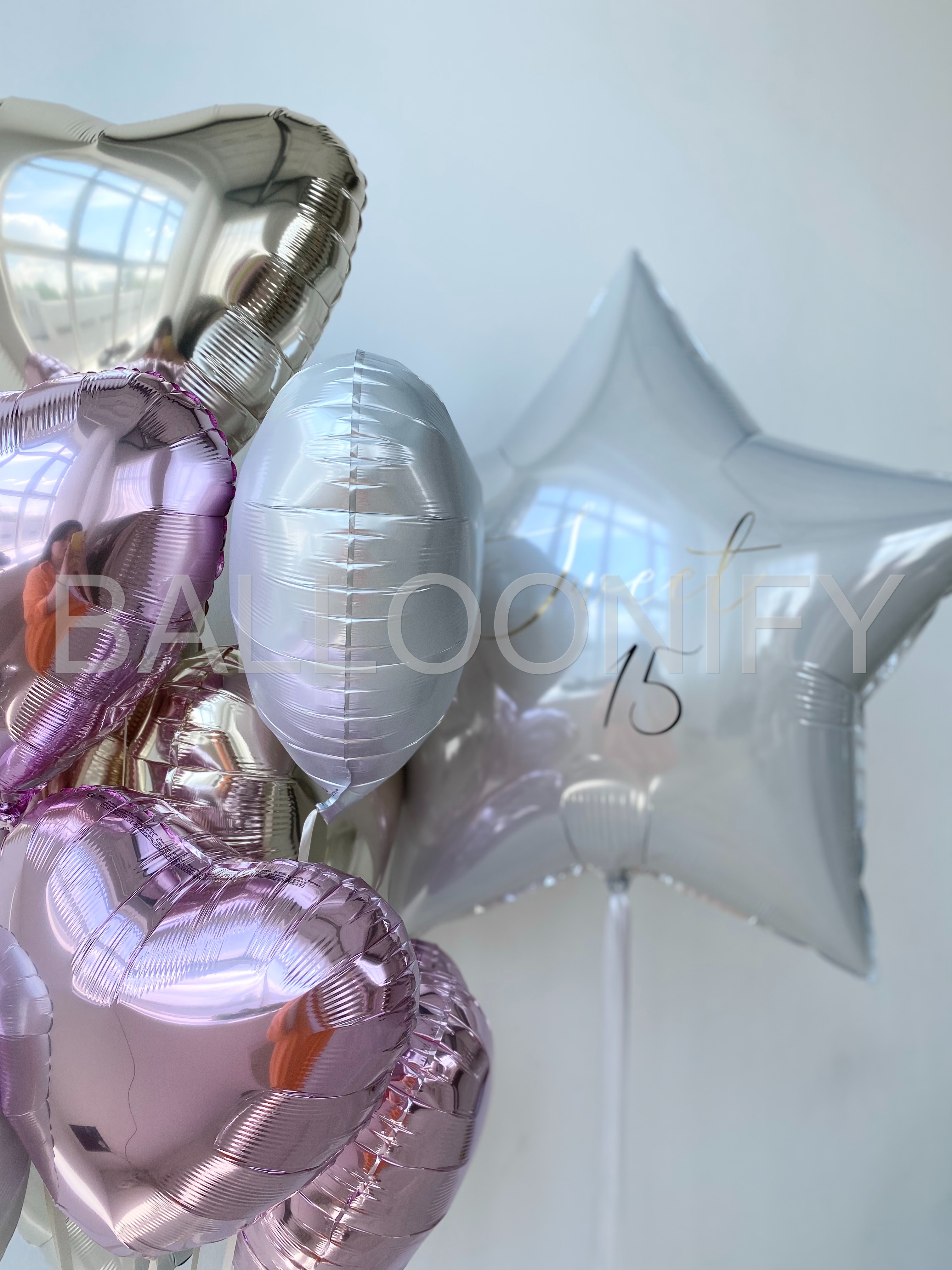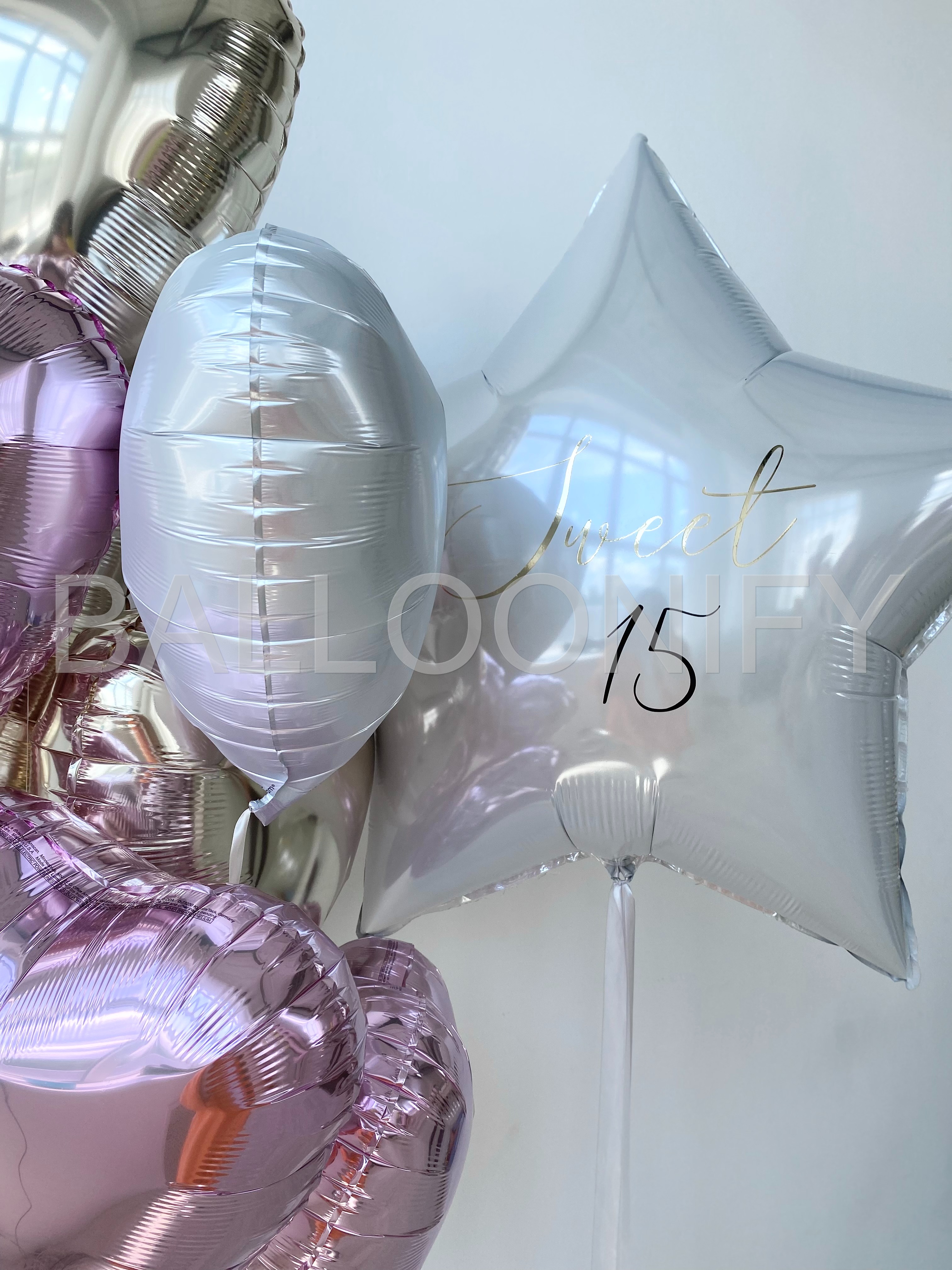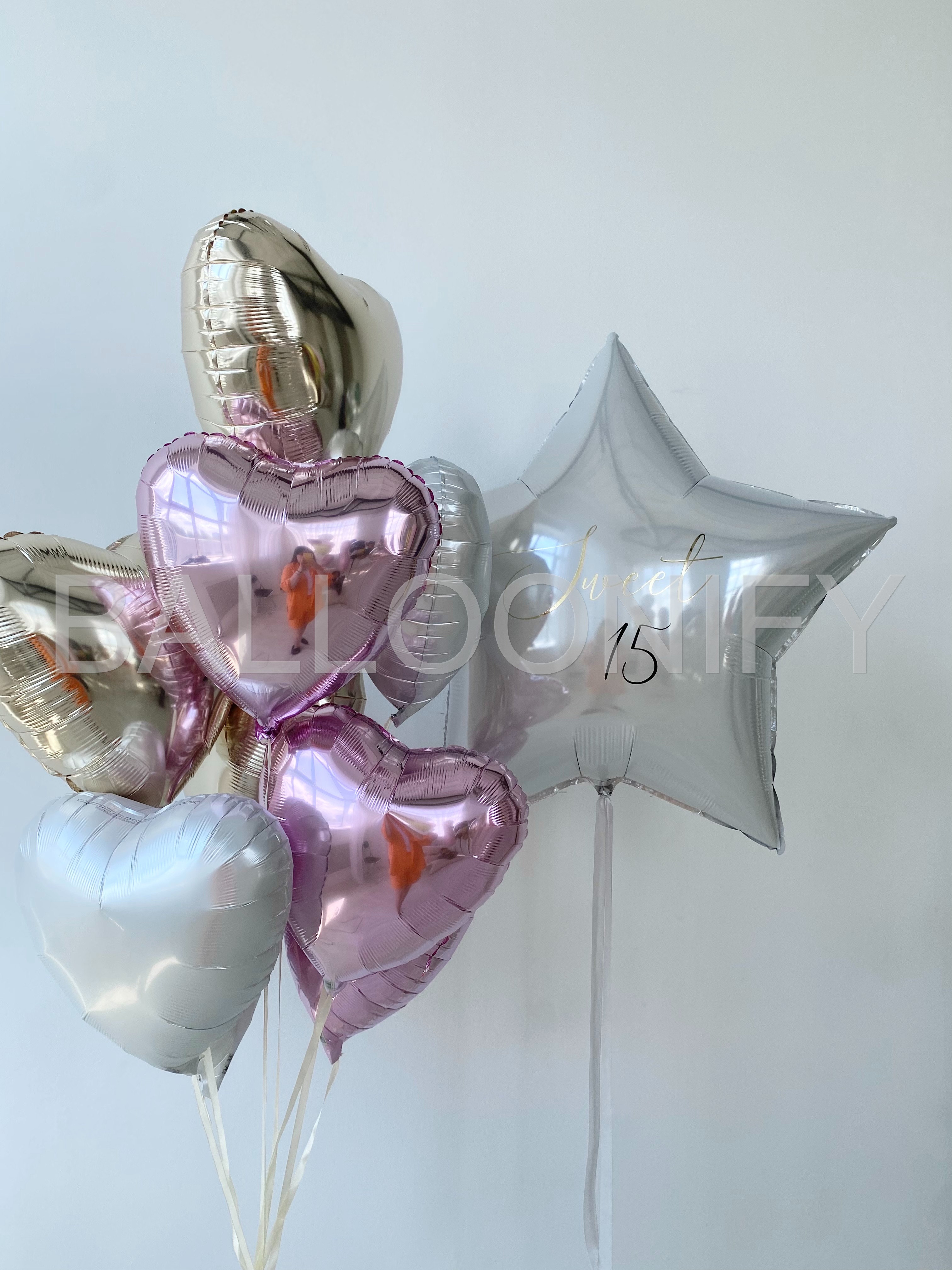 Элегантный букет из фольгированных шаров — идеальное украшение для особенного праздника! В композиции сочетаются нежные розовые и золотистые сердца, дополненные крупной звездой с изысканной надписью «Sweet 15». Блестящая поверхность шаров придаёт набору торжественность и утончённость, а гармоничное сочетание оттенков создаёт атмосферу нежности и радости. Преобразите пространство для дня рождения, романтического события или любого важного момента с этим стильным декором! 🌟