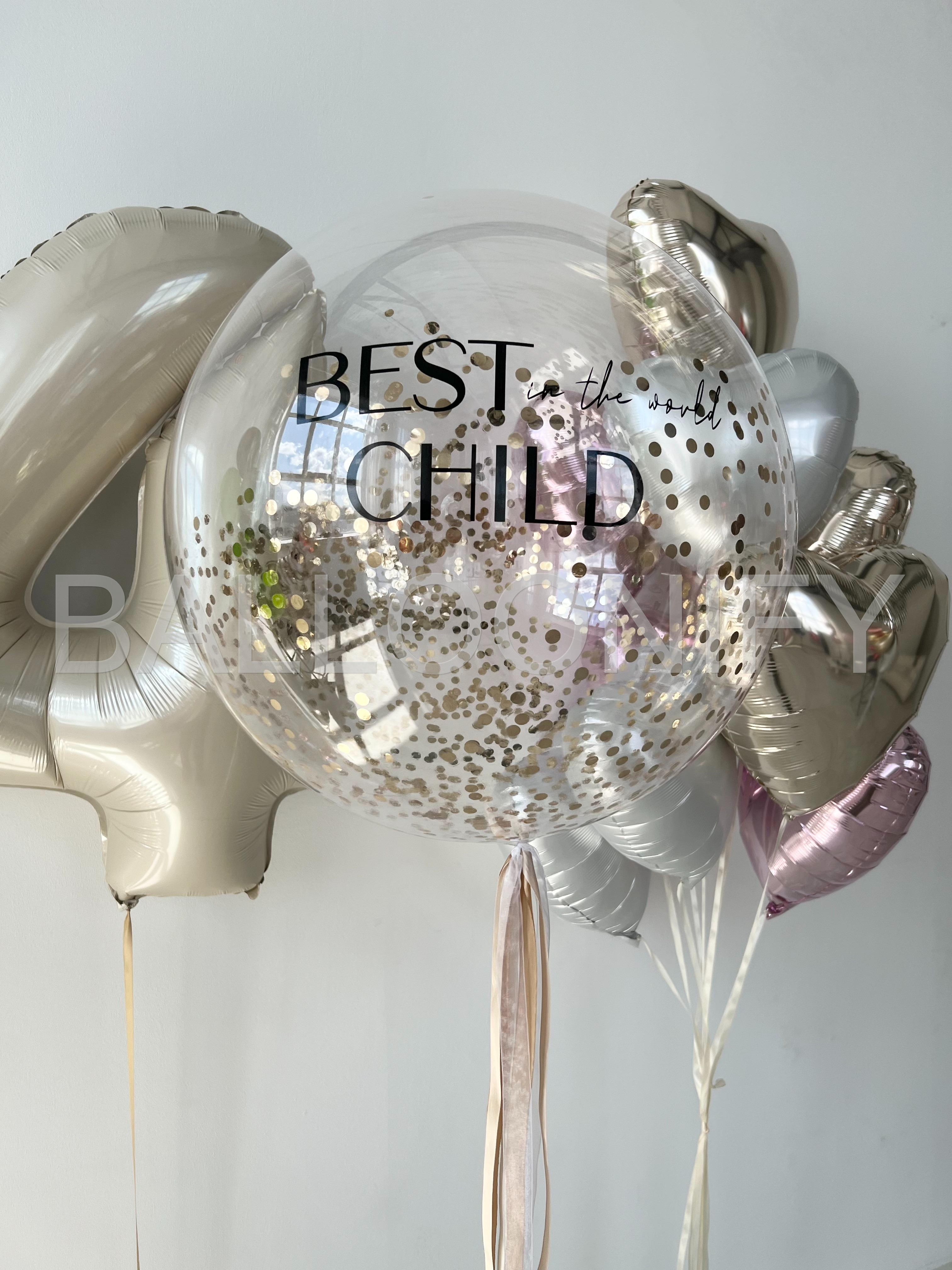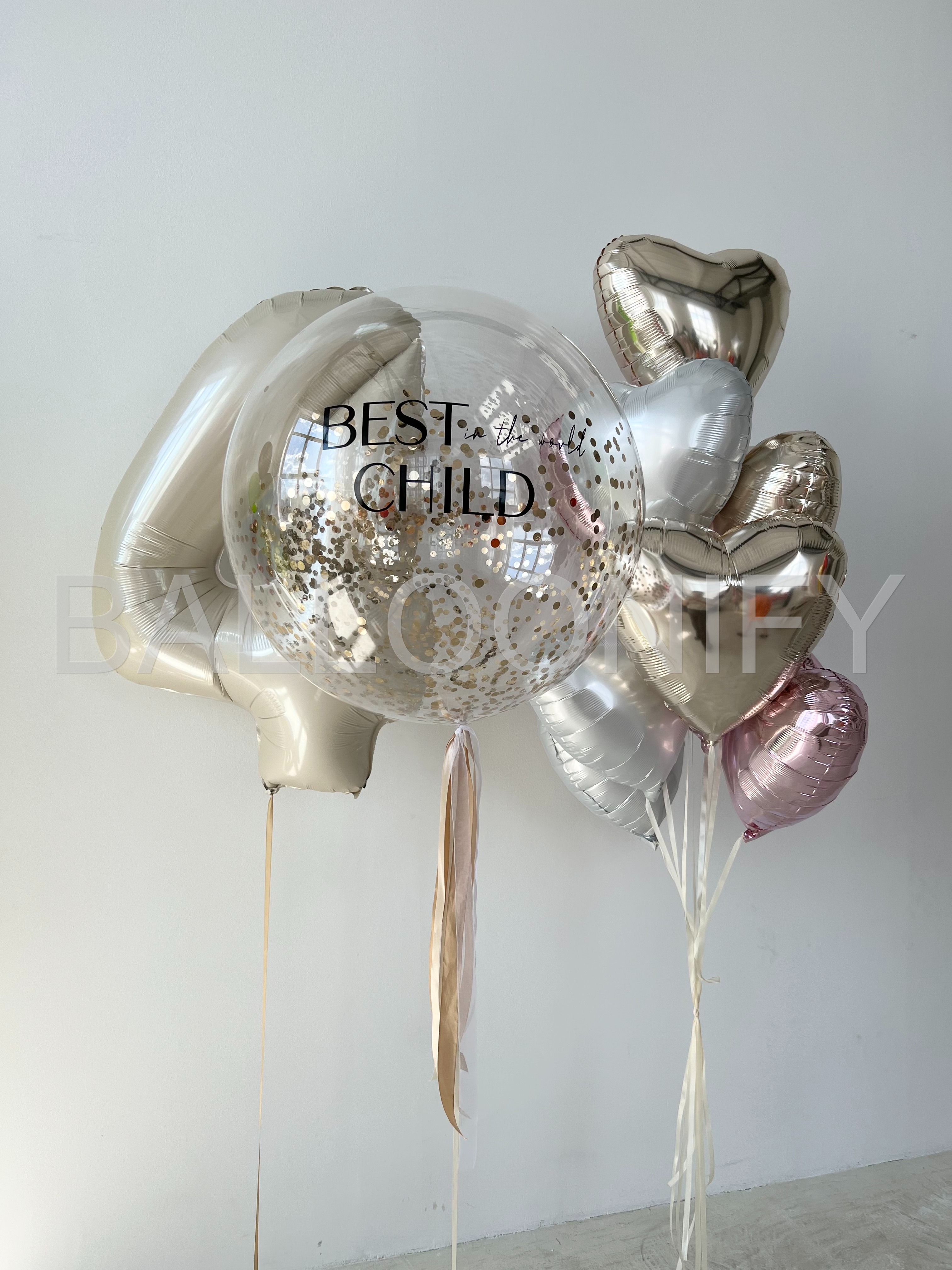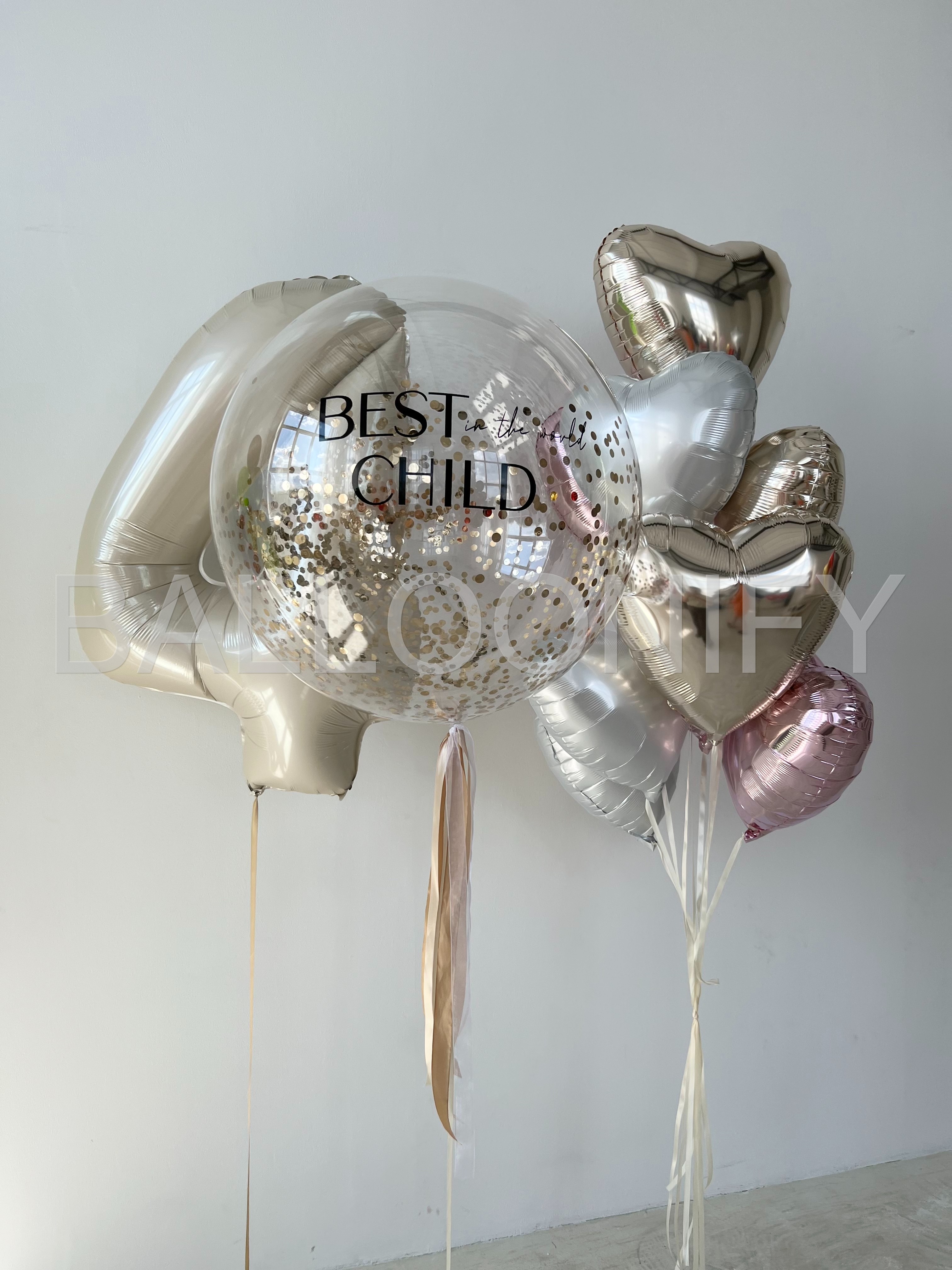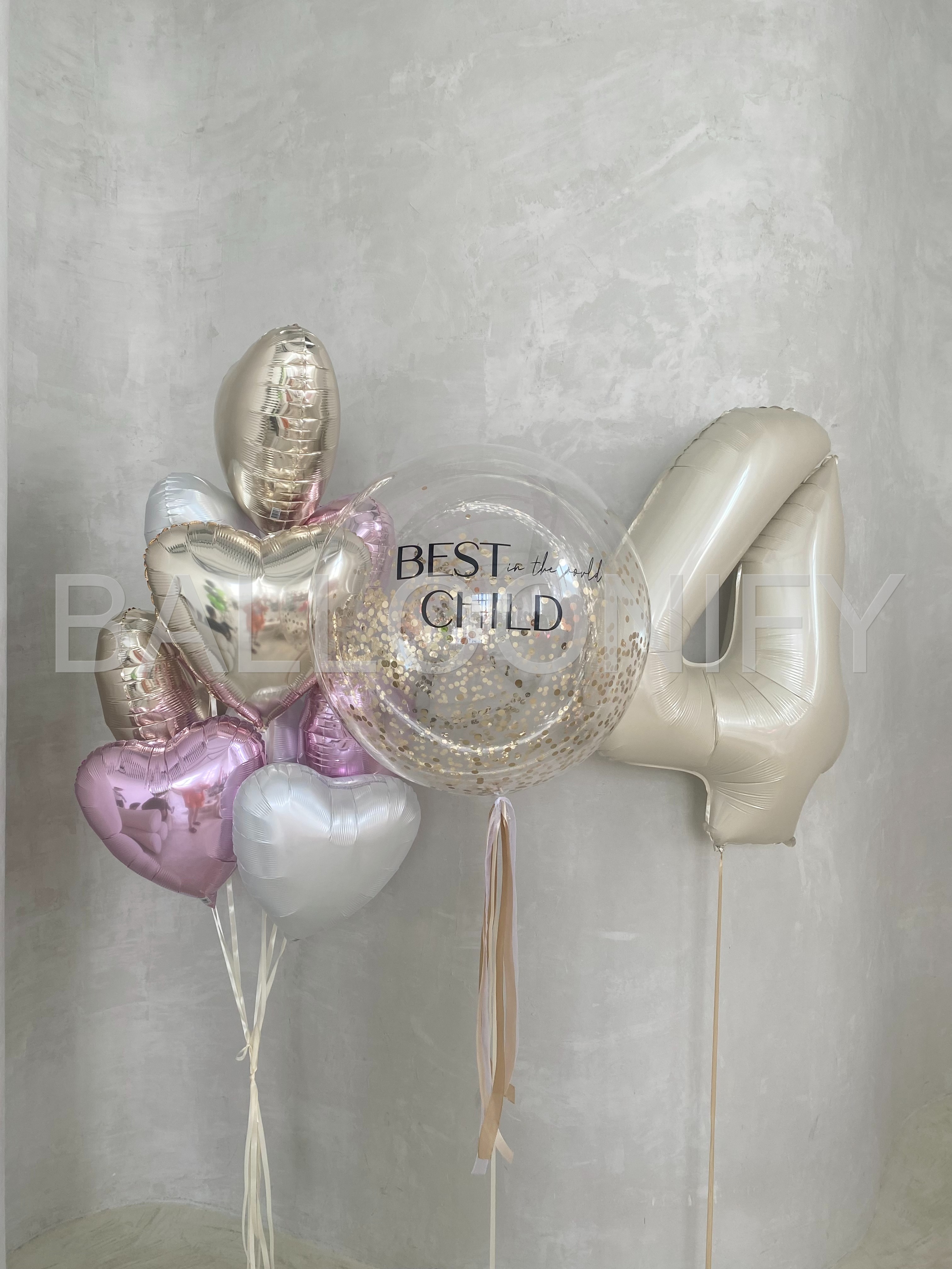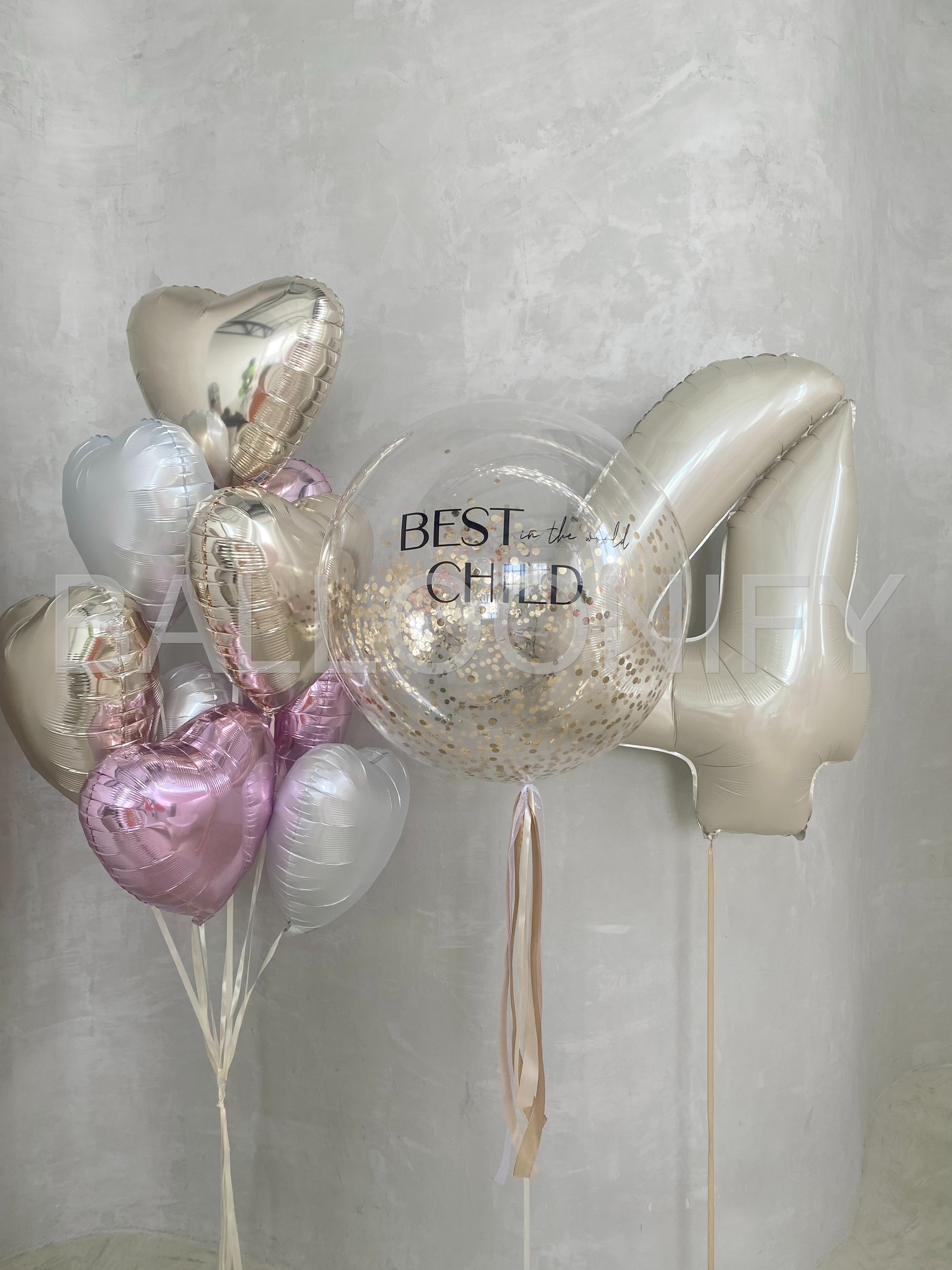 Элегантная композиция из фольгированных и прозрачных шаров — идеальное украшение для детского праздника или семейного торжества! В центре — большой прозрачный шар с золотыми конфетти и надписью «BEST CHILD», окружённый блестящими белыми и нежно-розовыми шарами в форме сердец и цифры. Изящные ленты добавляют утончённости. 🌟