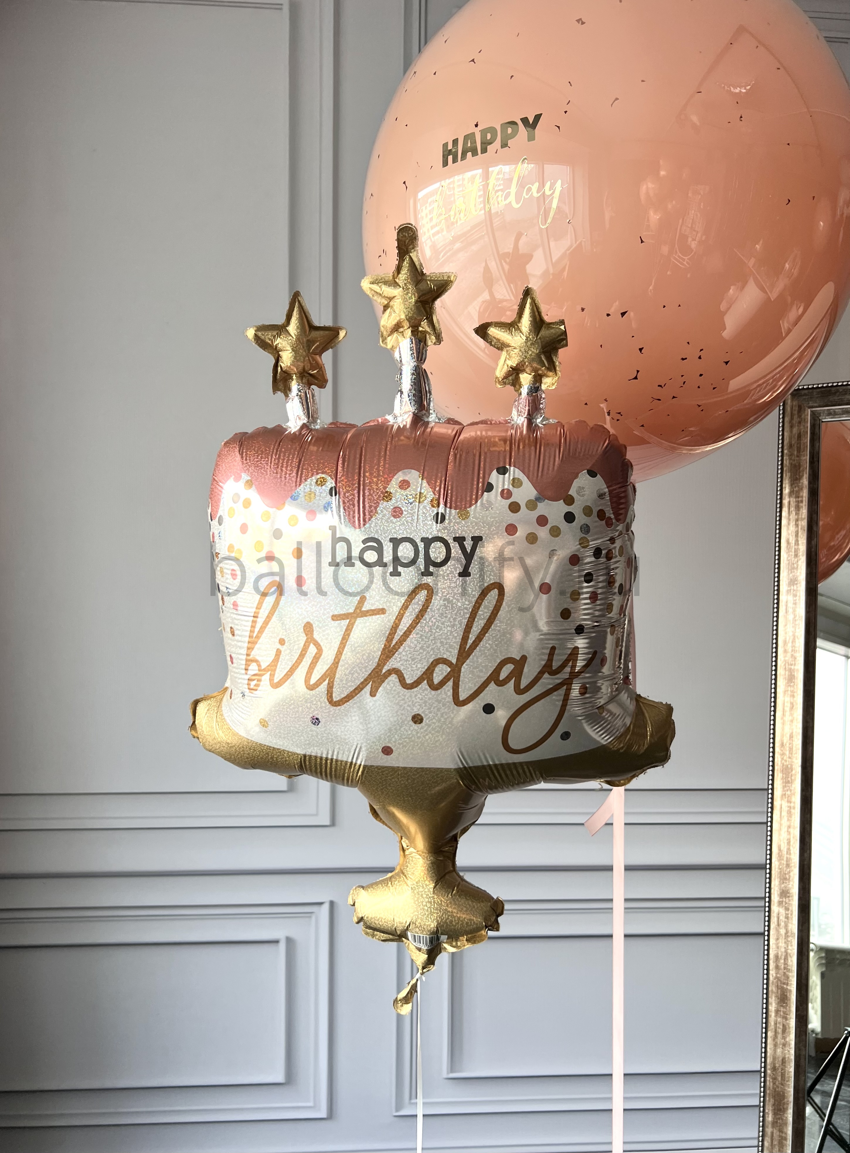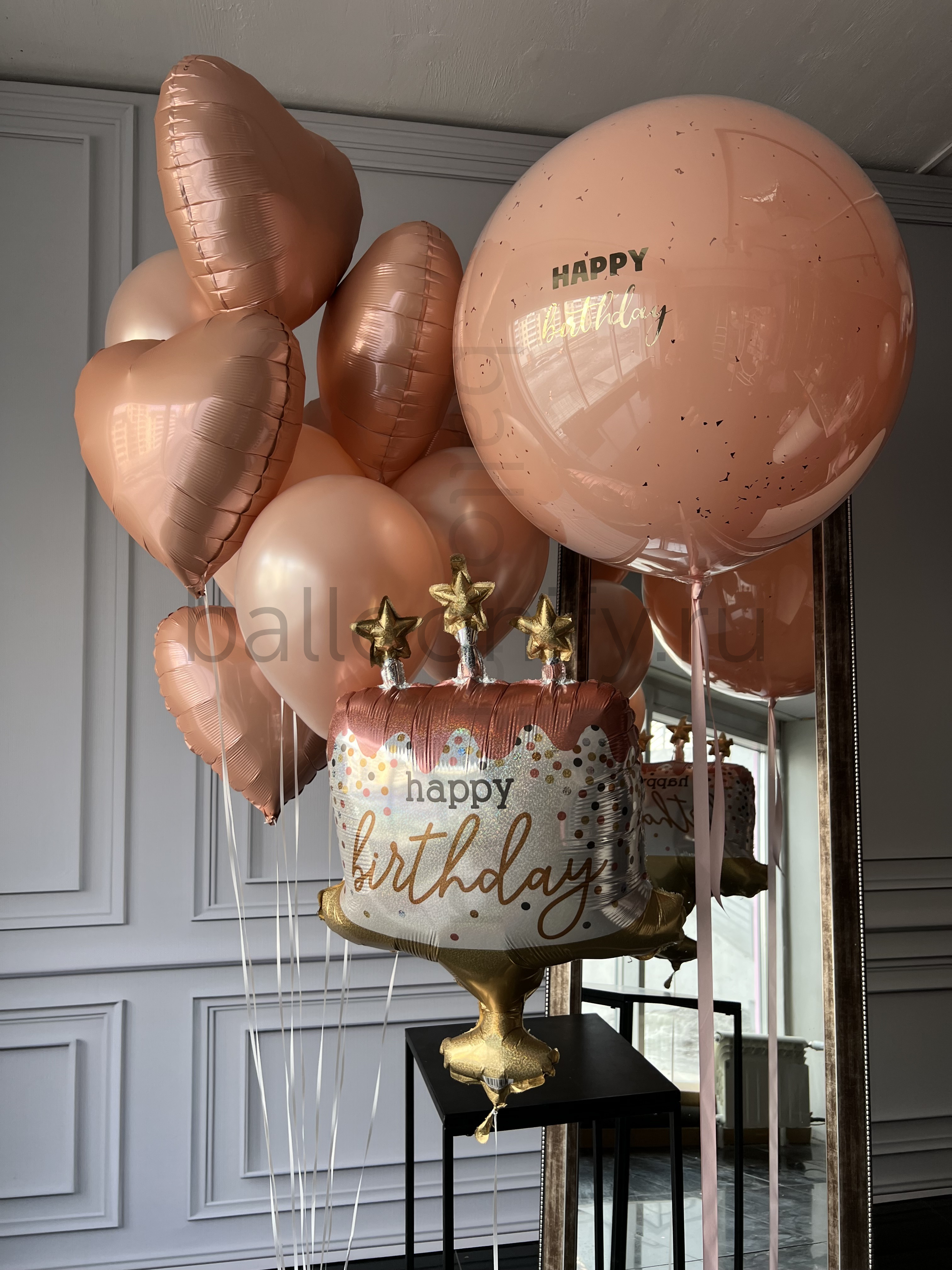 Изящная композиция из воздушных шаров в нежных розовых тонах: крупный шар с надписью «Happy birthday», шары в форме сердец и эффектный шар в виде праздничного торта с золотыми звёздами — идеальное украшение для дня рождения. 🌟