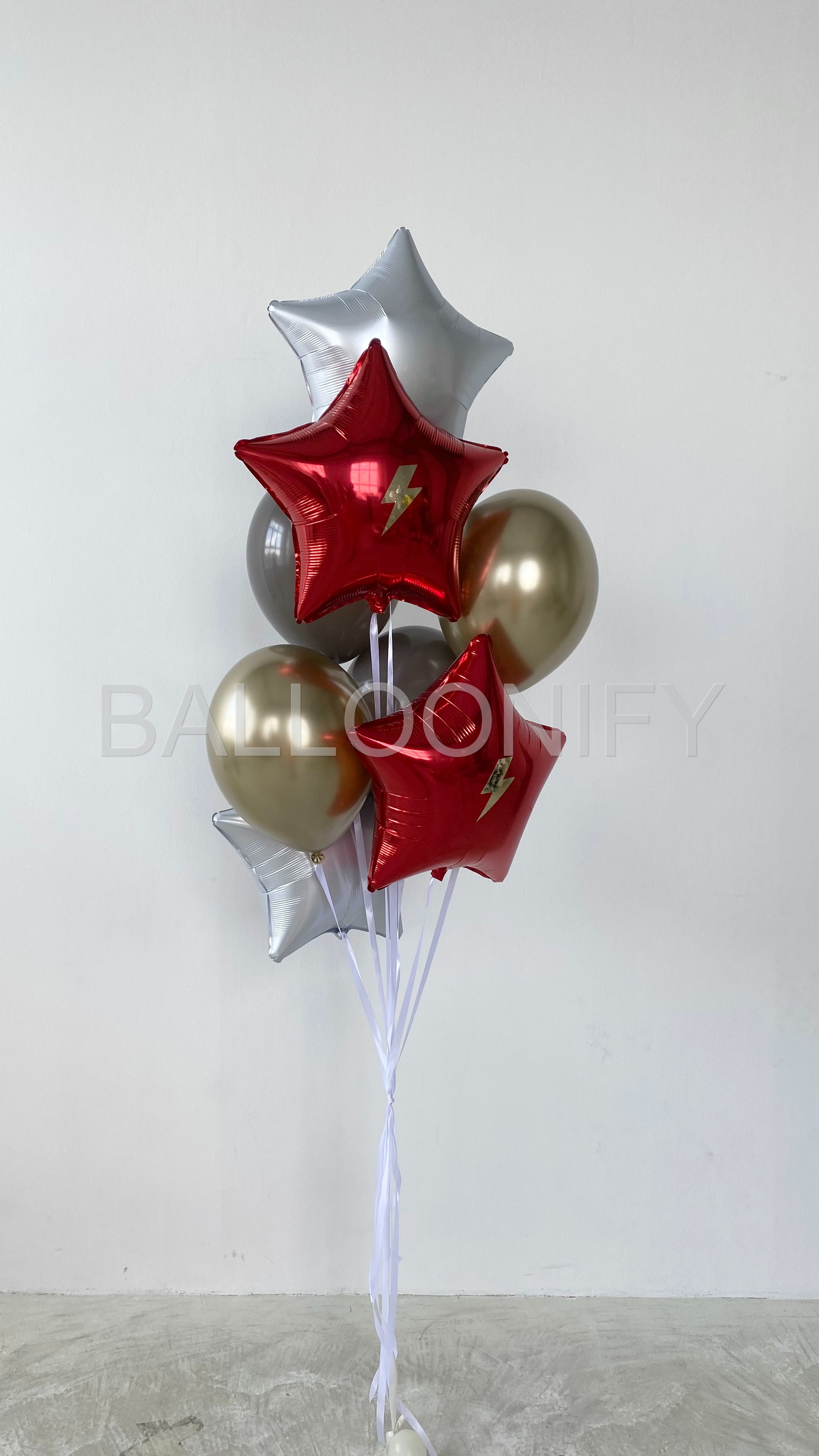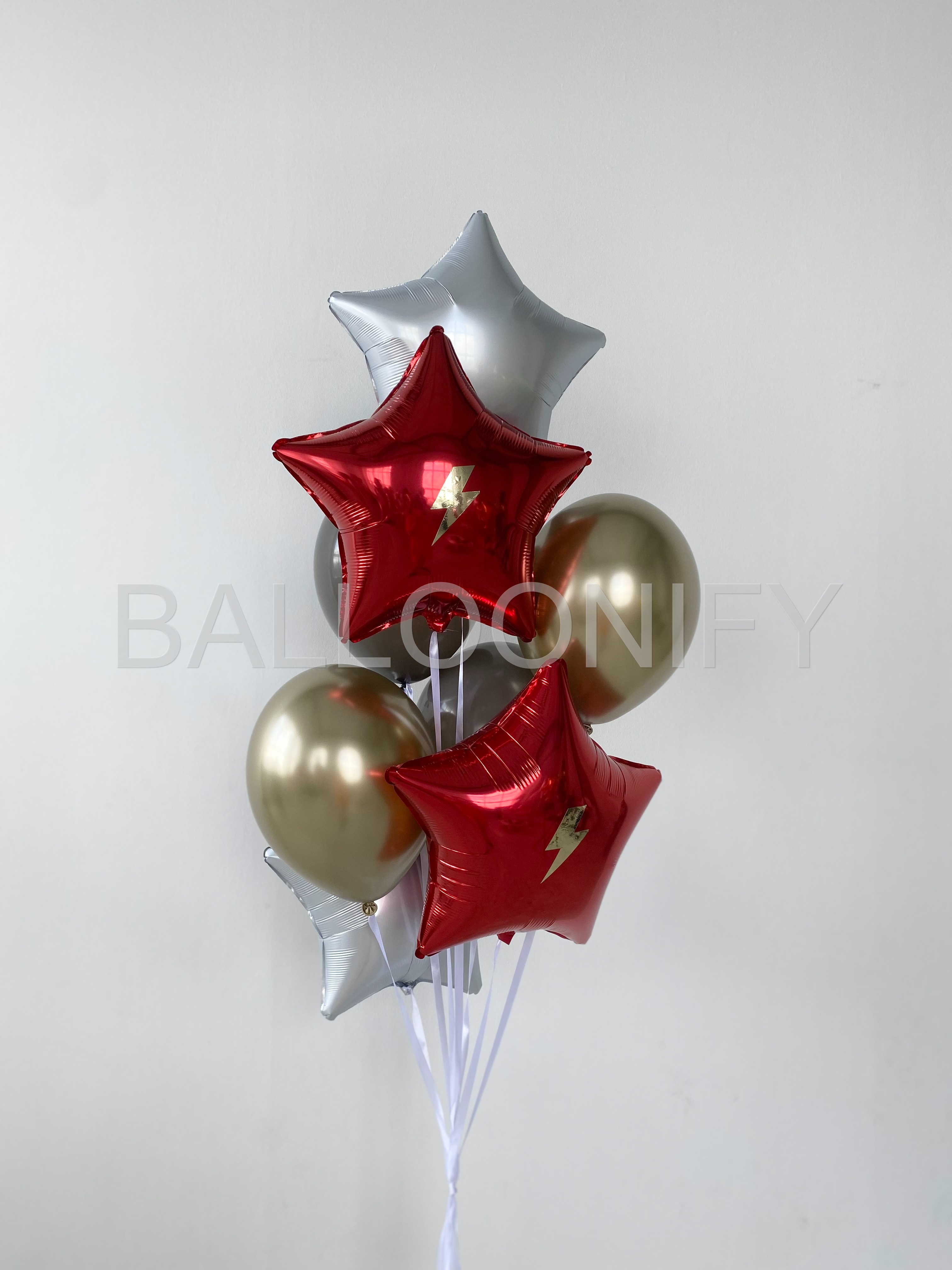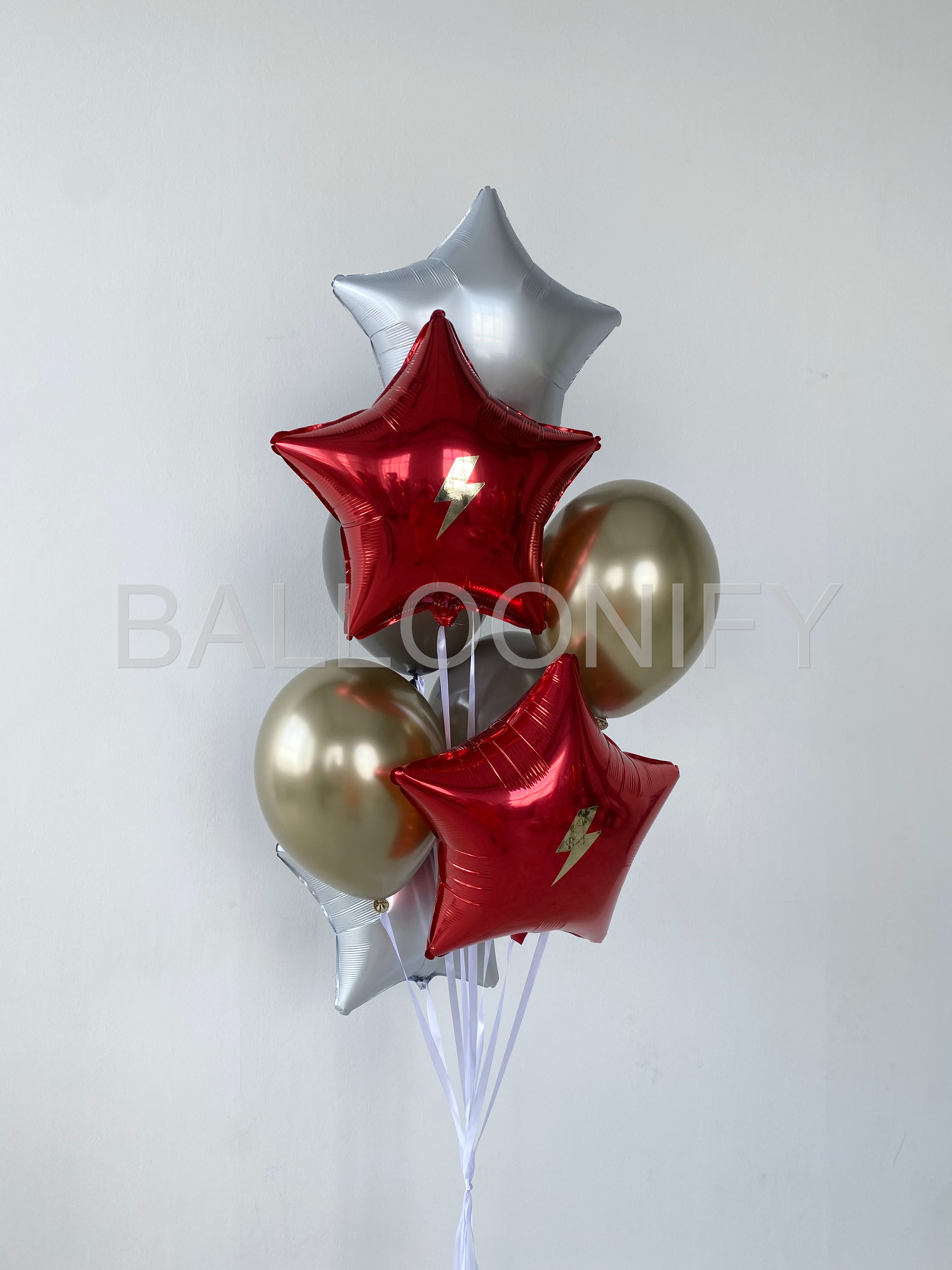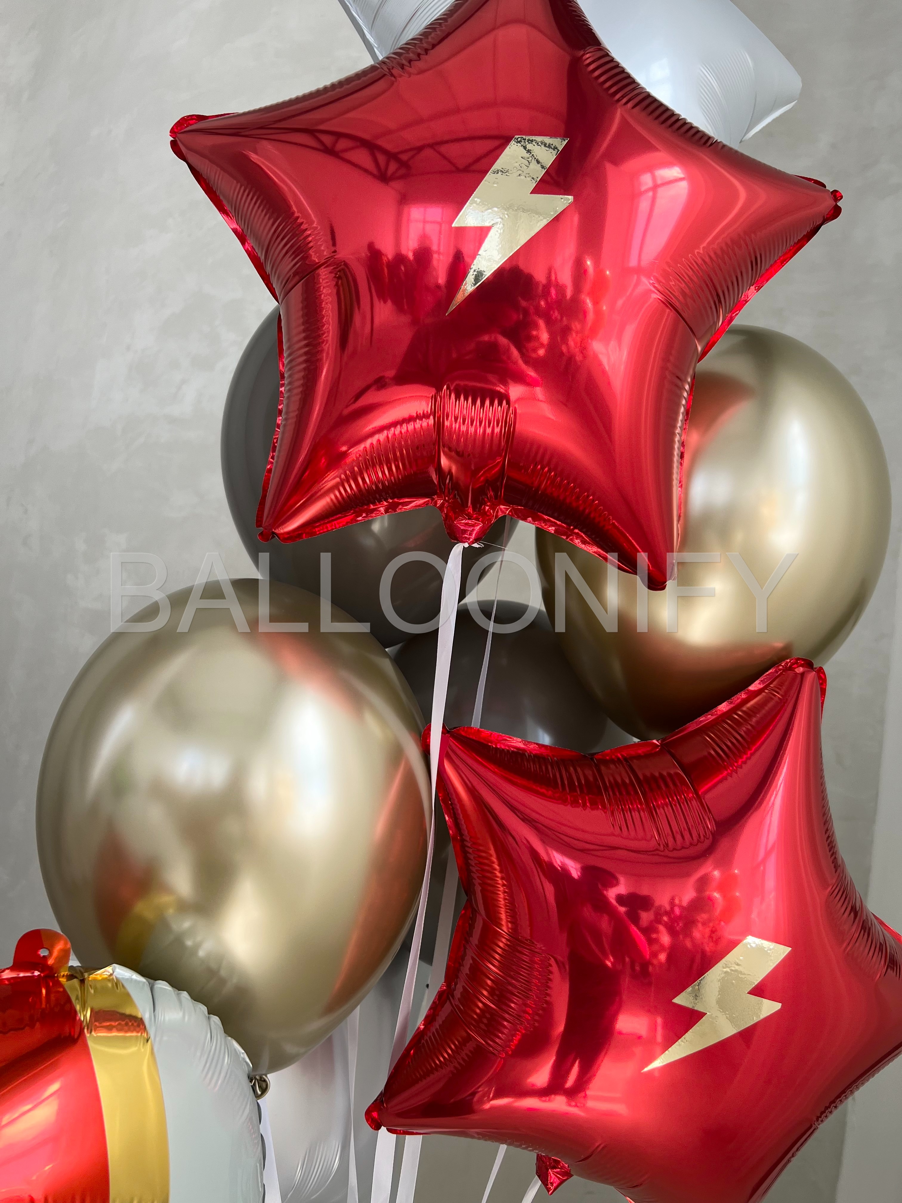 Элегантная композиция из фольгированных шаров — идеальное украшение для любого праздника! В букете сочетаются блестящие золотые шары, белые звёзды и яркие красные звёзды с эффектным изображением молнии, создающие динамичную и праздничную атмосферу. Сочетание насыщенных оттенков и глянцевых поверхностей придаёт композиции особый шарм — она станет ярким акцентом на детском дне рождения или тематической вечеринке 🌟