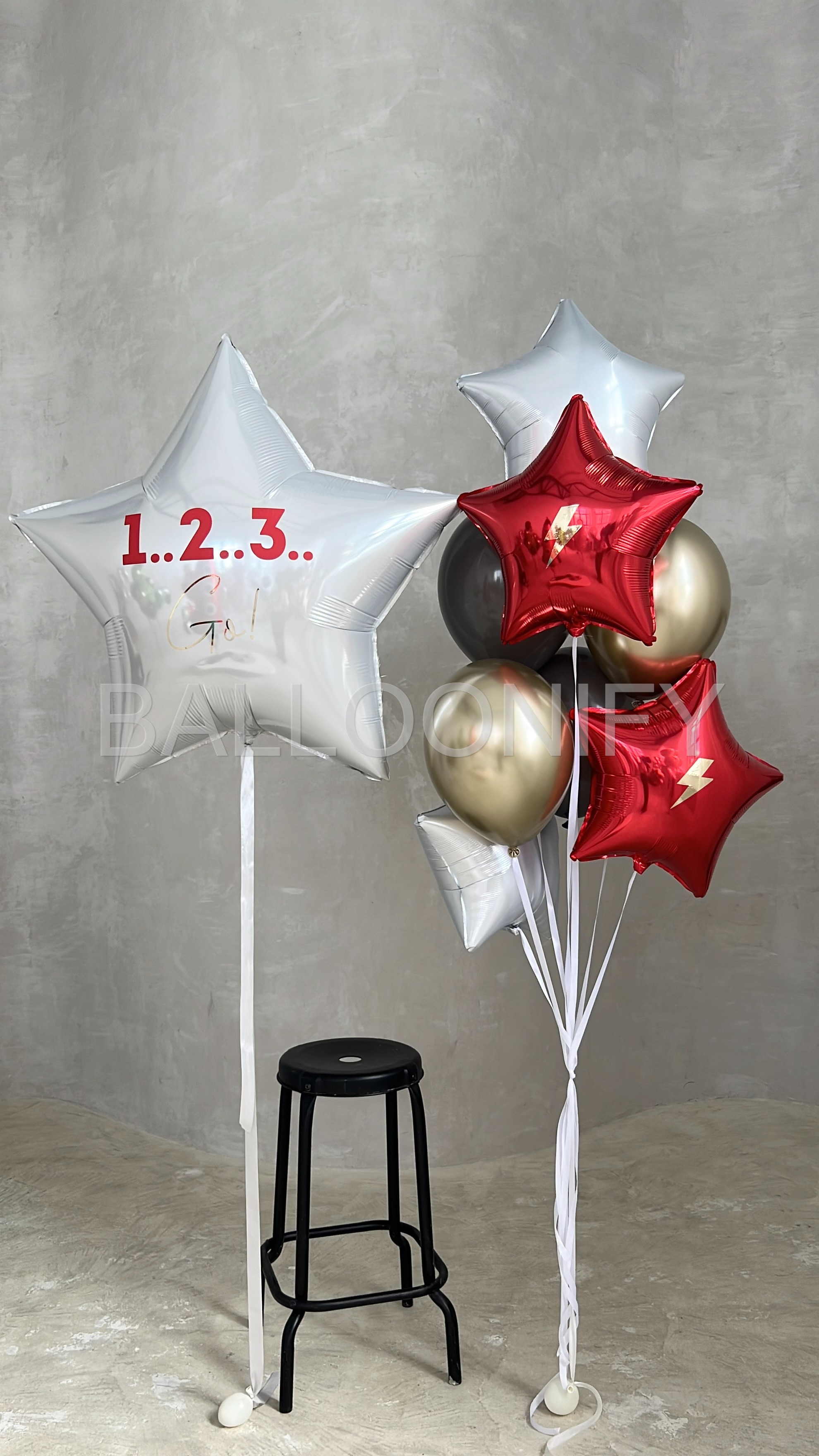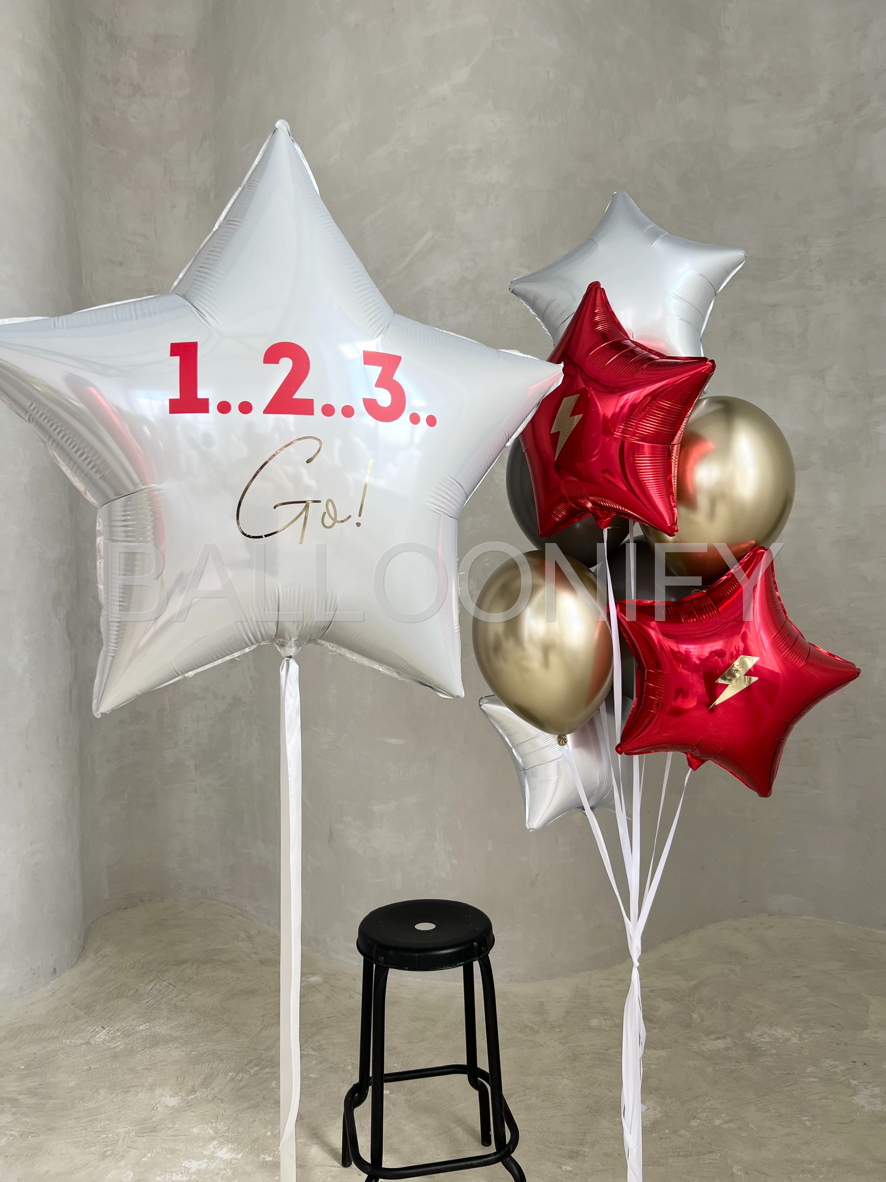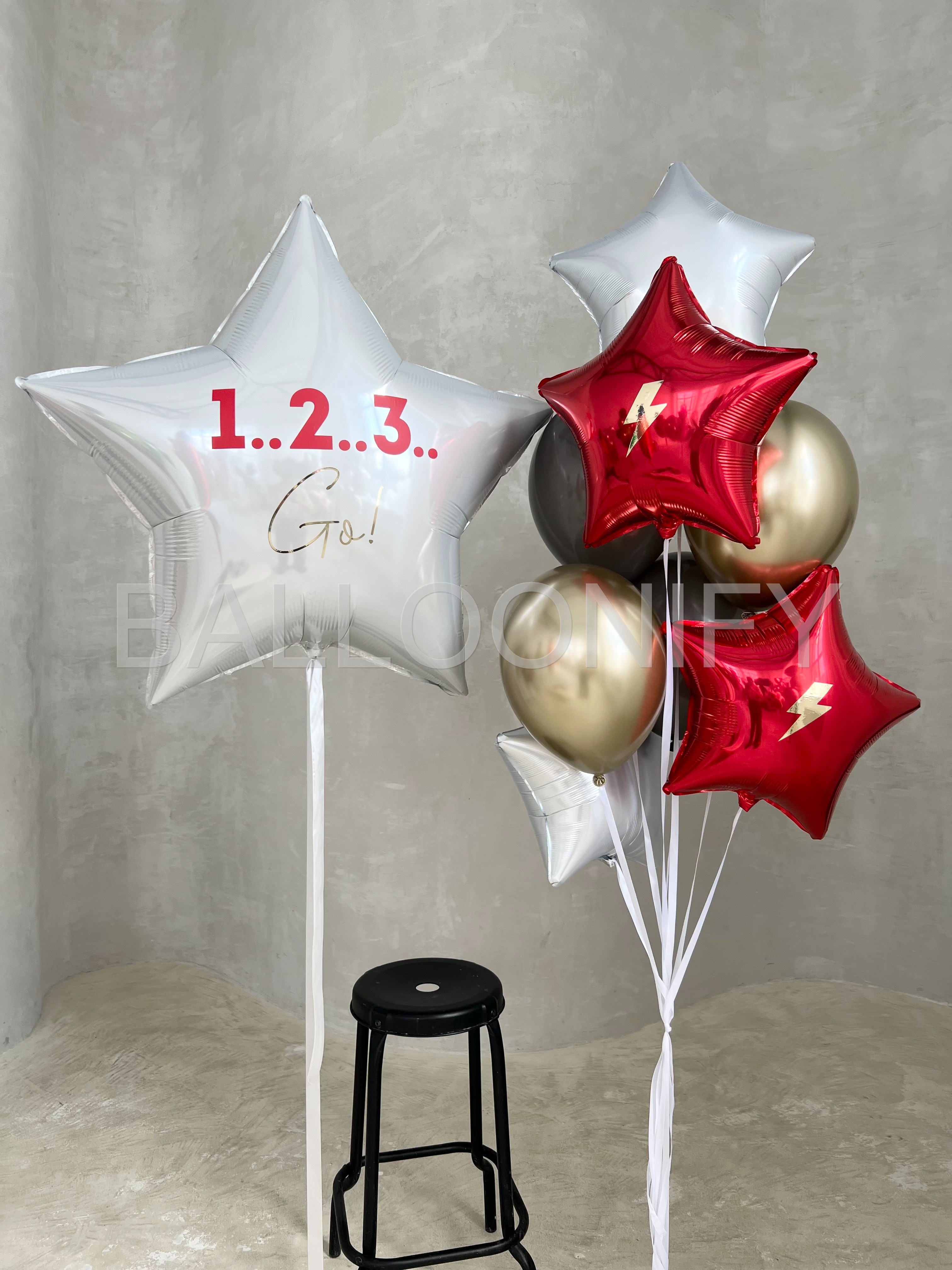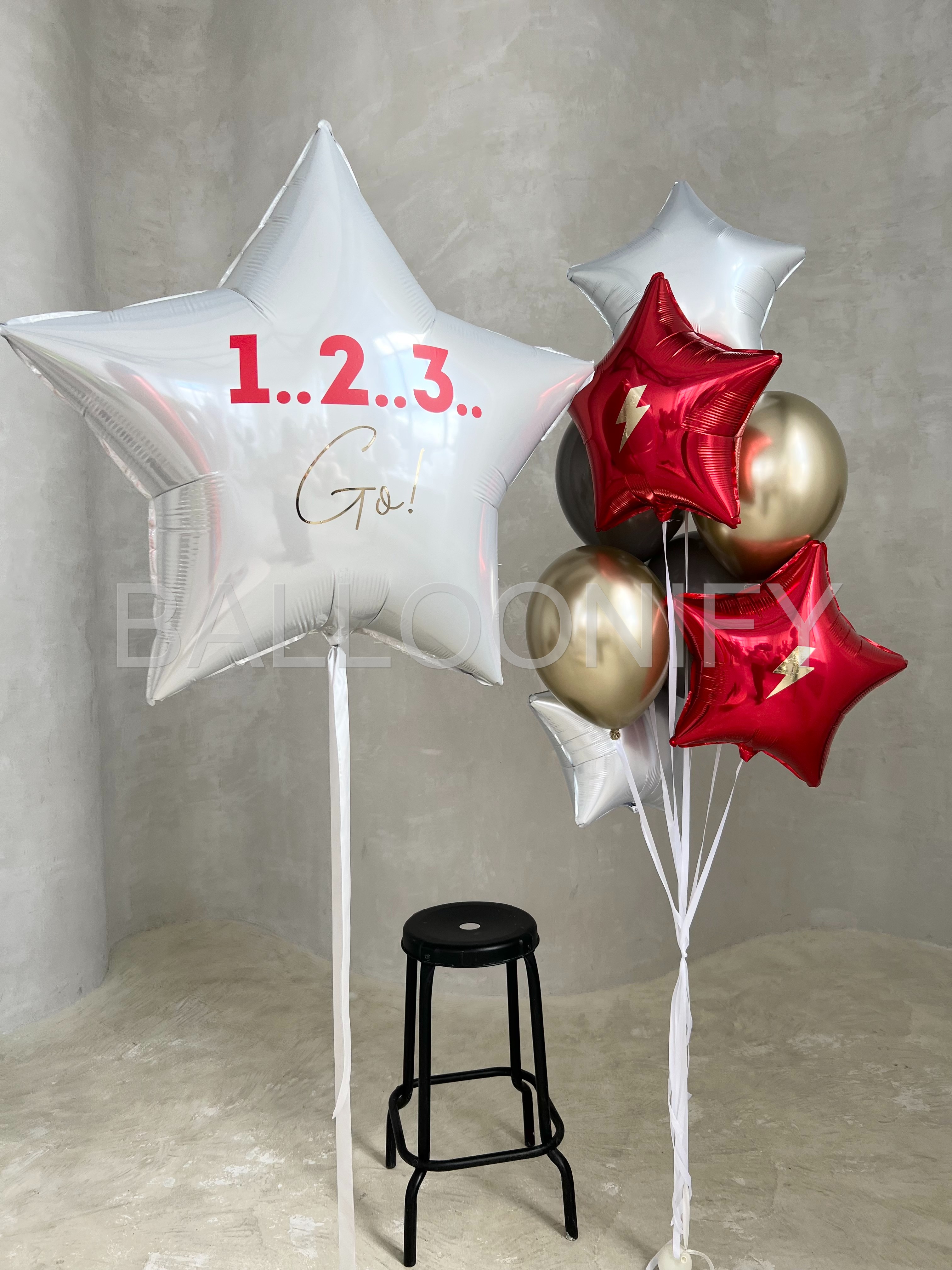 Динамичная композиция из фольгированных шаров — идеальный акцент для яркого праздника! В центре внимания — большая белая звезда с мотивирующей надписью «1…2…3… Go!», которая задаёт энергичный настрой. Дополнена стильными красными звёздами с золотыми молниями, элегантными хромированными шарами и белыми элементами. Сочетание насыщенных цветов и блестящих поверхностей создаст атмосферу азарта и веселья на детском дне рождении, спортивном мероприятии или тематической вечеринке. 🌟