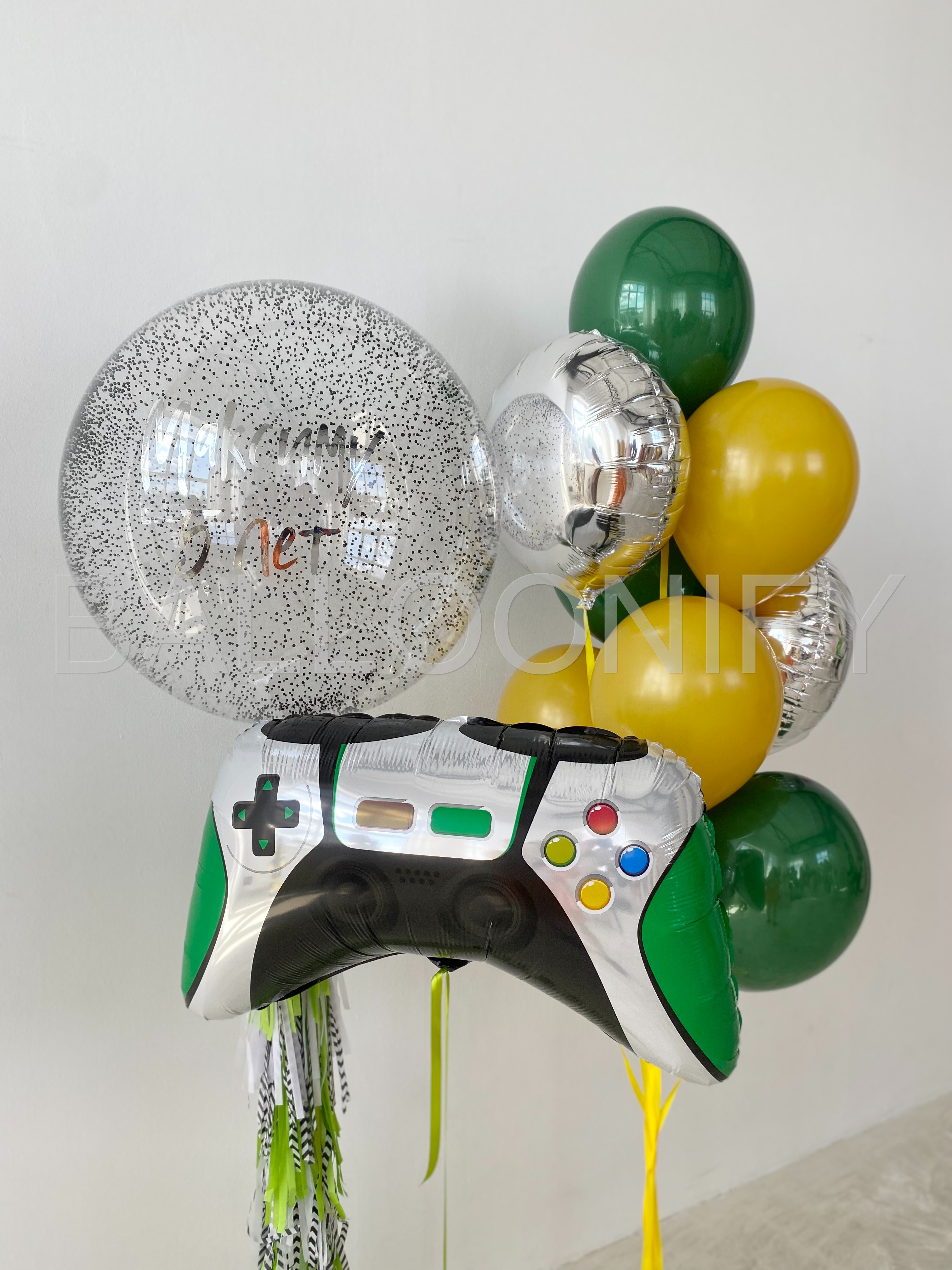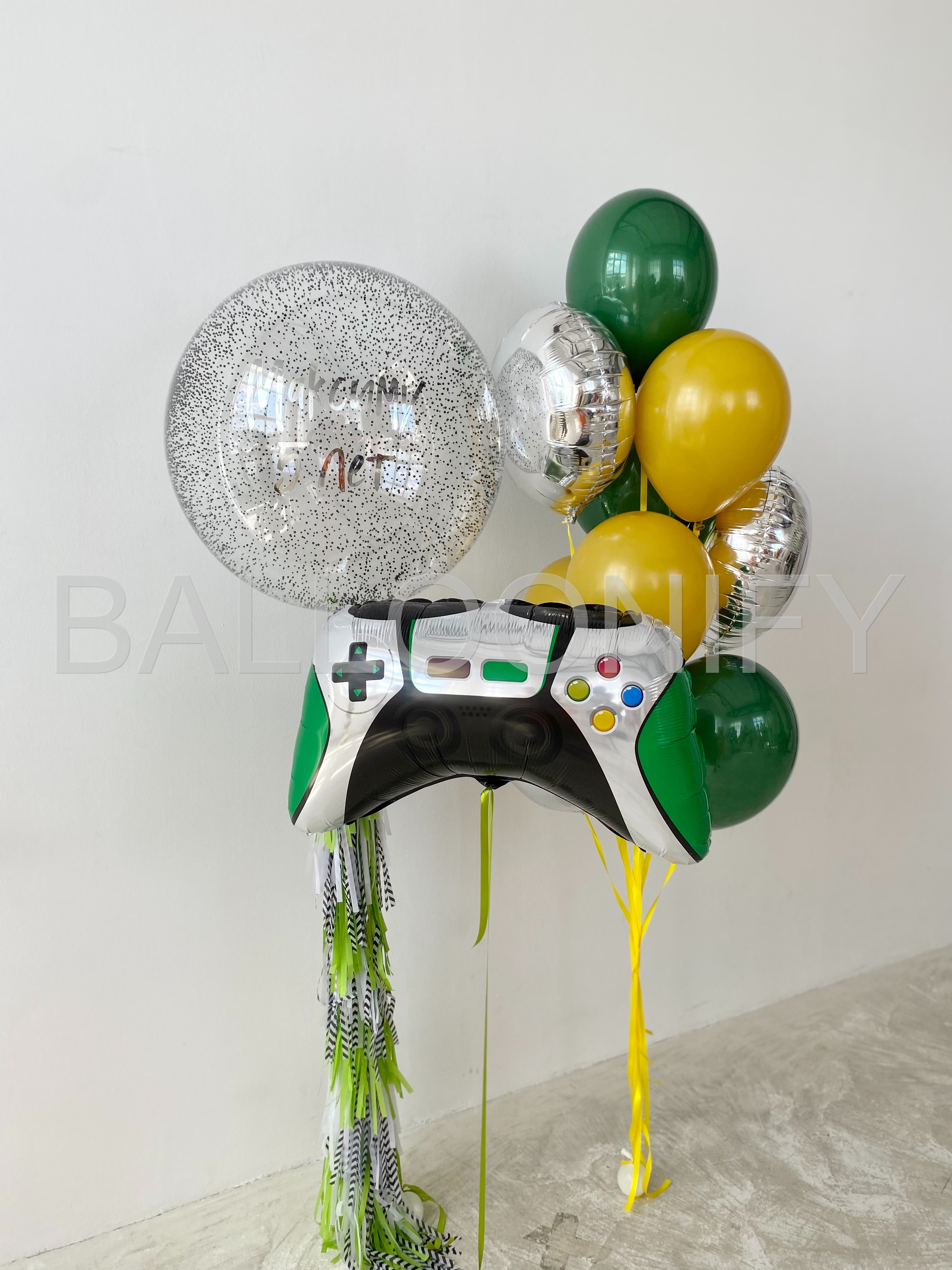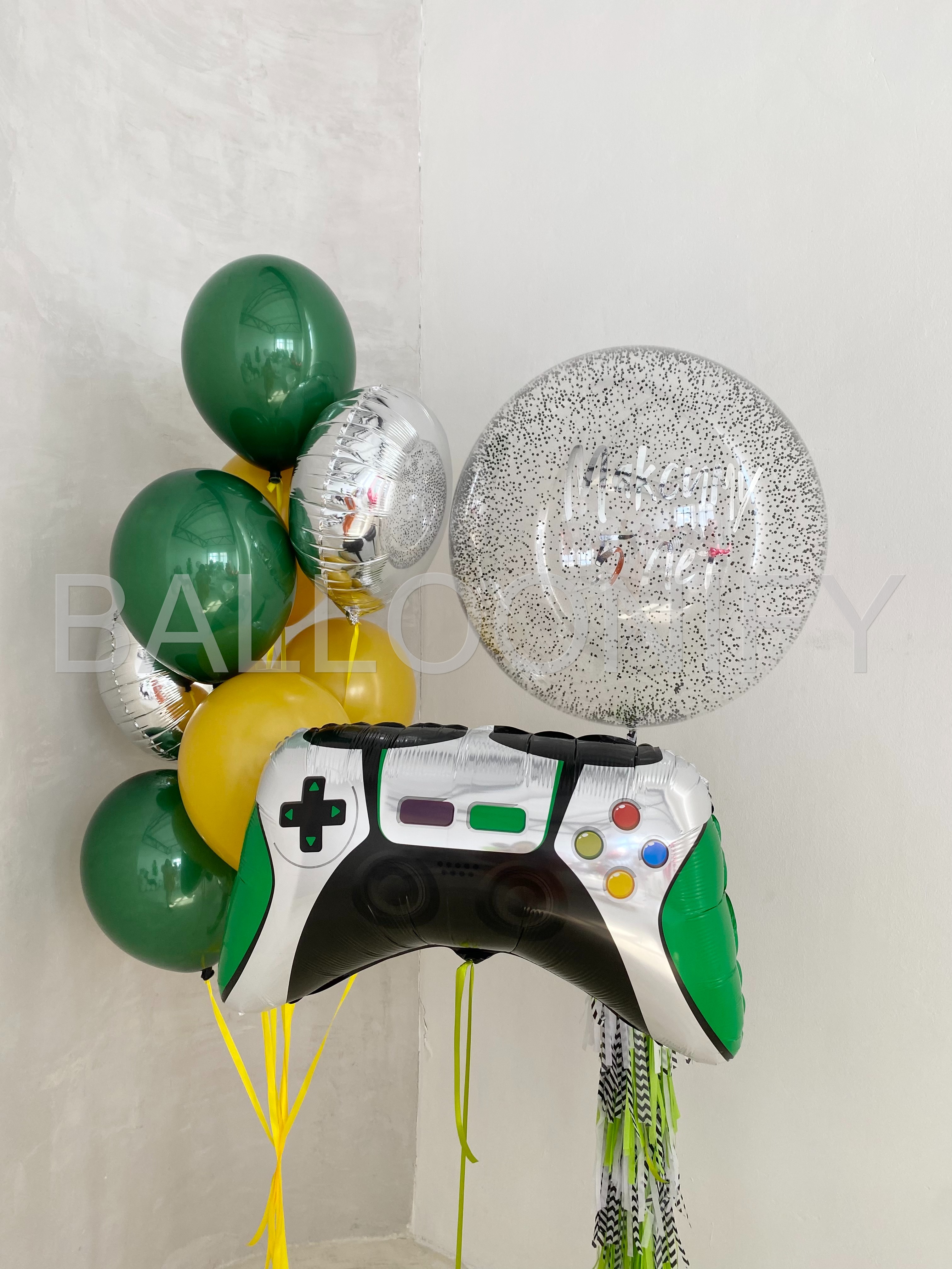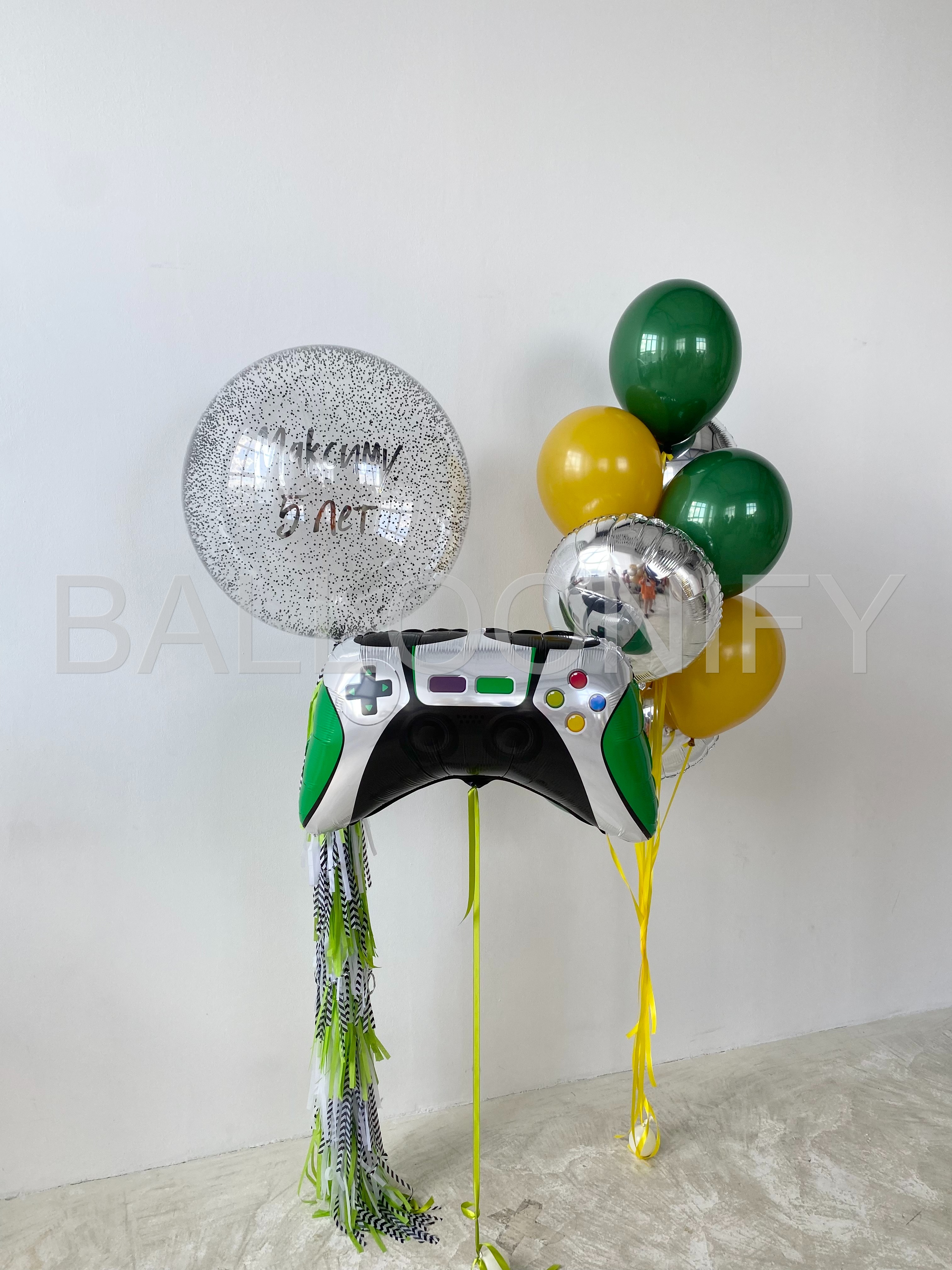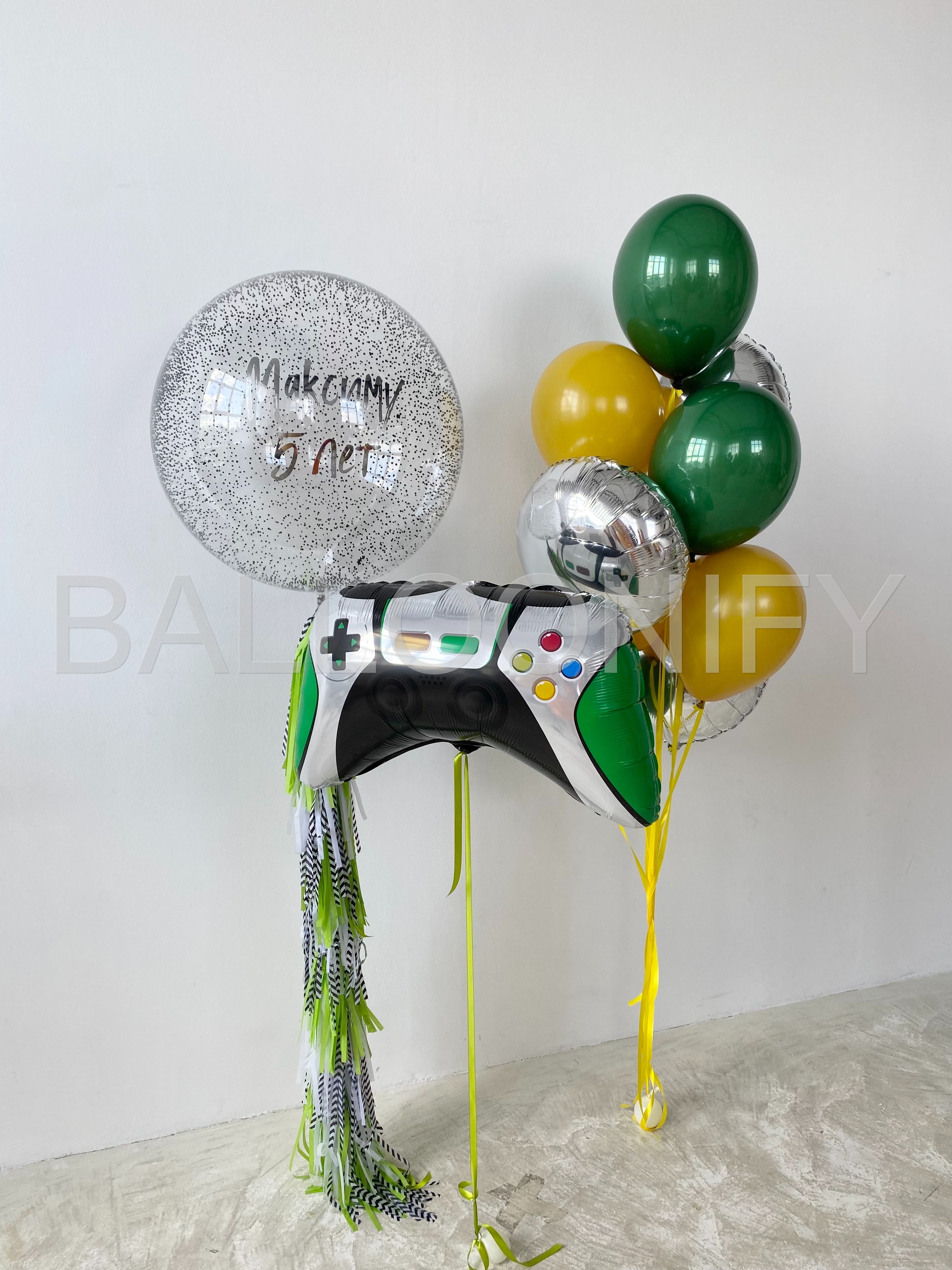 Стильная композиция из воздушных шаров для детского дня рождения в игровой тематике: крупный фольгированный шар в виде геймпада, яркие зелёные и жёлтые шары, блестящий серебристый шар и большой прозрачный шар с надписью «Максиму 5 лет» и конфетти внутри. Динамичные ленты добавляют изюминку и делают композицию ещё более праздничной. Идеальный выбор для маленького любителя видеоигр! 🌟
