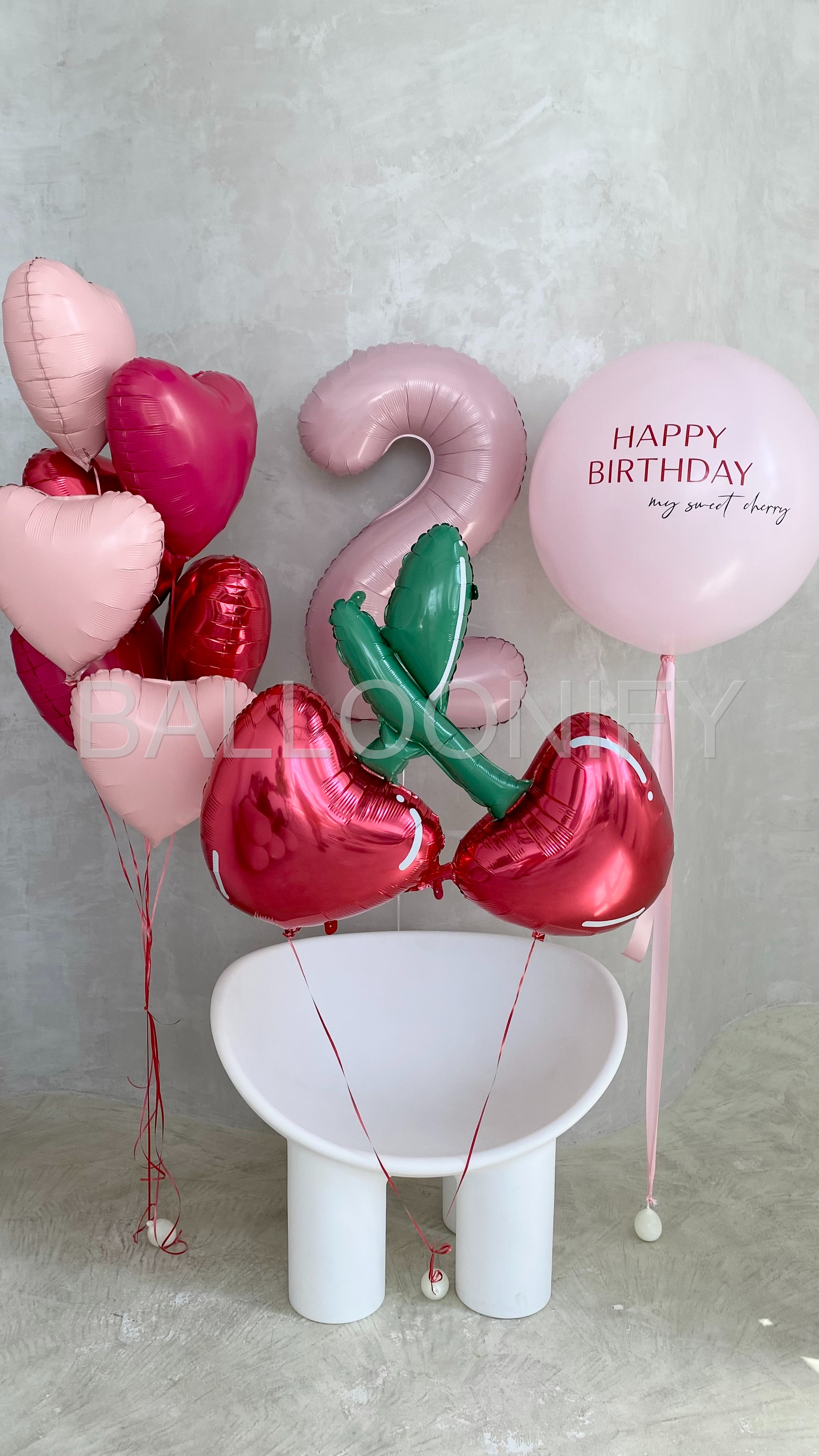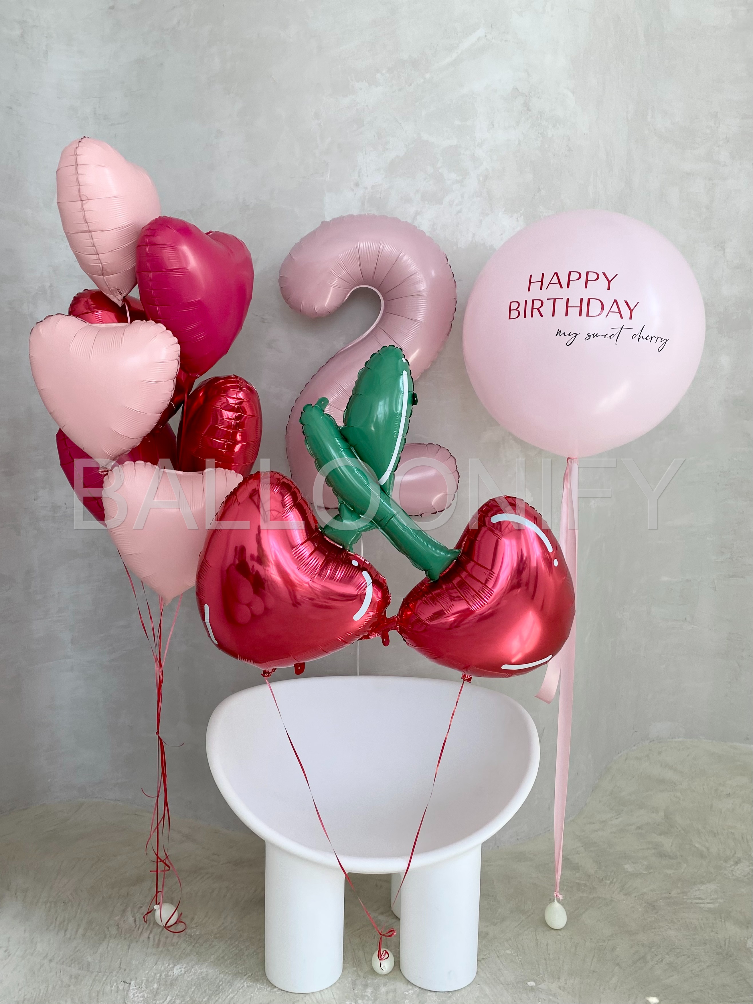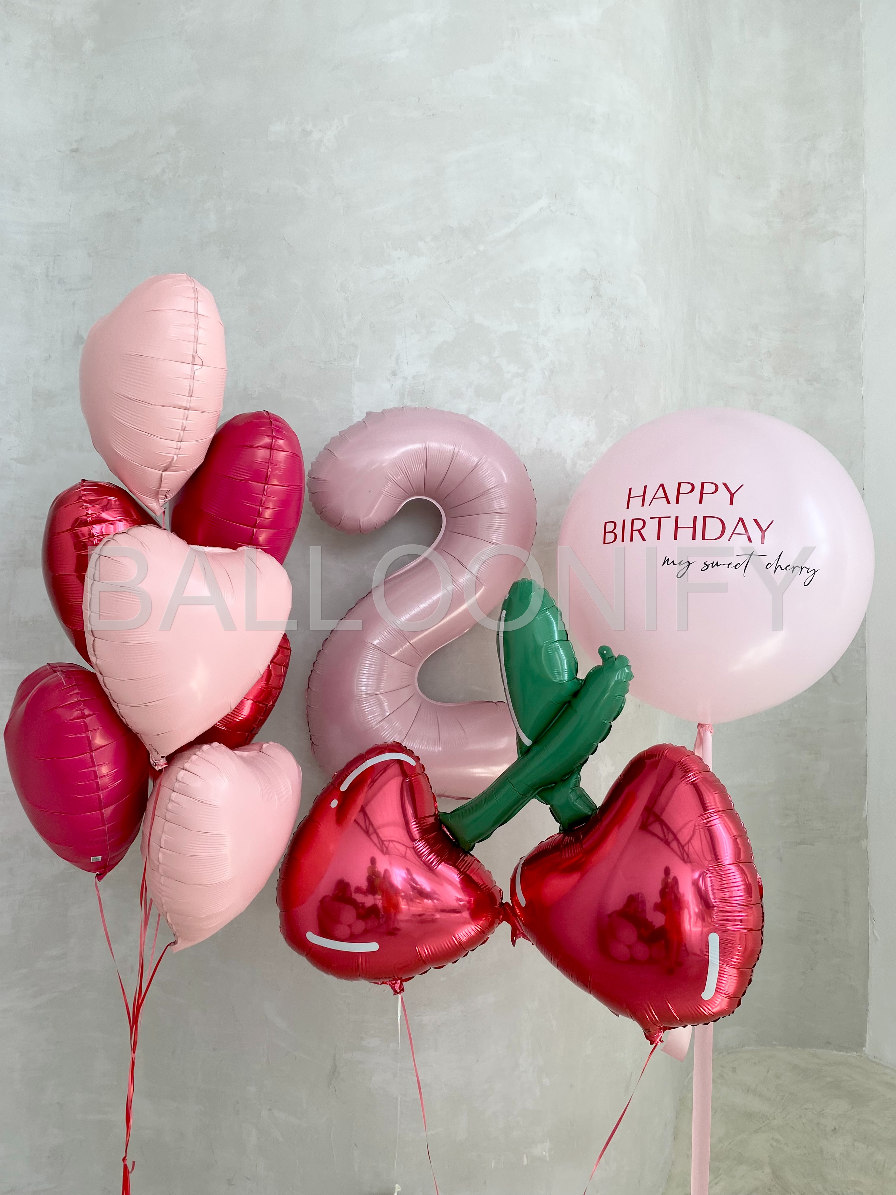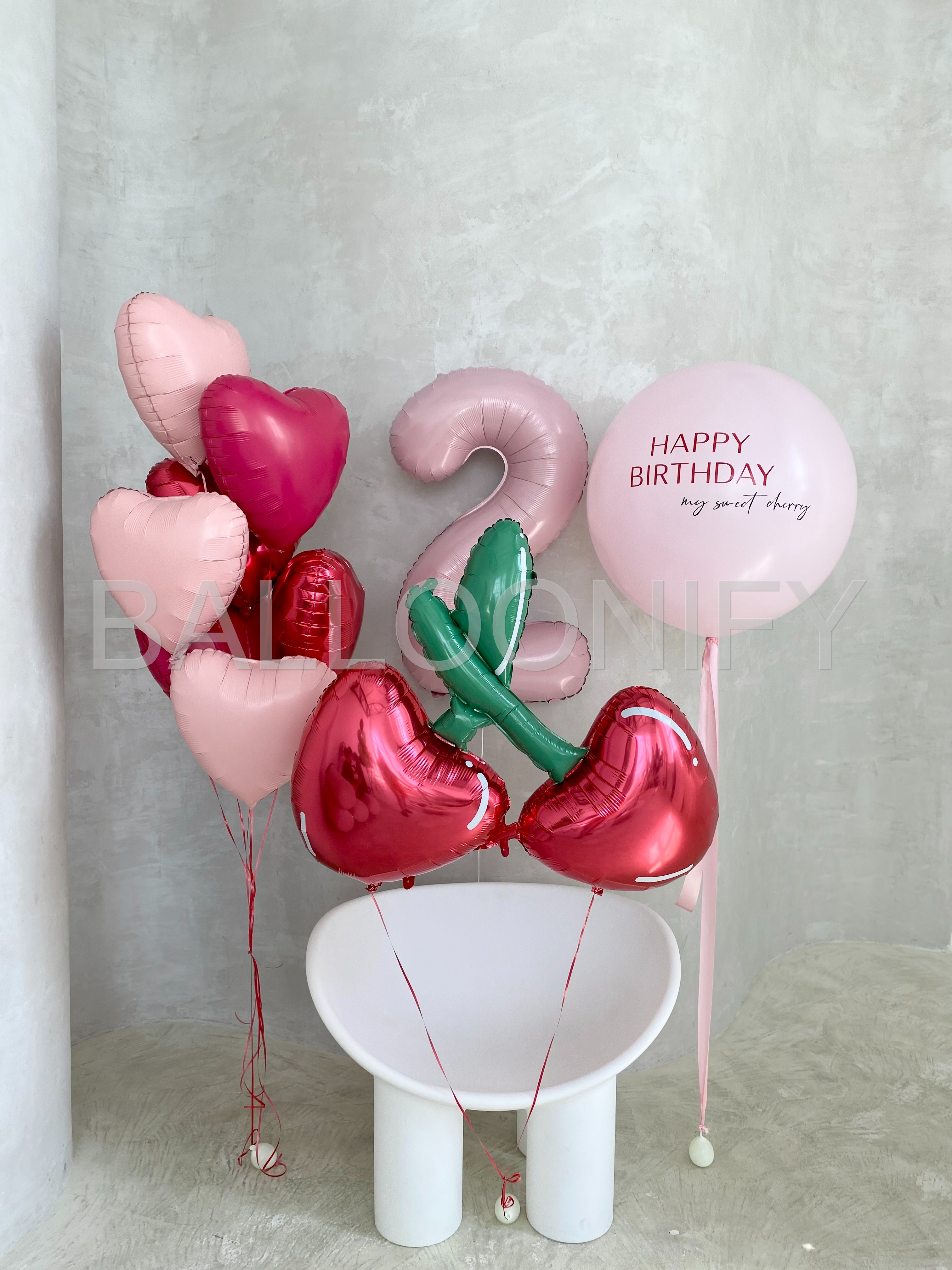Изысканная композиция из воздушных шаров для дня рождения: нежные розовые и блестящие красные сердечки, объёмная цифра «2» в пастельном оттенке, яркие шары в форме вишенок с зелёными листочками и крупный шар с трогательной надписью «HAPPY BIRTHDAY my sweet cherry». Элегантный и яркий набор создаст праздничную атмосферу и подарит незабываемые эмоции имениннице. 🌟