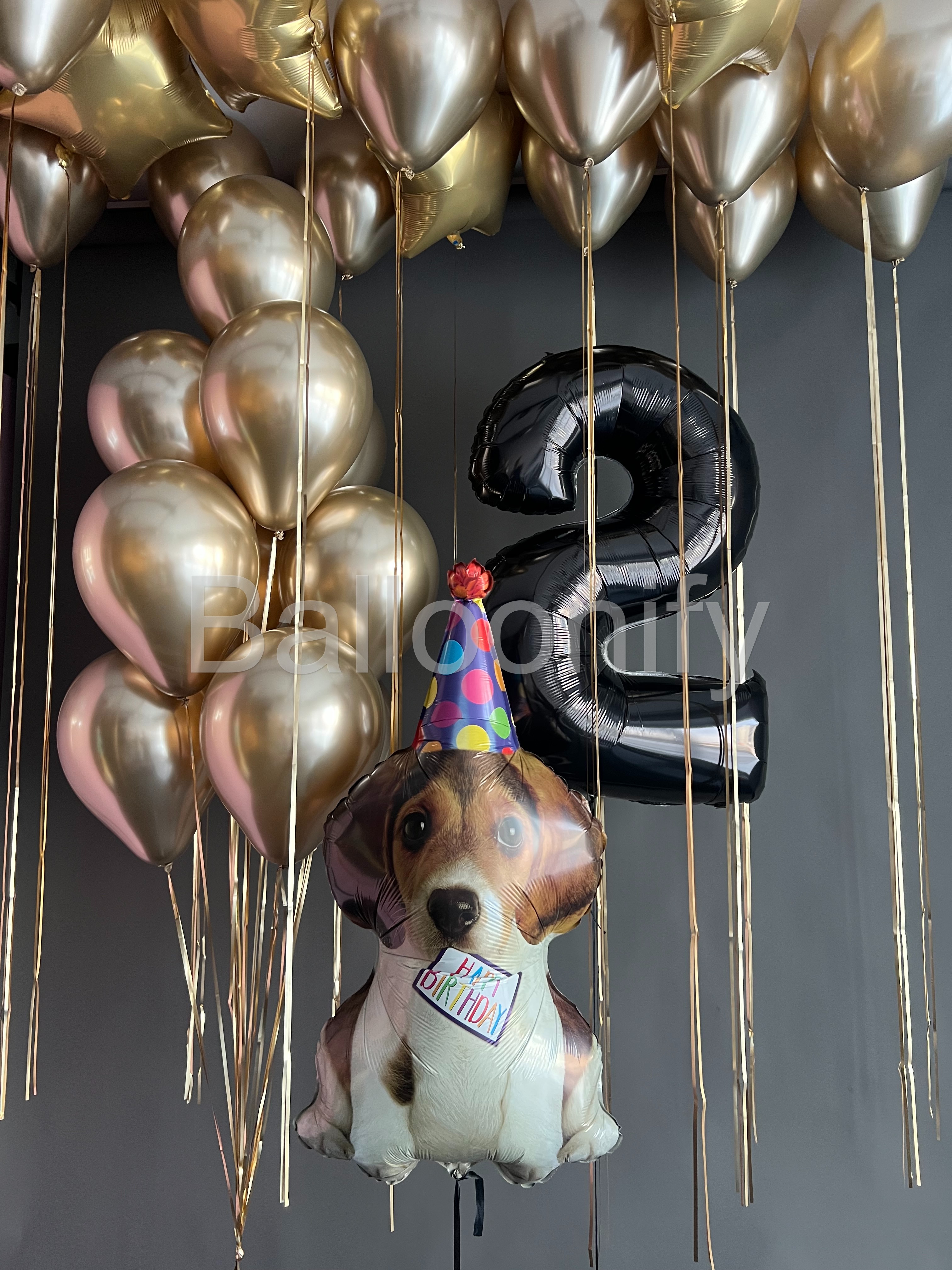 Эта изысканная композиция из воздушных шаров идеально сочетает в себе элегантность и весёлую нотку, становясь главным украшением праздничного мероприятия! Центральными элементами композиции являются большой чёрный шар в форме цифр «2». Дополняет и «оживляет» эту картину шар-собачка в праздничной шапочке с надписью «Happy Birthday», который выступает настоящей изюминкой оформления. 🌟