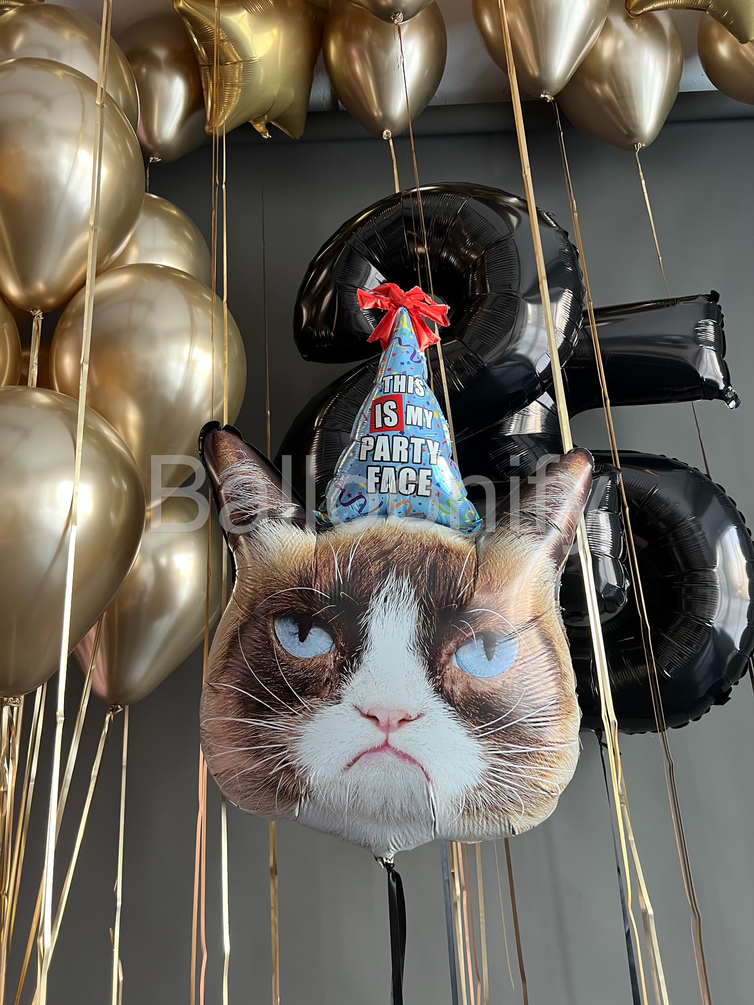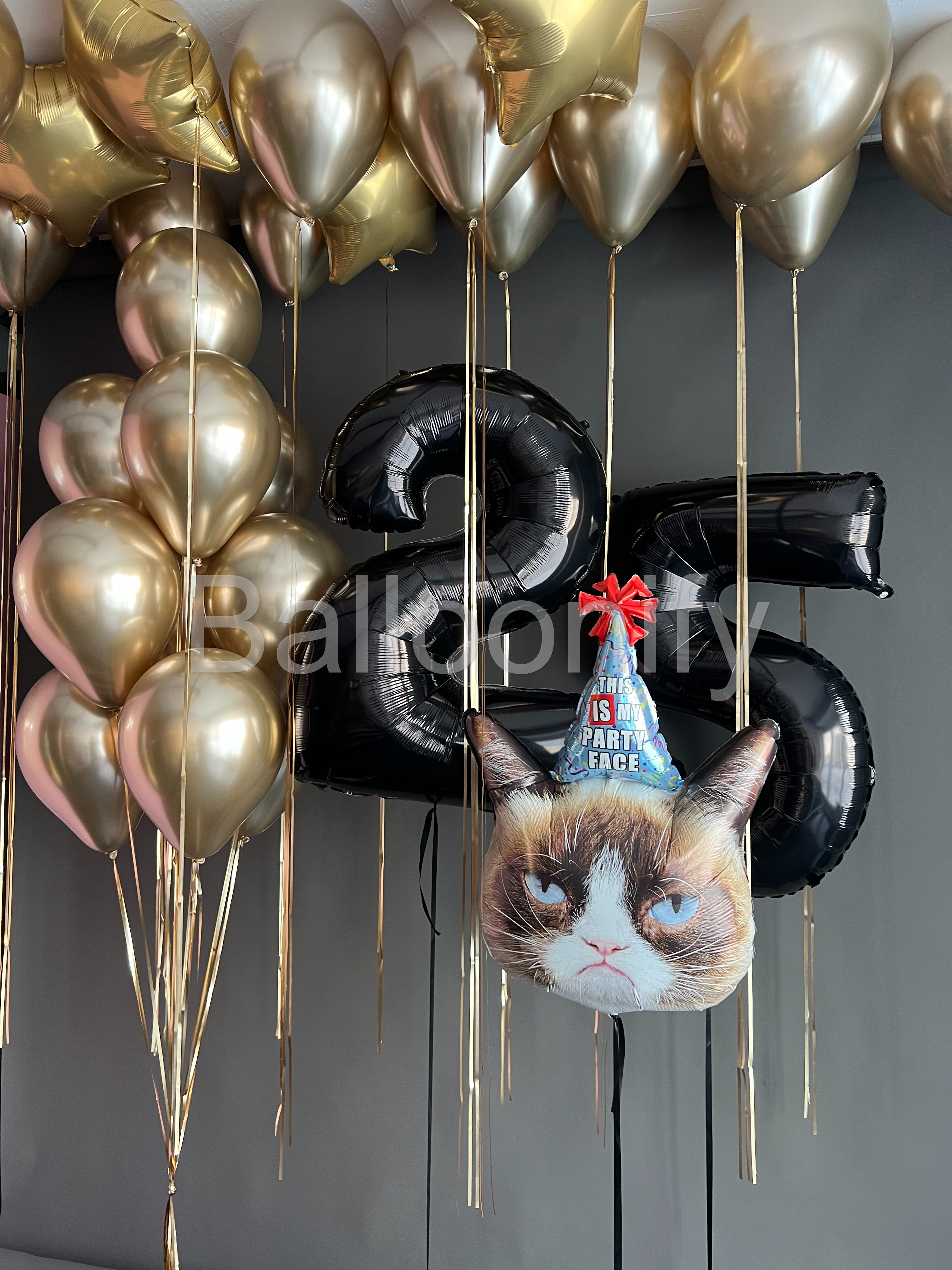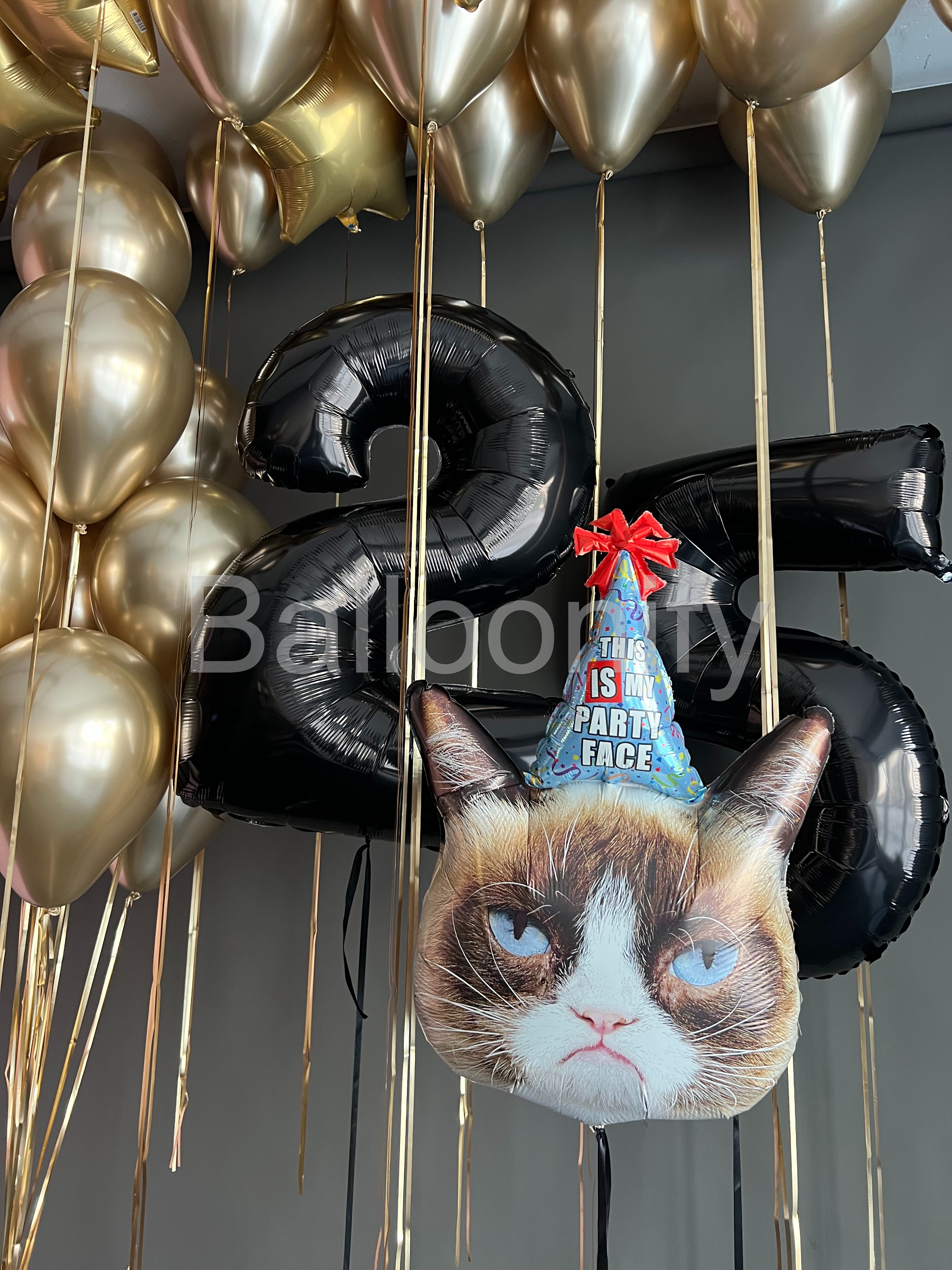 Эта изысканная композиция из воздушных шаров идеально сочетает в себе элегантность и весёлую нотку, становясь главным украшением праздничного мероприятия! Центральные элементы композиции — крупные чёрные шары в форме цифр «2» и «5», задающие торжественный тон и обозначающие возраст именинника, а также шар с изображением «сердитого кота» в праздничной шапочке с надписью «This is my party face». Цифры формируют «ядро» оформления, а забавный кот на переднем плане добавляет композиции озорства и служит ярким акцентом, вызывающим улыбку. Вместе они создают гармоничный контраст между элегантностью и юмором, делая композицию запоминающейся. 🌟