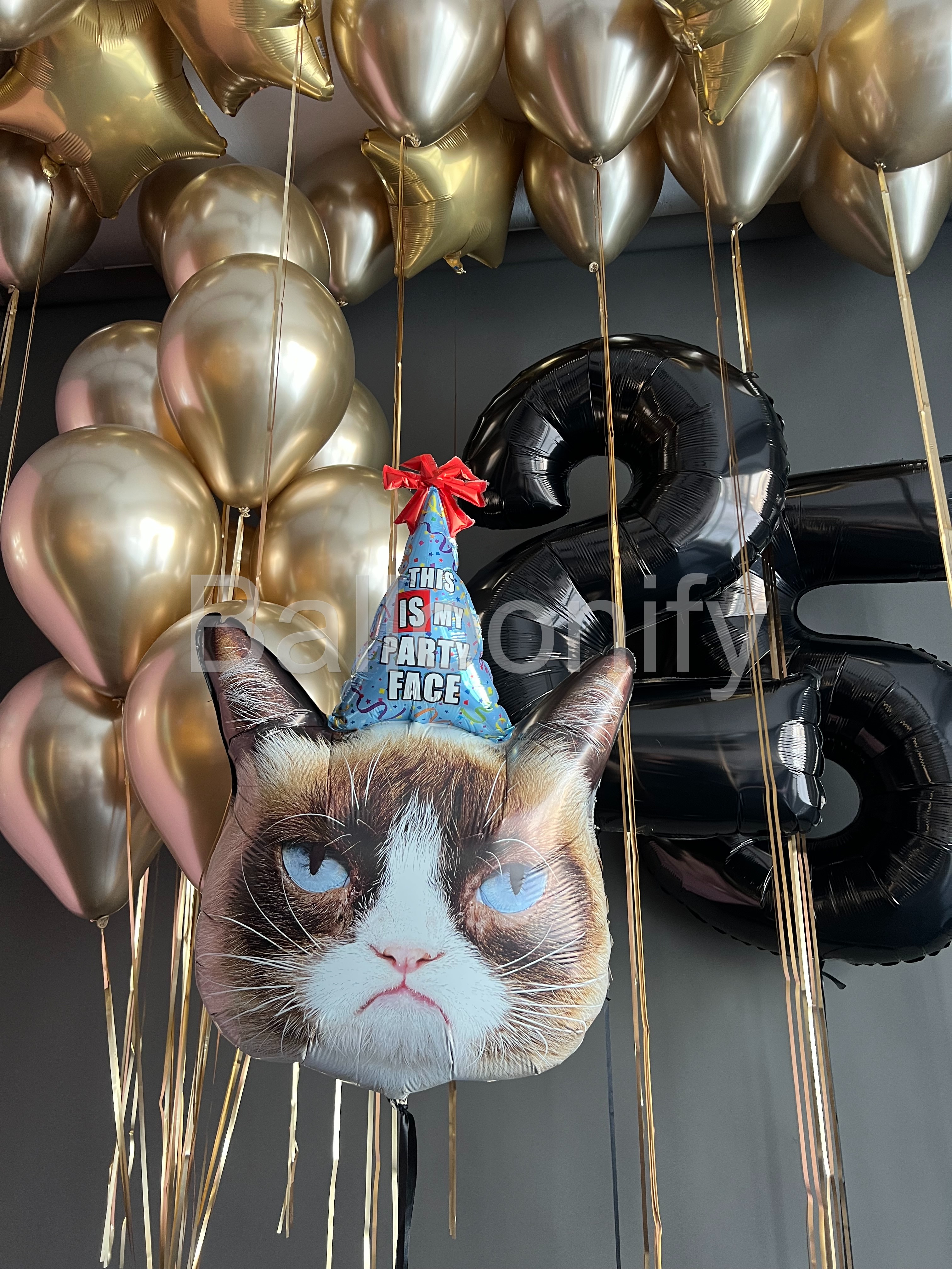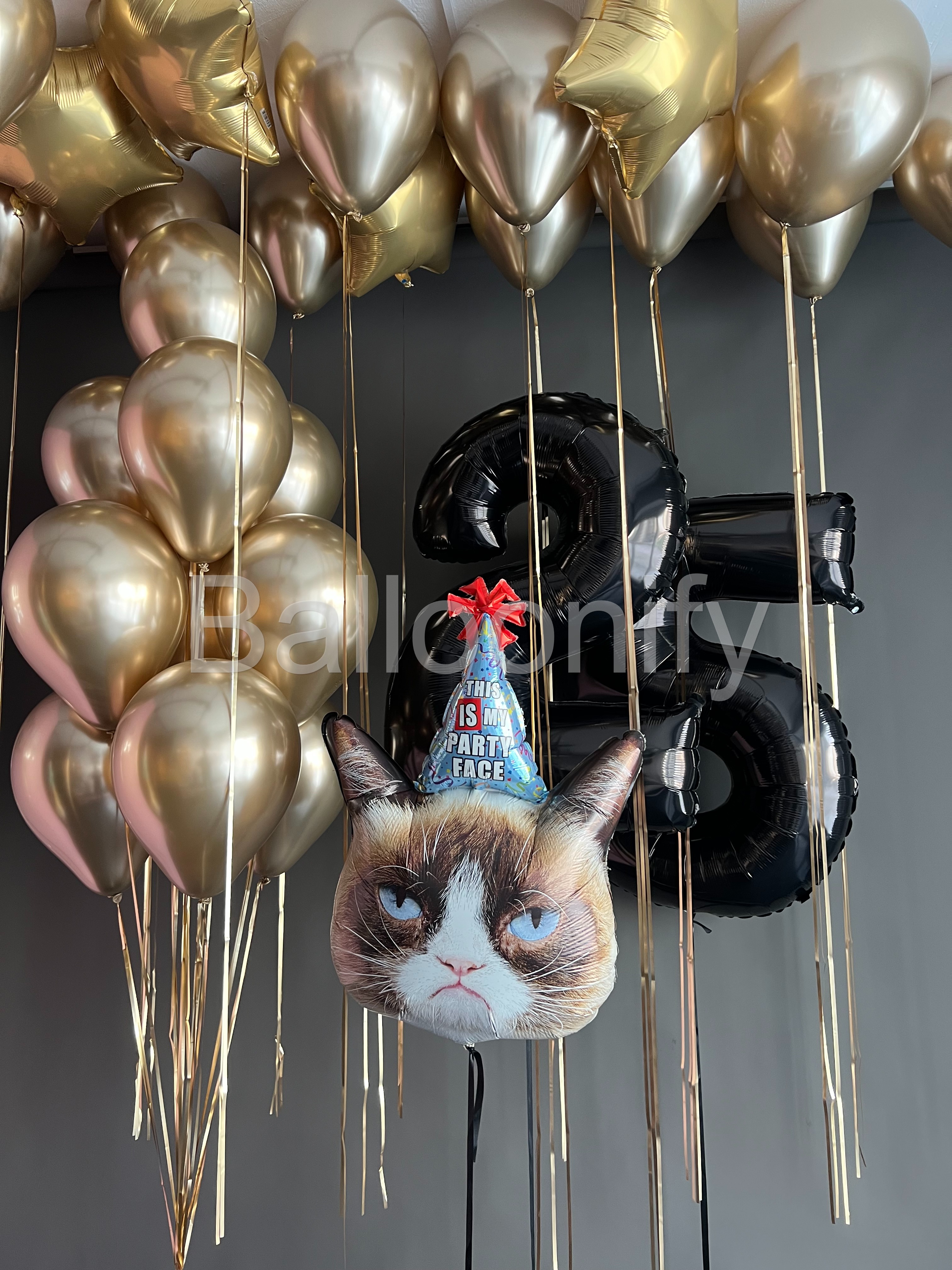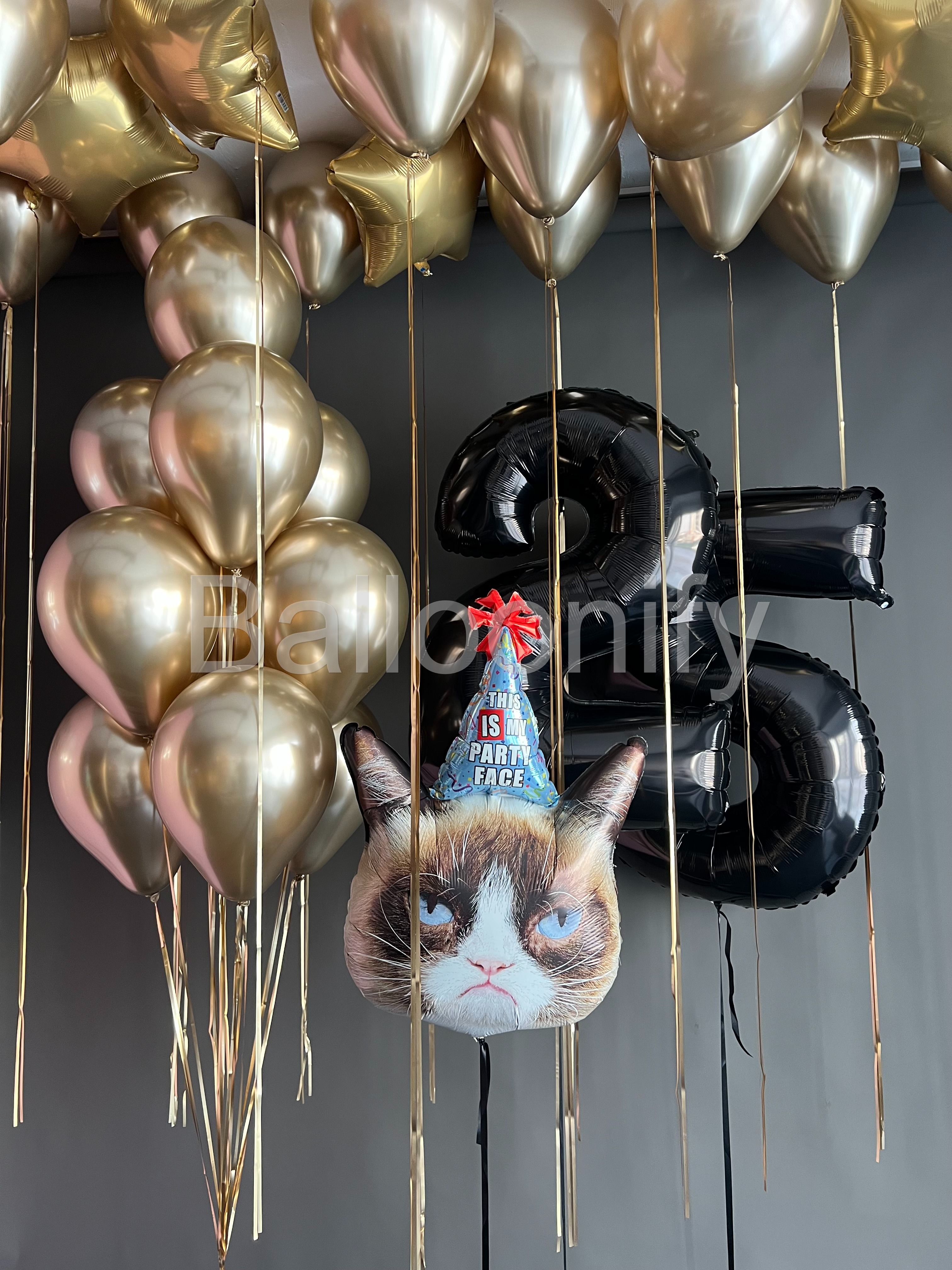Эта изысканная композиция из воздушных шаров идеально сочетает в себе элегантность и весёлую нотку, становясь главным украшением праздничного мероприятия! Центральные элементы композиции — крупные чёрные шары в форме цифр «2» и «5», задающие торжественный тон и обозначающие возраст именинника, а также шар с изображением «сердитого кота» в праздничной шапочке с надписью «This is my party face». Цифры формируют «ядро» оформления, а забавный кот на переднем плане добавляет композиции озорства и служит ярким акцентом, вызывающим улыбку. Вместе они создают гармоничный контраст между элегантностью и юмором, делая композицию запоминающейся. 🌟