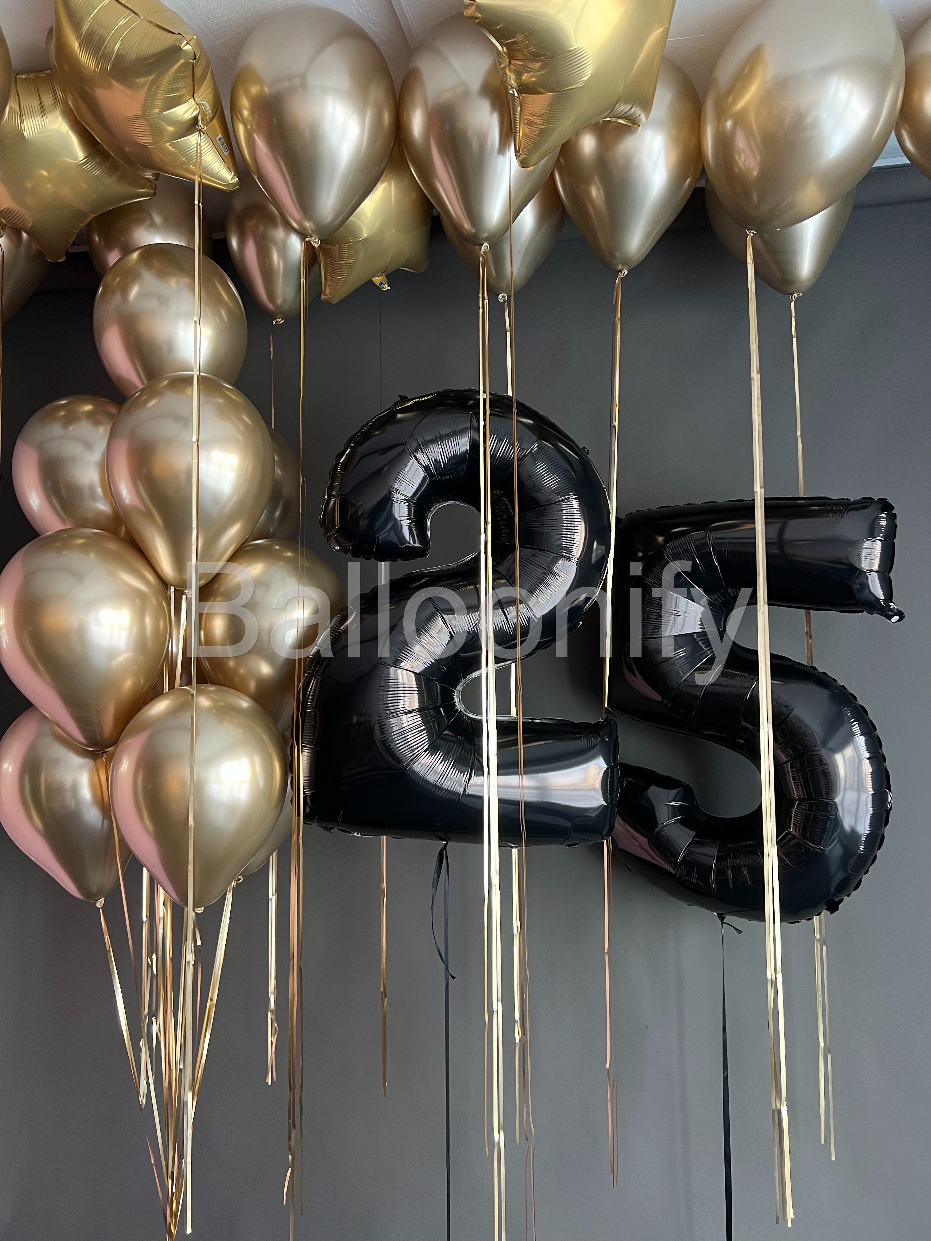 Представляем элегантную композицию из воздушных шаров, оформленная к празднованию 25-летия. Центральным элементом служат крупные чёрные фольгированные шары в виде цифр «2» и «5» — они сразу привлекают внимание, чётко обозначая возраст именинника. Глянцевая поверхность шаров придаёт композиции торжественность и современный стиль. Вокруг цифр располагается пышная композиция из золотисто-хромовых шаров разной формы. Все шары закреплены на длинных лентах, которые свободно свисают, создавая эффект «парения» и визуально вытягивая композицию вверх. 🌟