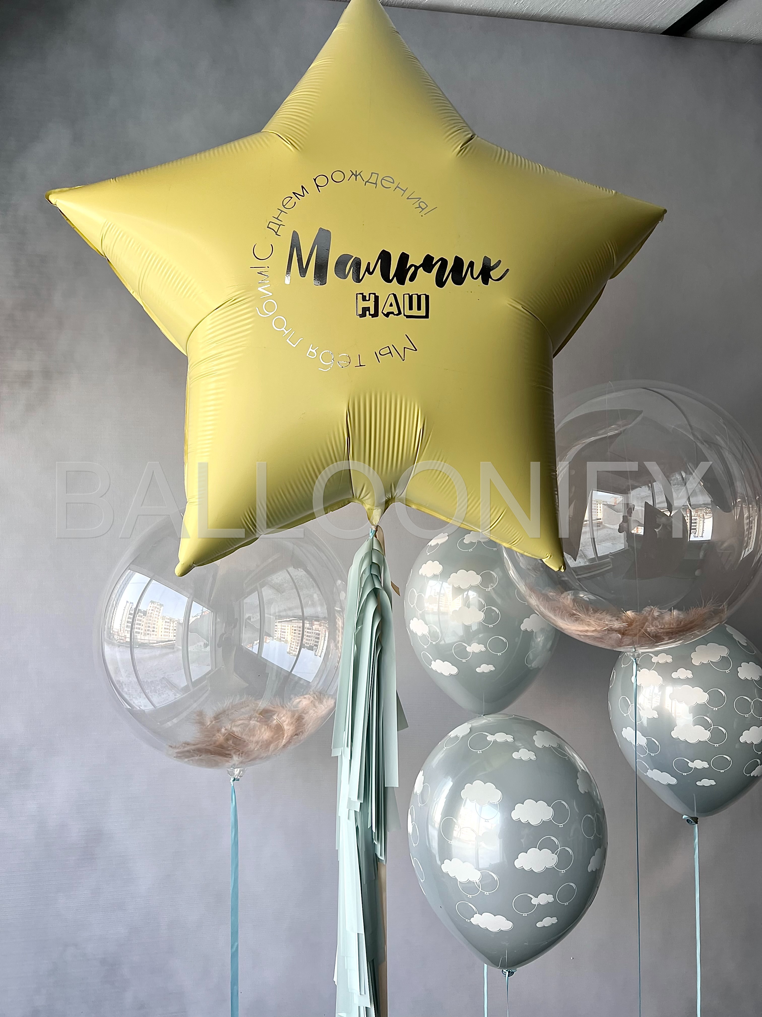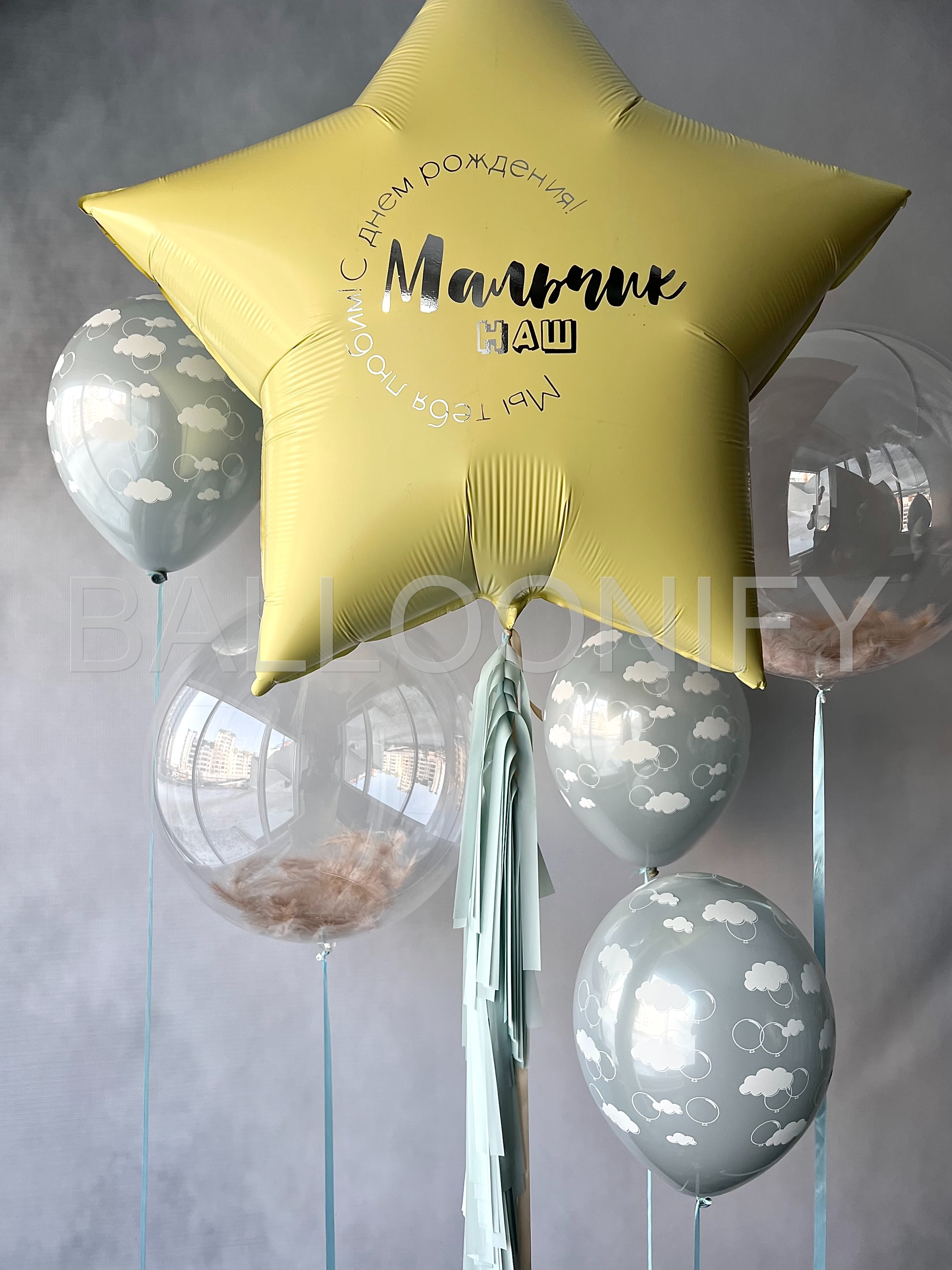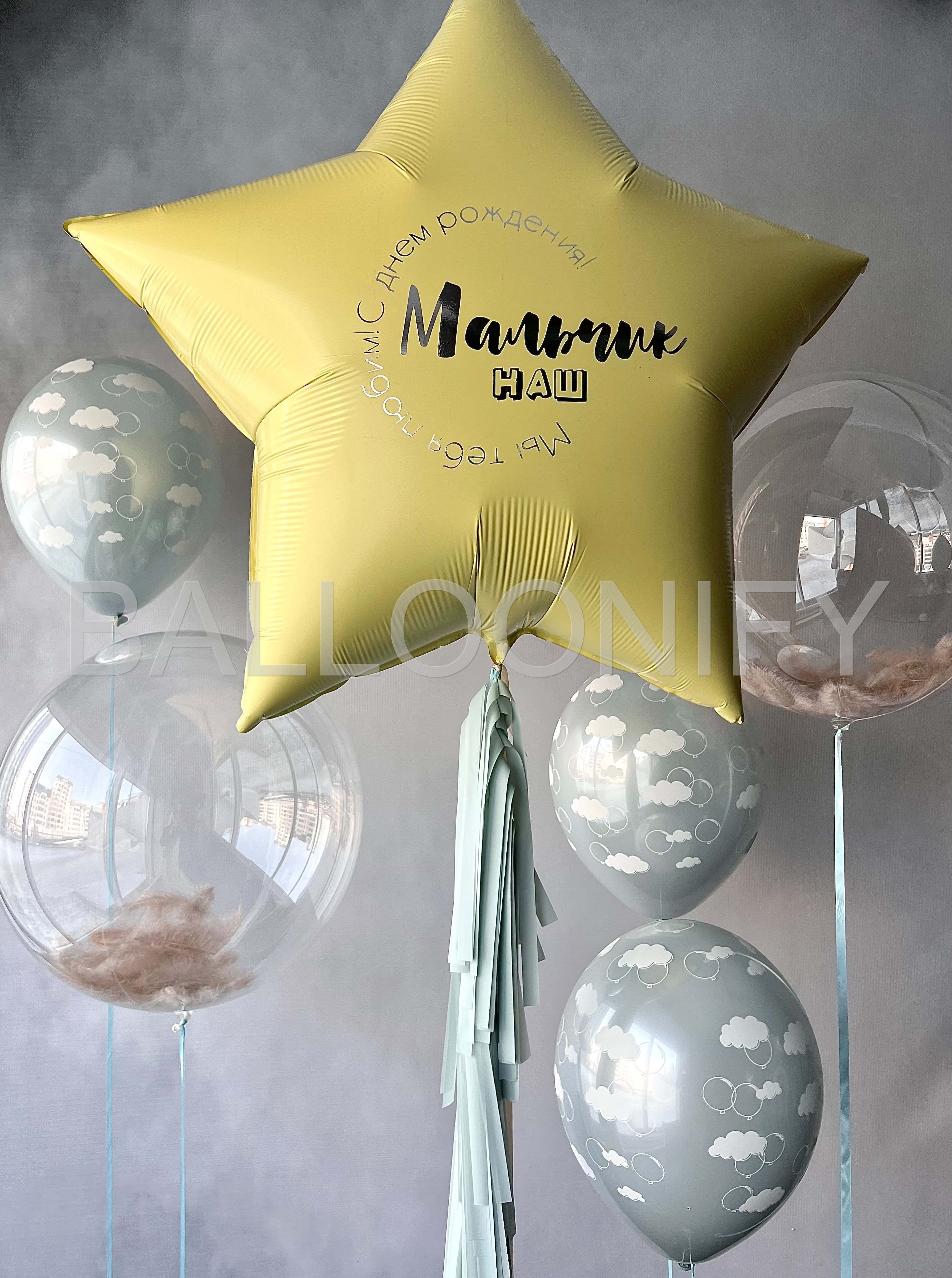 Нежная и стильная композиция из гелиевых шаров для поздравления маленького именинника: в центре — большая фольгированная звезда солнечно-жёлтого цвета с трогательной надписью «С днём рождения! Мальчик наш», дополненная изящной кисточкой пастельного оттенка. Вокруг звезды — полупрозрачные шары с пушистыми наполнителями и серые шары с милым принтом в виде облаков и пузырьков. Гармоничное сочетание цветов и деталей создаёт атмосферу уюта и радости, идеально подойдёт для оформления праздника мальчика! 🌟
