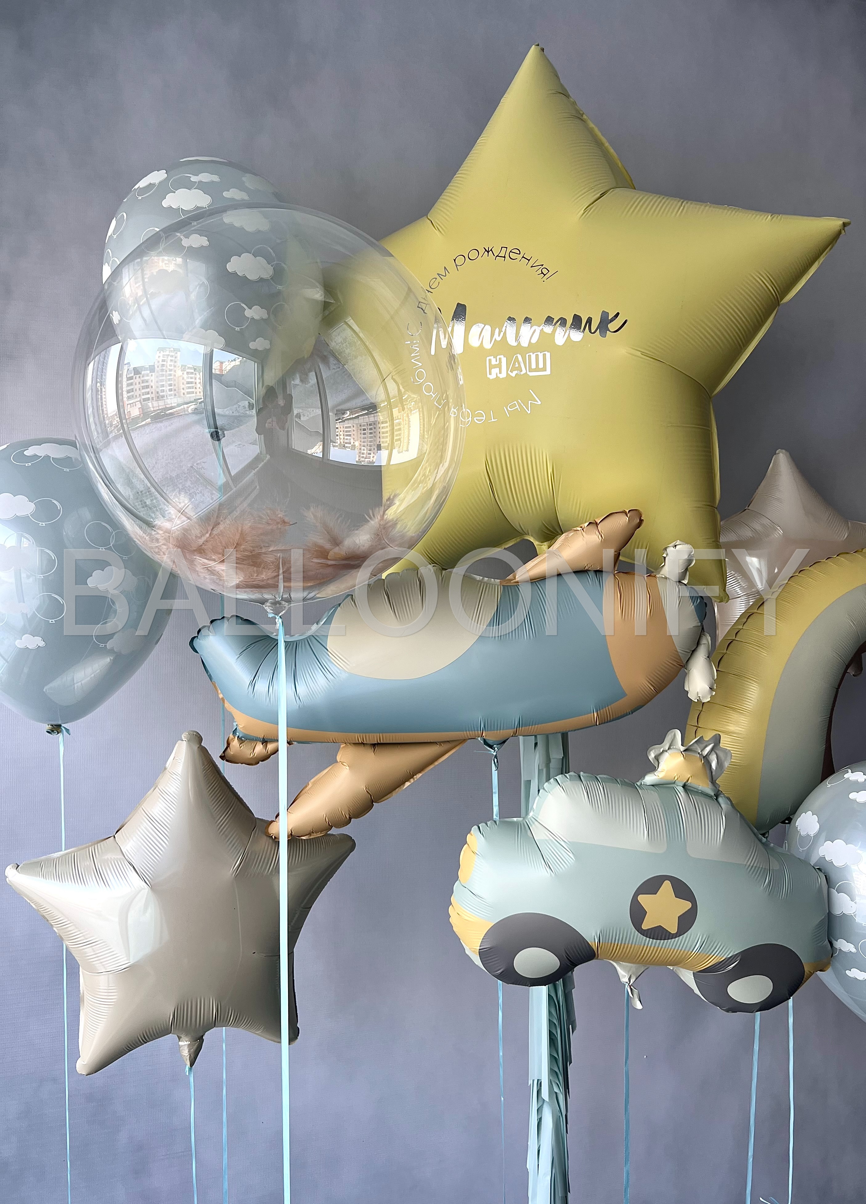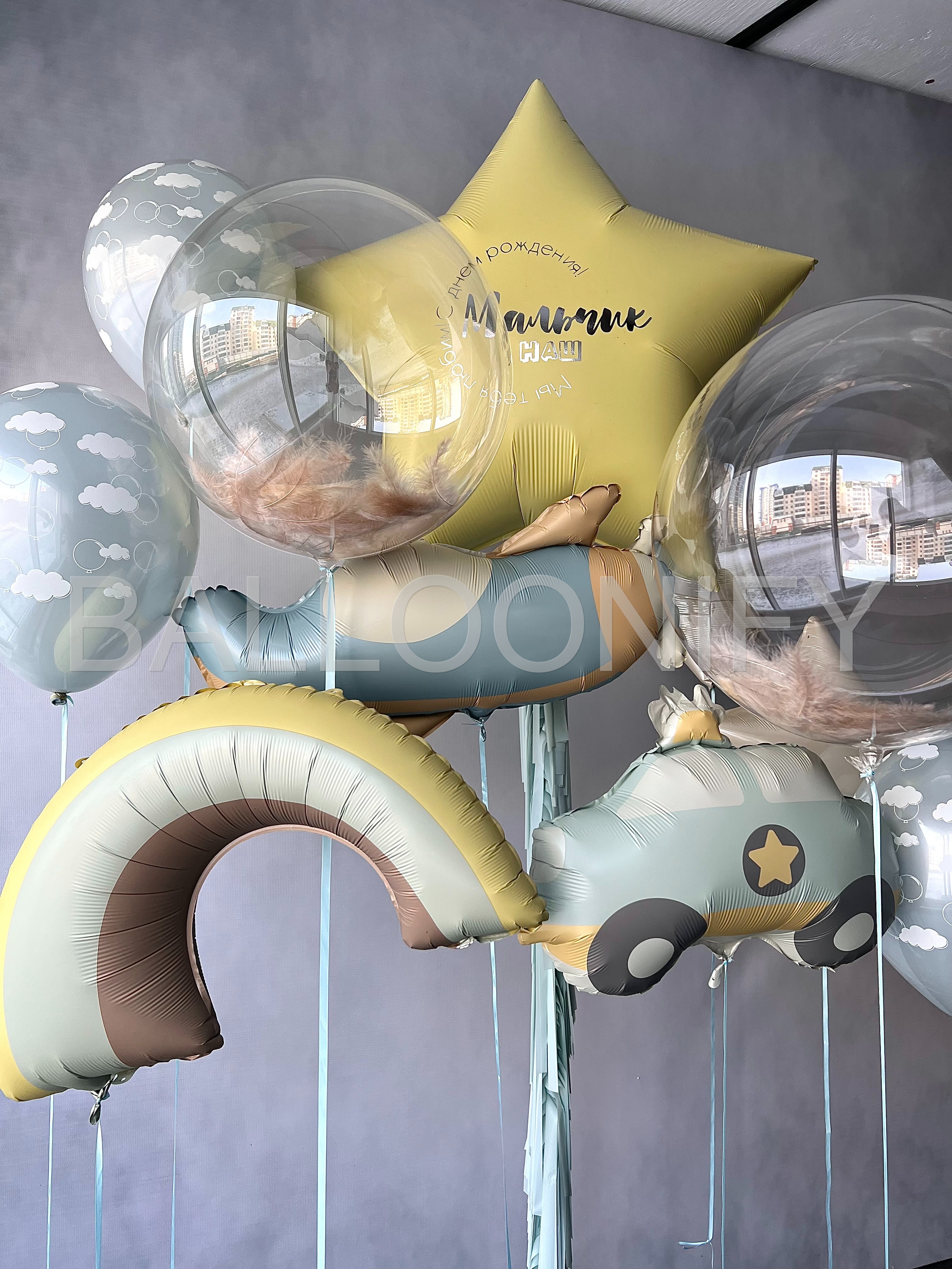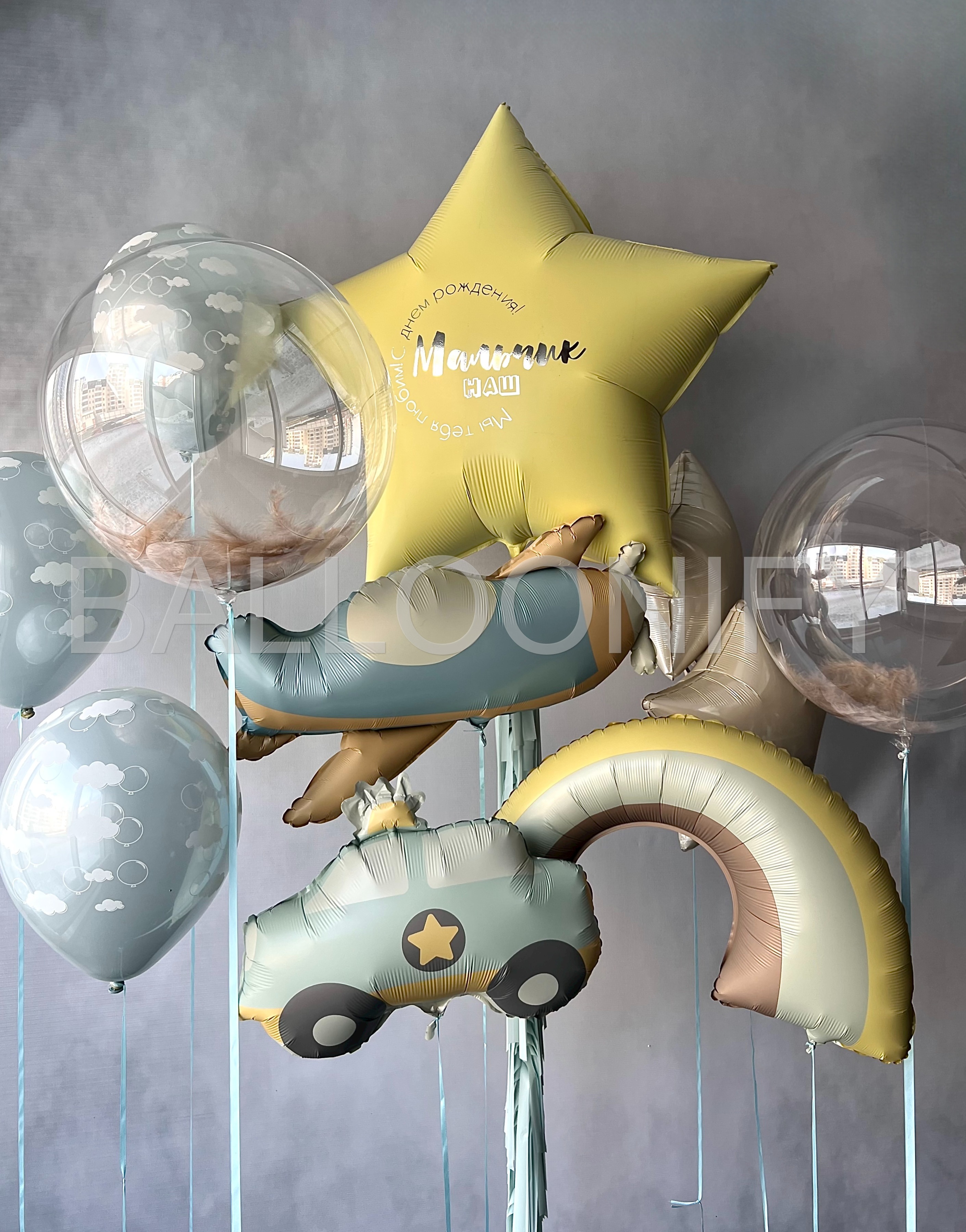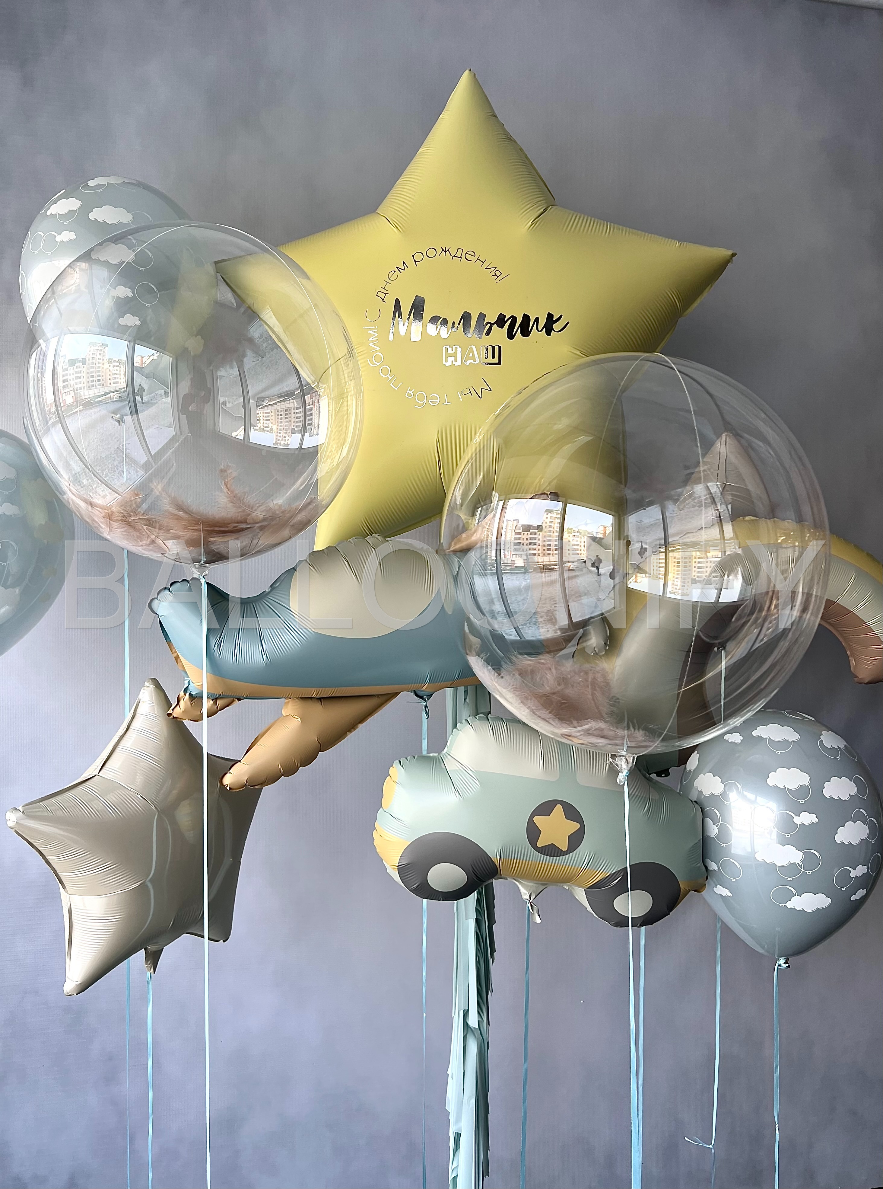 Нежная и яркая композиция из гелиевых шаров для маленького именинника: в центре — большая жёлтая звезда с трогательной надписью «С днём рождения! Мальчик наш», окружённая кремовыми звёздами, прозрачными шарами с пушистыми перьями, шарами с рисунком облаков, а также забавными фигурами — самолётом и машинкой в пастельных тонах. Гармоничное сочетание форм и оттенков создаёт атмосферу радости и волшебства, идеально дополняя праздник мальчика! 🌟
