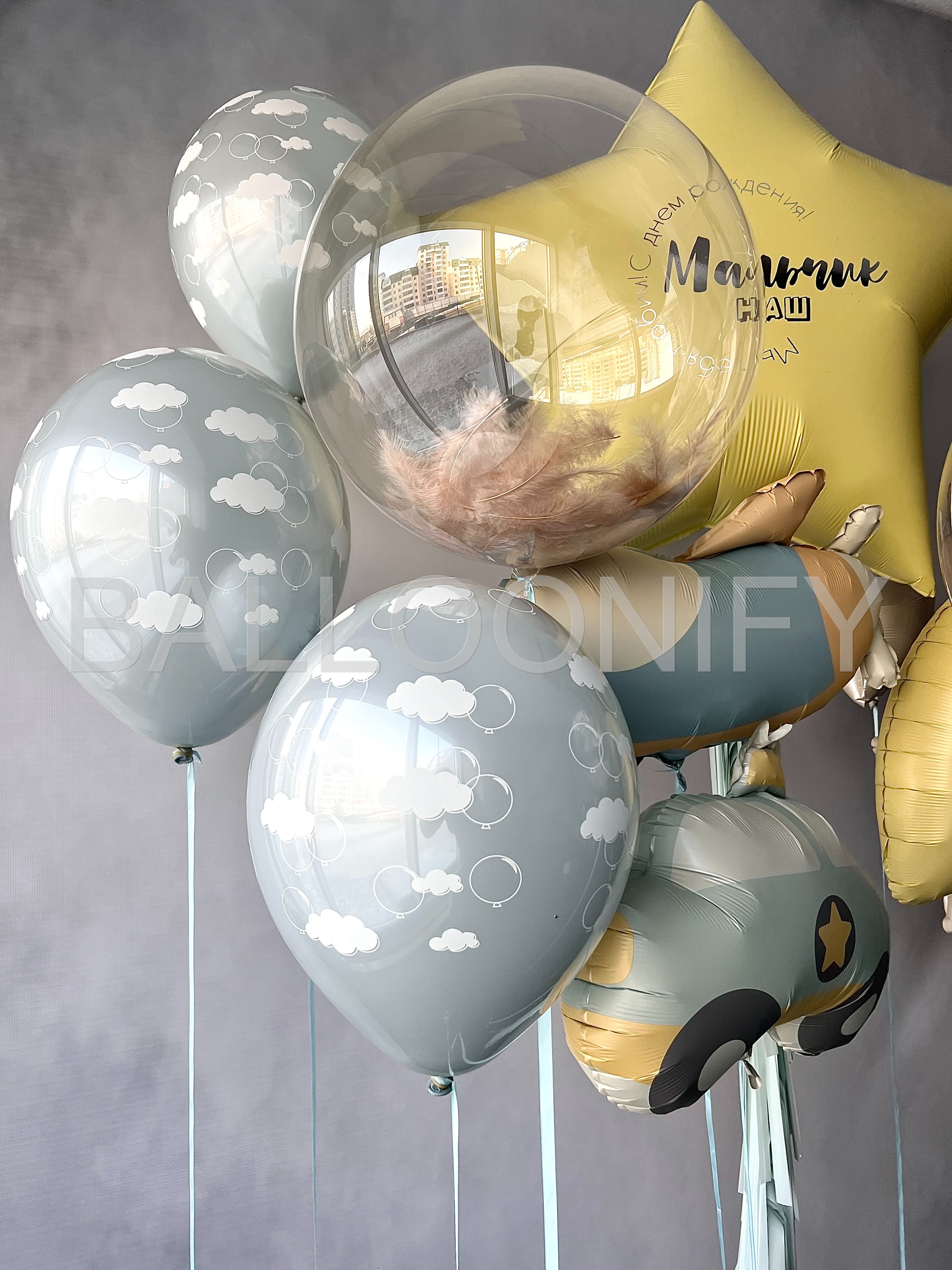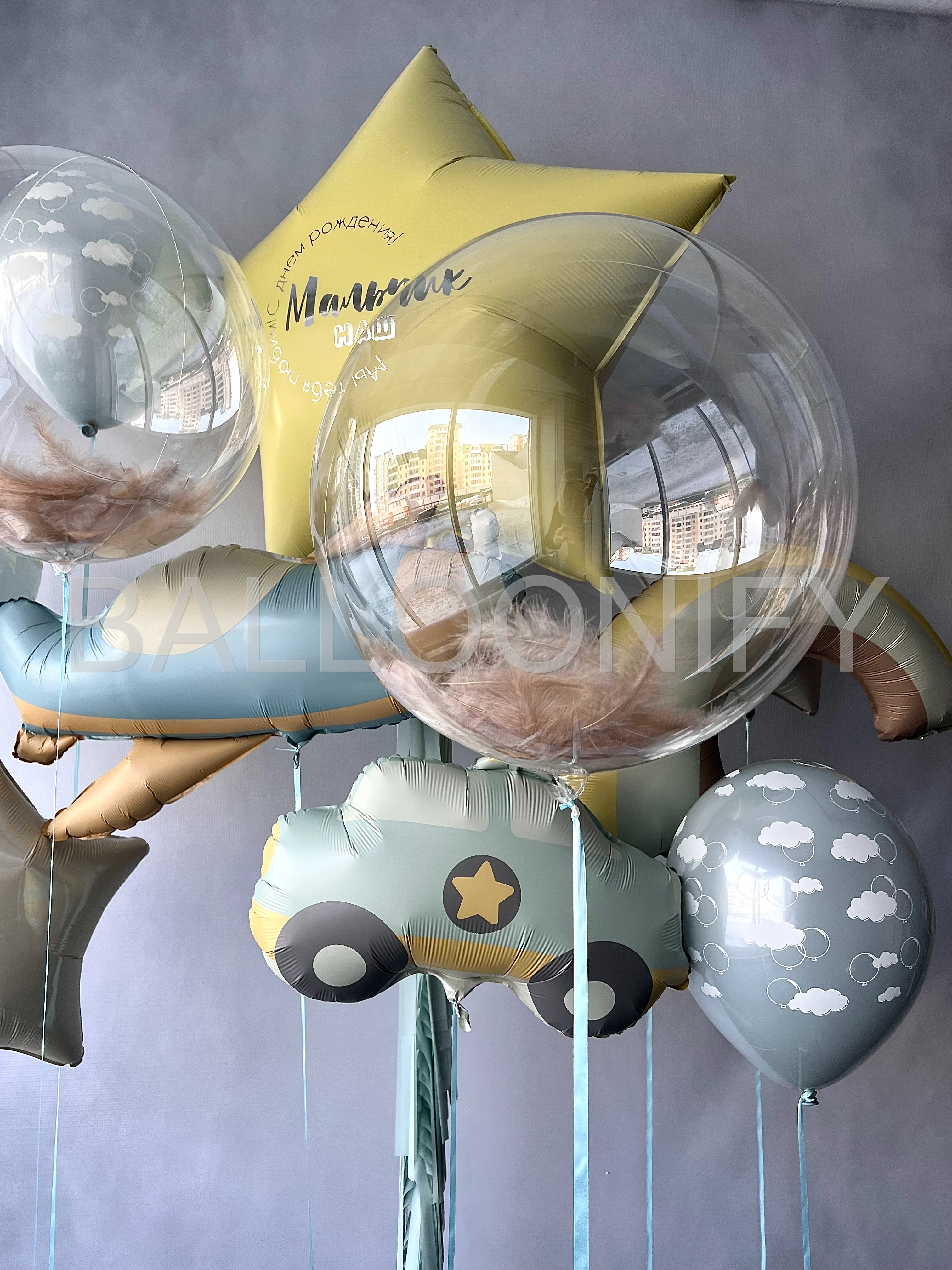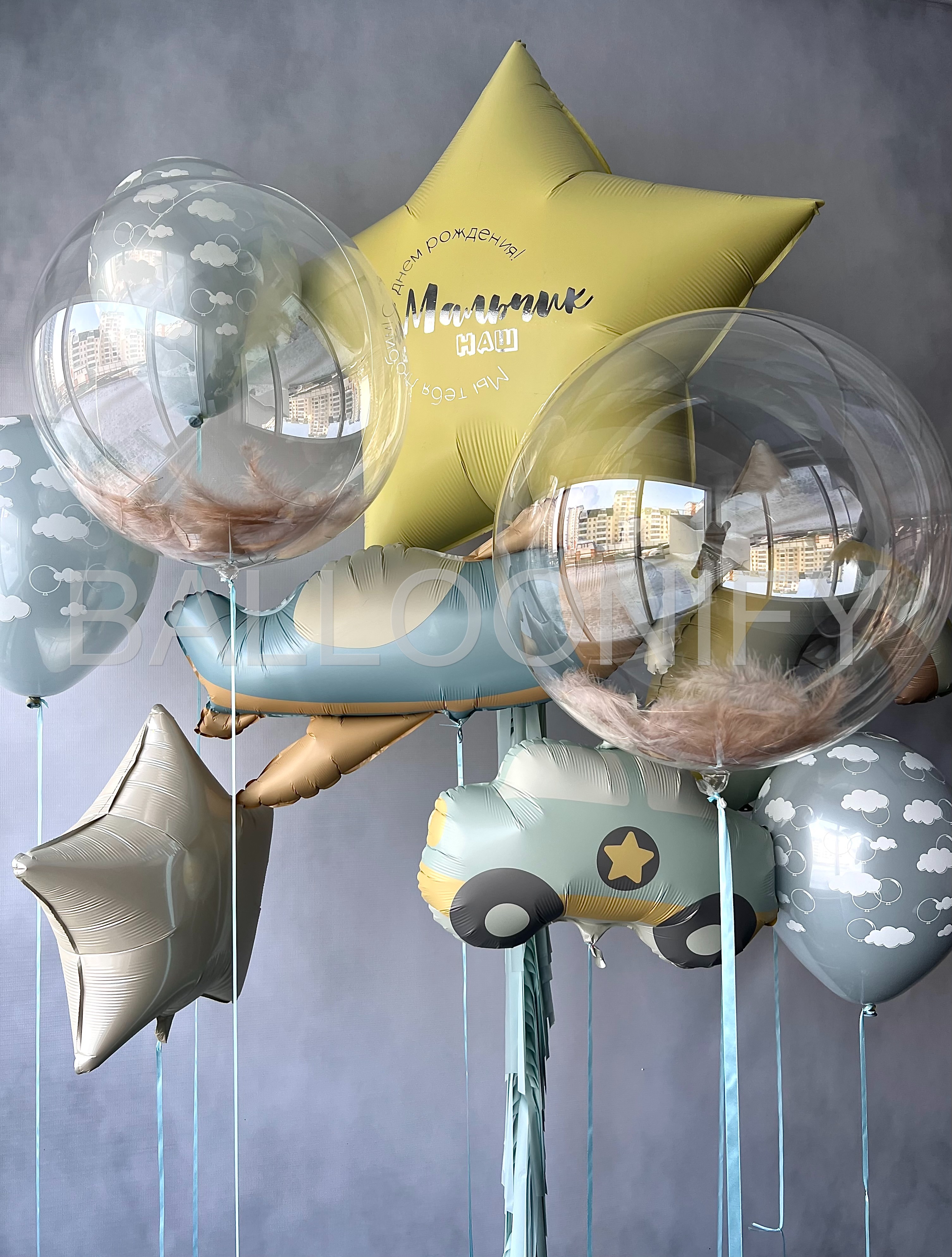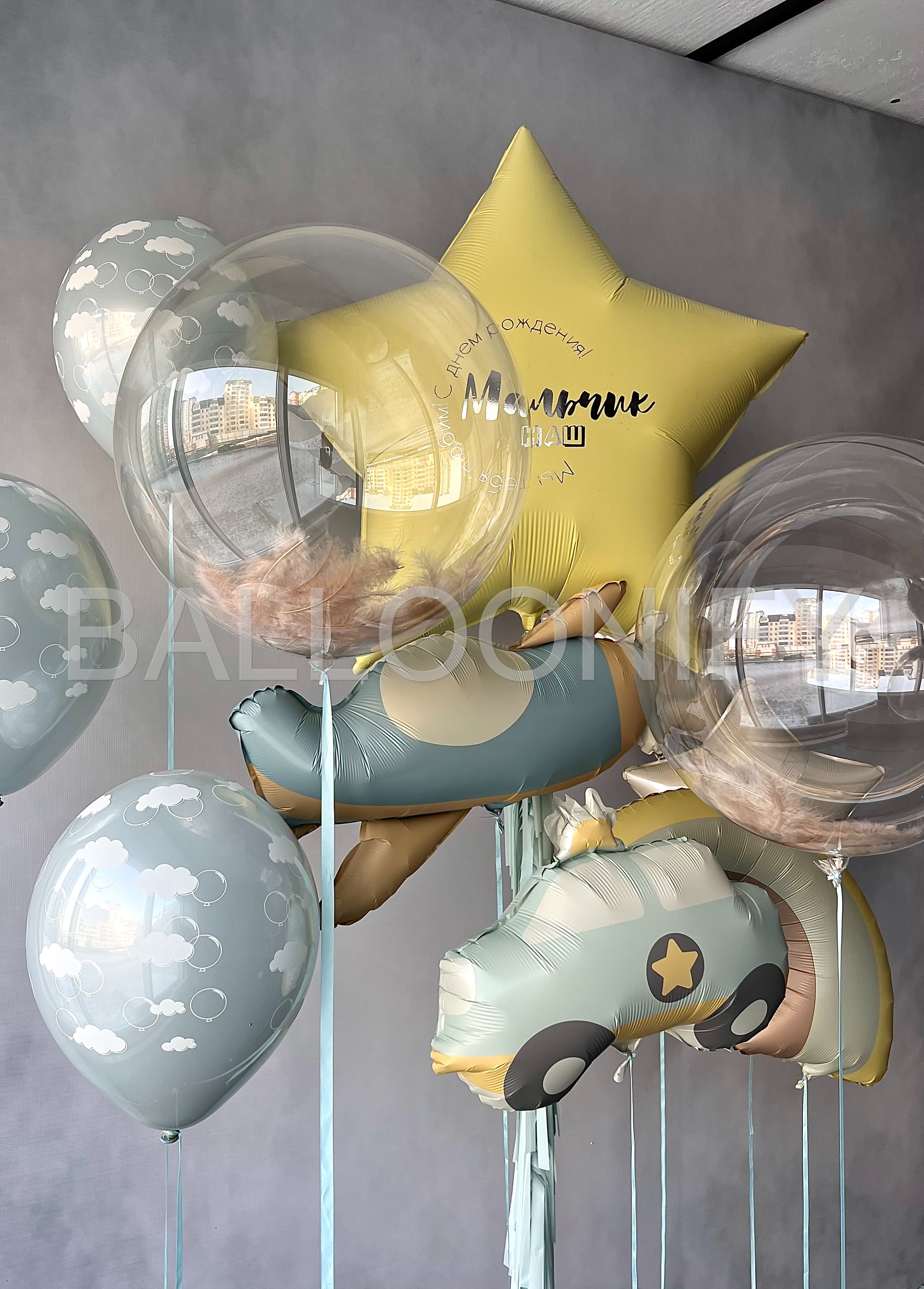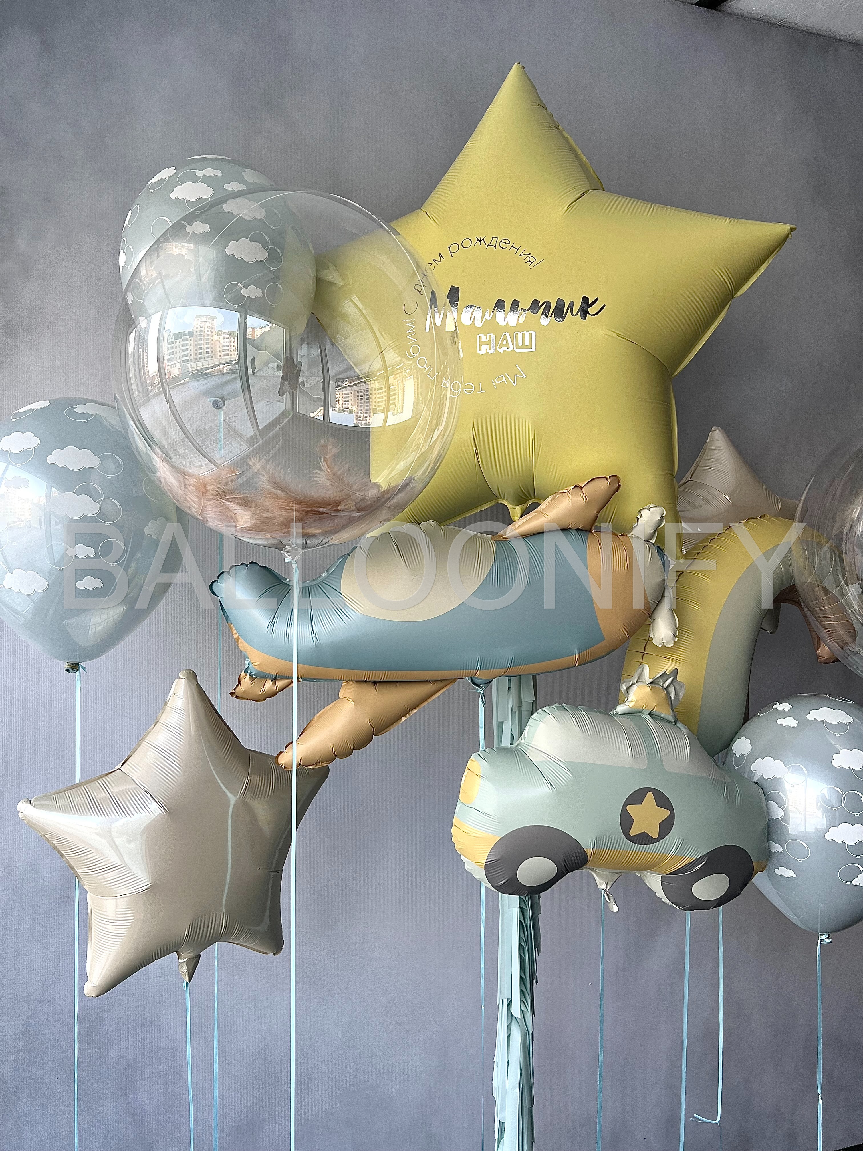 Нежная и яркая композиция из гелиевых шаров для маленького именинника: в центре — большая жёлтая звезда с трогательной надписью «С днём рождения! Мальчик наш», окружённая кремовыми звёздами, прозрачными шарами с пушистыми перьями, шарами с рисунком облаков, а также забавными фигурами — самолётом и машинкой в пастельных тонах. Гармоничное сочетание форм и оттенков создаёт атмосферу радости и волшебства, идеально дополняя праздник мальчика! 🌟
