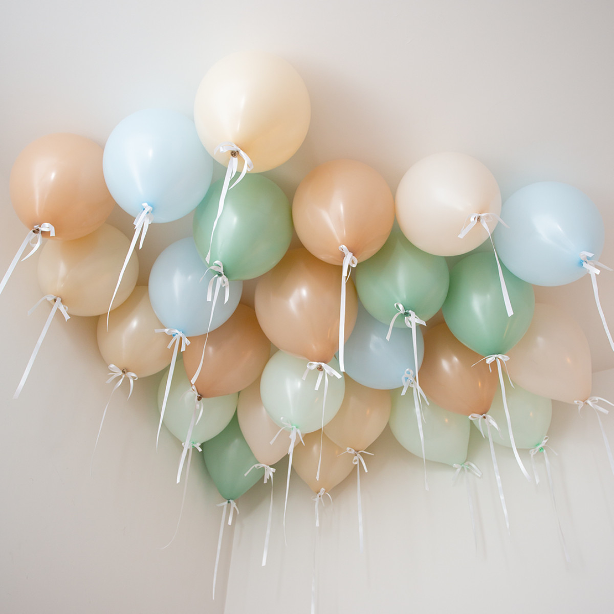 Нежная композиция из воздушных шаров в пастельных оттенках — идеальный способ украсить любой праздник! Мягкие тона мятного, бежевого, кремового и голубого создают лёгкую, романтичную атмосферу. Шары наполнены гелием и украшены изящными белыми лентами, которые добавляют композиции воздушности.