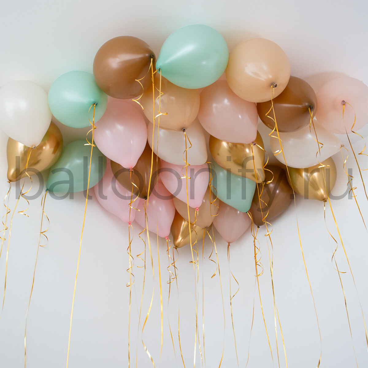 Композиция из воздушных шаров, размещённая под потолком, формирует праздничную и уютную атмосферу за счёт гармоничного сочетания пастельных оттенков: нежно-розового, карамельного и мятного. Такая цветовая гамма отлично дополняет зимние мероприятия, детские праздники и дни рождения, придавая пространству изысканность и теплоту.