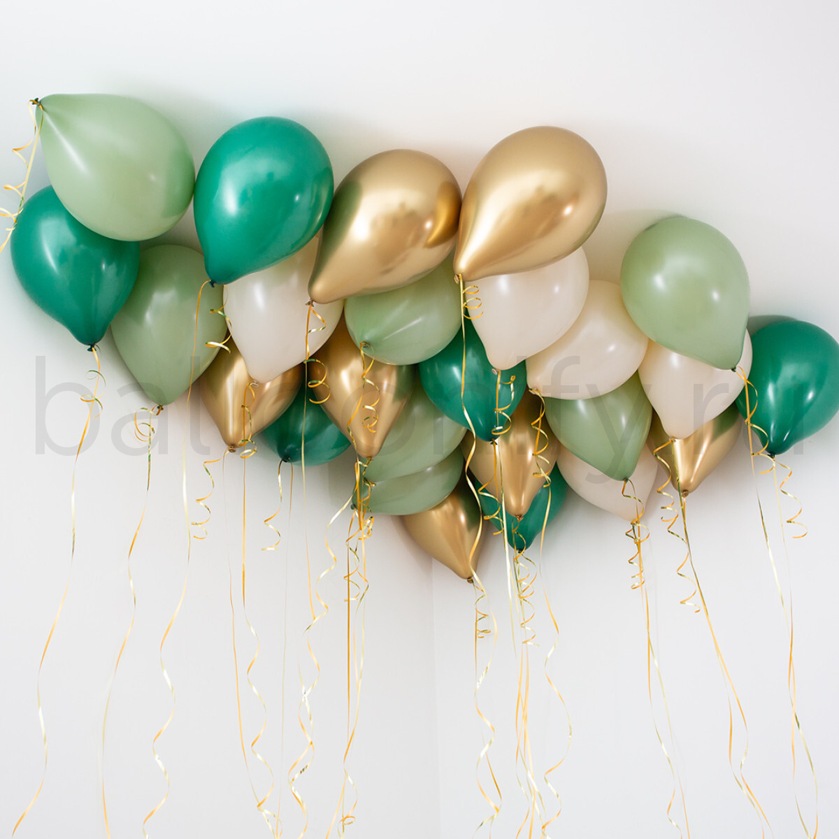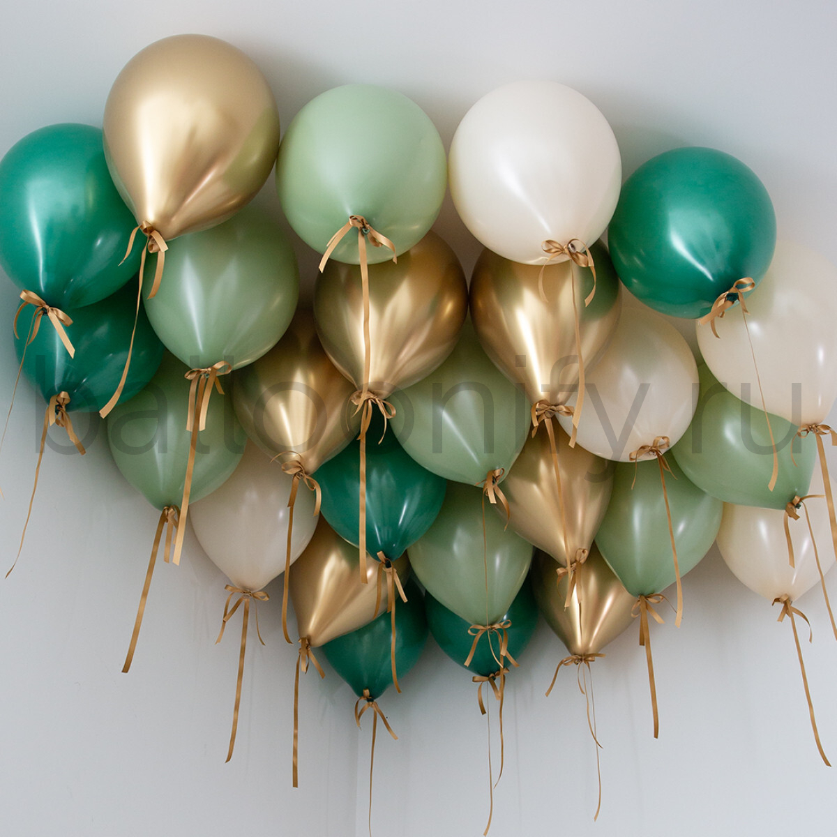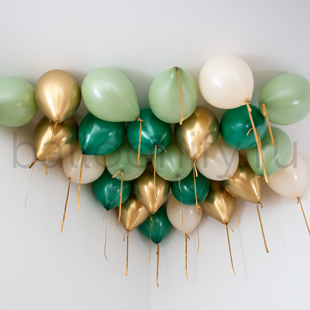 Воздушные шары под потолком в коллекции «Изумрудное золото» — стильное решение для оформления праздничных событий. Сочетание зелёных и золотых оттенков создаёт ощущение природной гармонии и свежести.