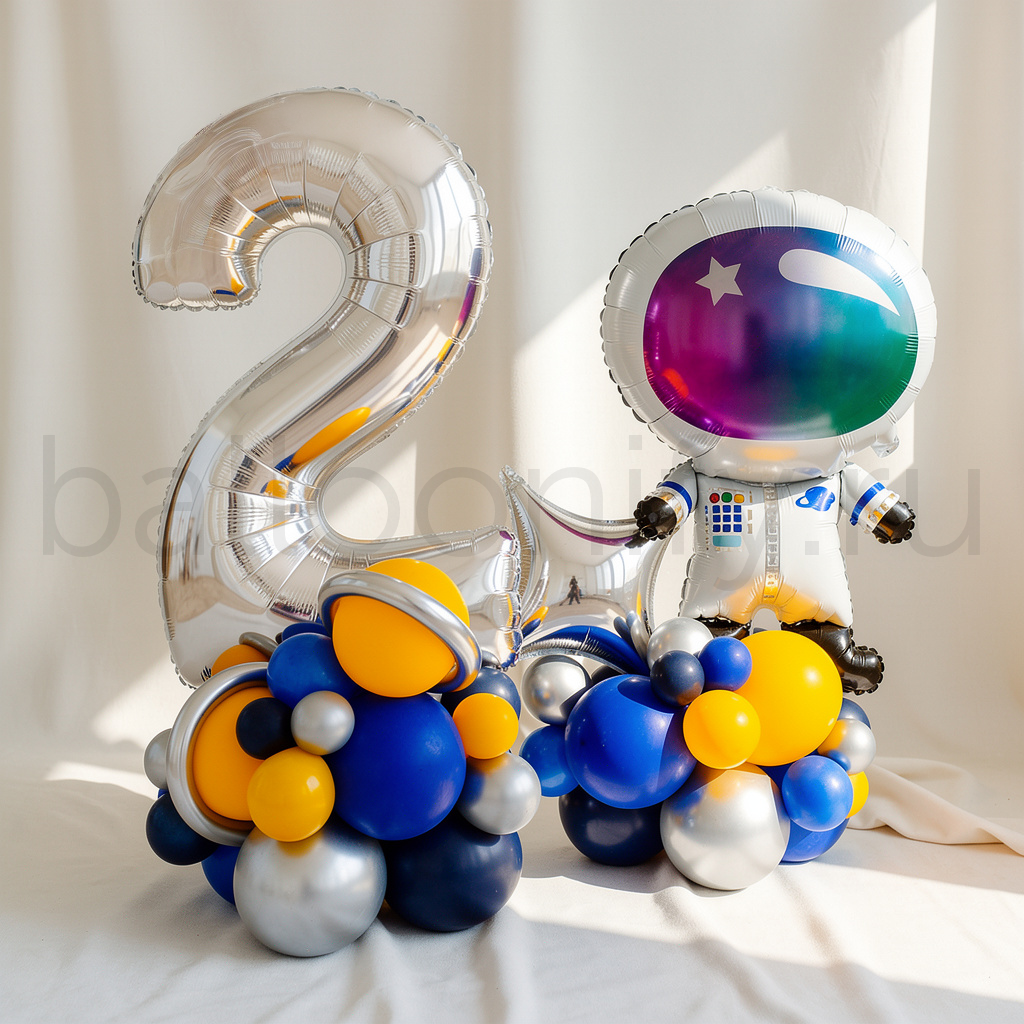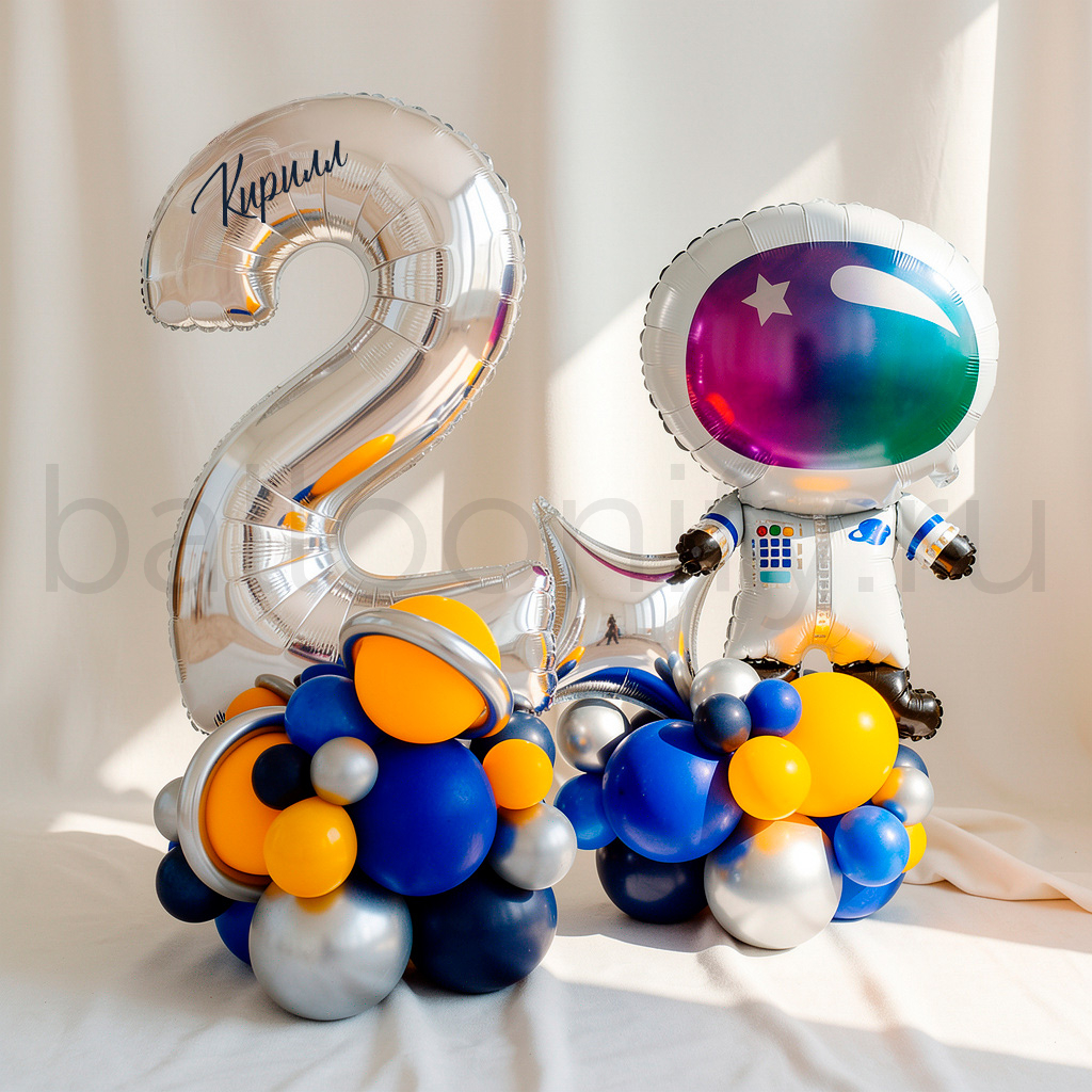 Превратите день рождения вашего ребёнка в увлекательное путешествие по галактике с помощью потрясающей плетеной композиции с цифрой и фигурой из воздушных шаров в космической тематике!