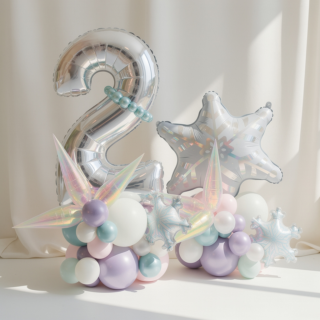 Эта изысканная композиция из воздушных шаров с цифрой и фигурой Снежинки создаст волшебную атмосферу на любом зимнем празднике — будь то день рождения, бэби-шауэр или тематическая вечеринка.